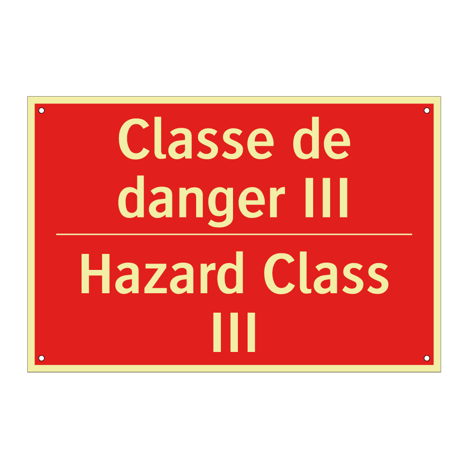 Panneau de signalisation incendie bilingue avec texte en français : "Classe de danger III", et en anglais : "Hazard Class III"