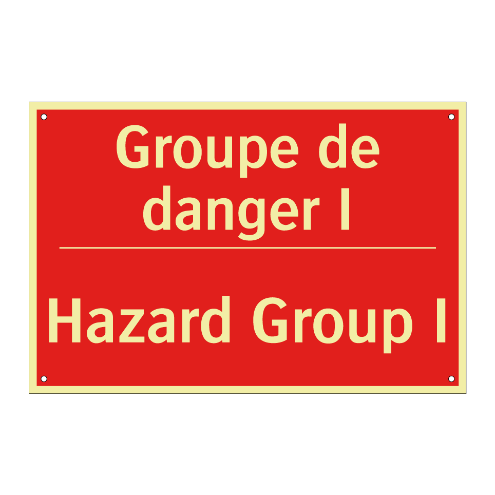 Panneau de signalisation incendie bilingue avec texte en français : "Groupe de danger I", et en anglais : "Hazard Group I"