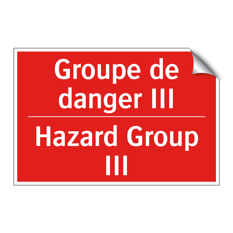 Panneau de signalisation incendie bilingue avec texte en français : "Groupe de danger III", et en anglais : "Hazard Group III"