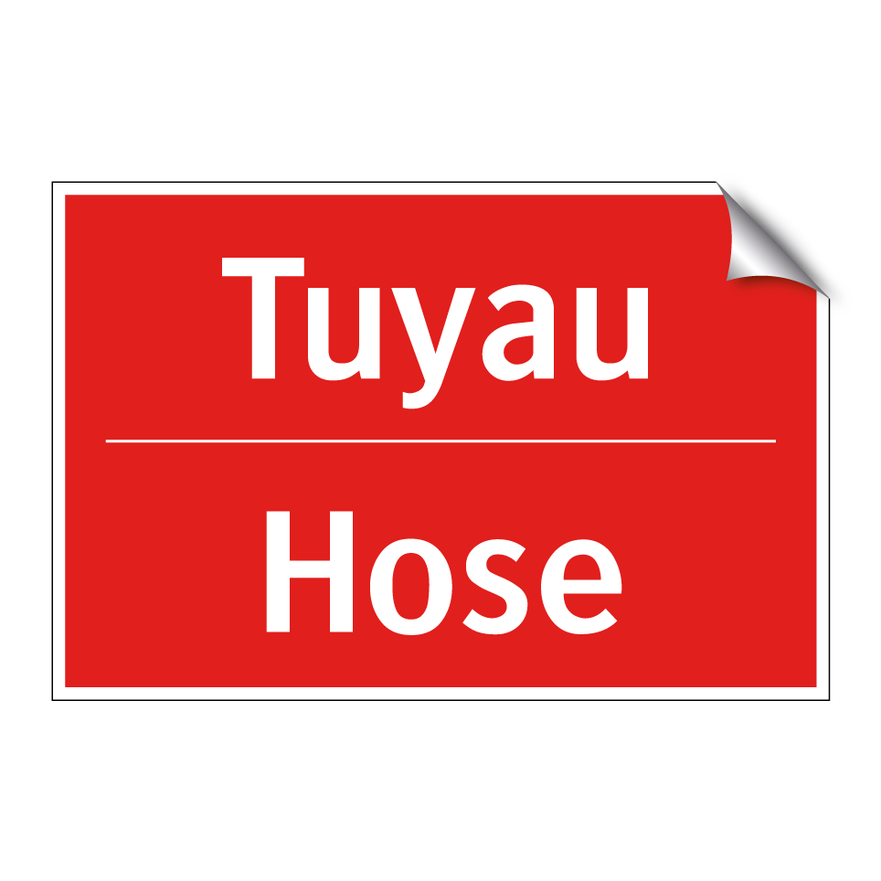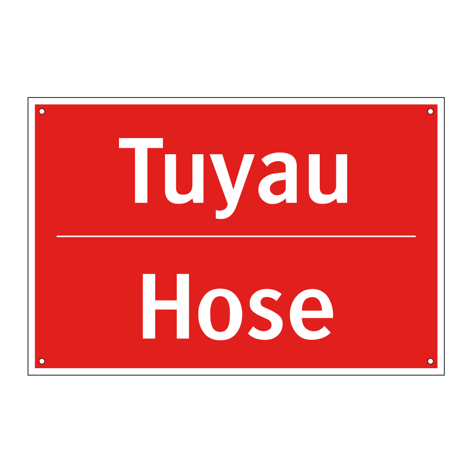 Panneau de signalisation incendie bilingue avec texte en français : "Tuyau", et en anglais : "Hose"