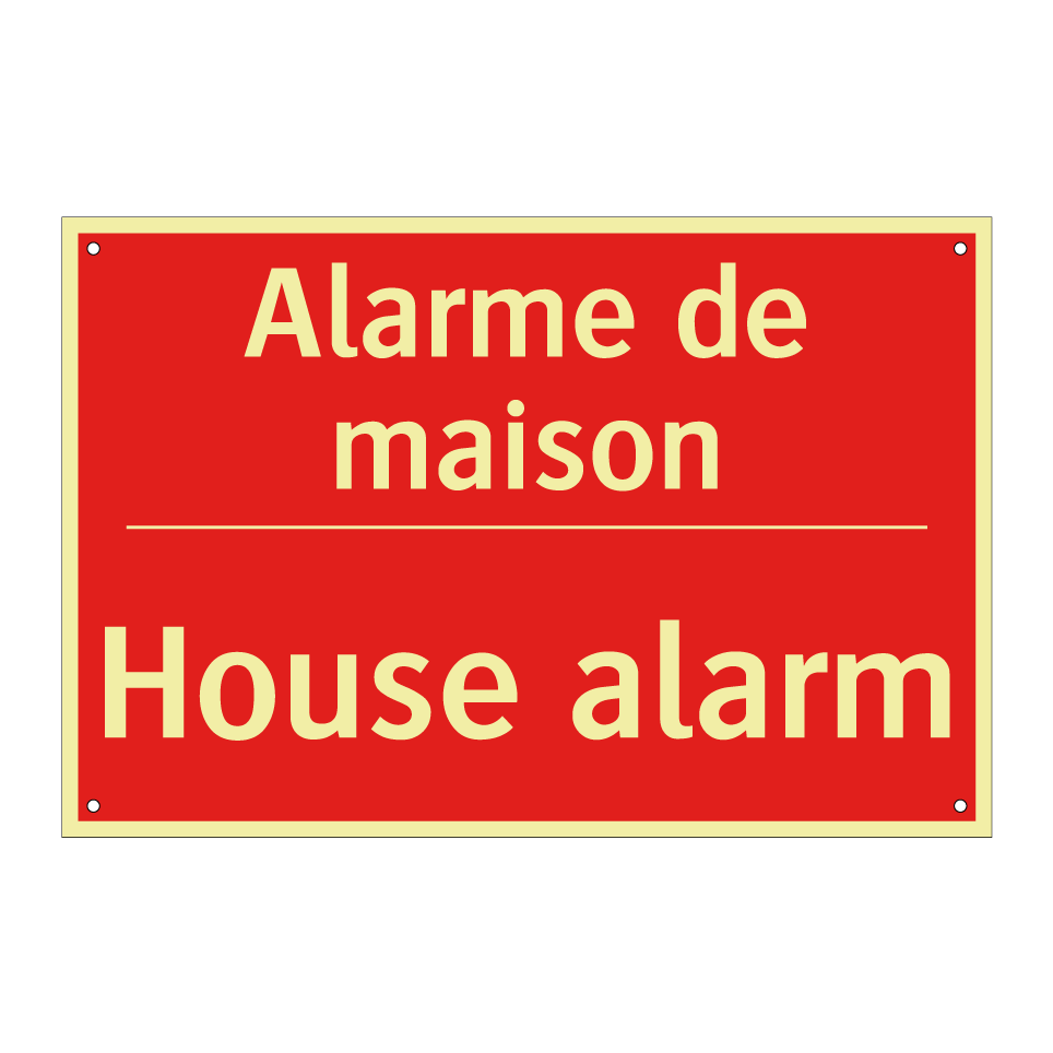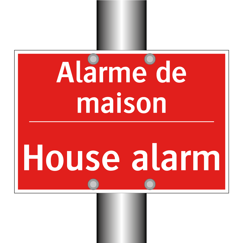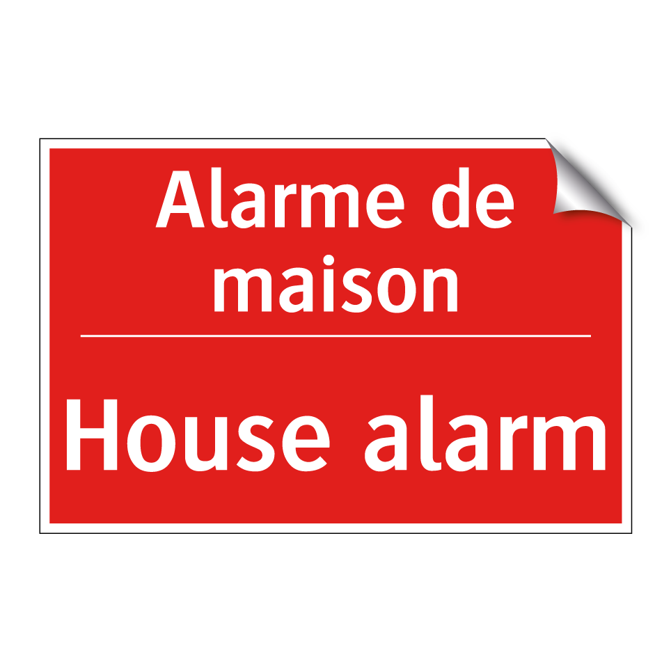 Panneau de signalisation incendie bilingue avec texte en français : "Alarme de maison", et en anglais : "House alarm"