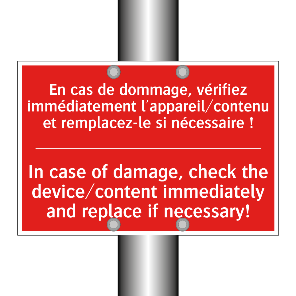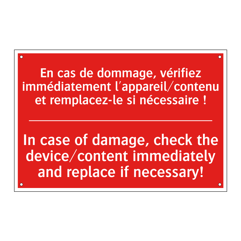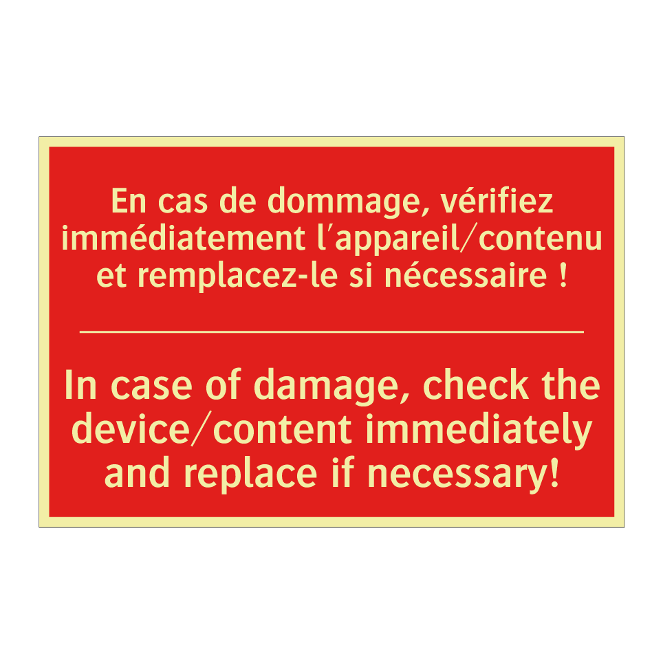 Panneau de signalisation incendie bilingue avec texte en français : "En cas de dommage, vérifiez immédiatement l'appareil/contenu et remplacez-le si nécessaire !", et en anglais : "In case of damage, check the device/content immediately and replace if necessary!"