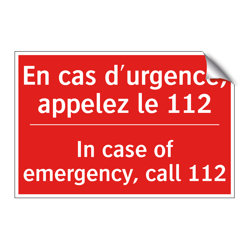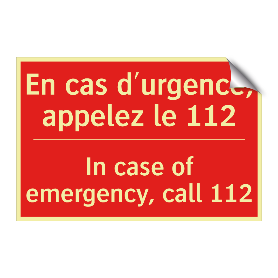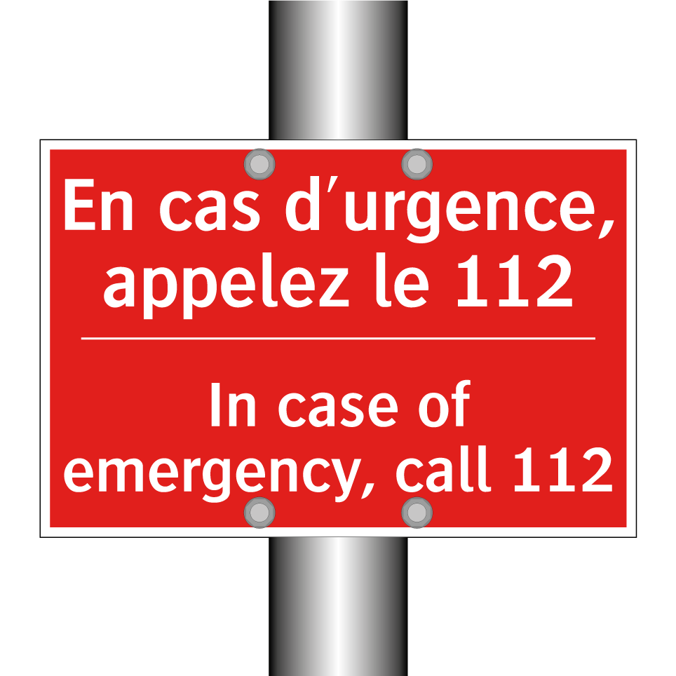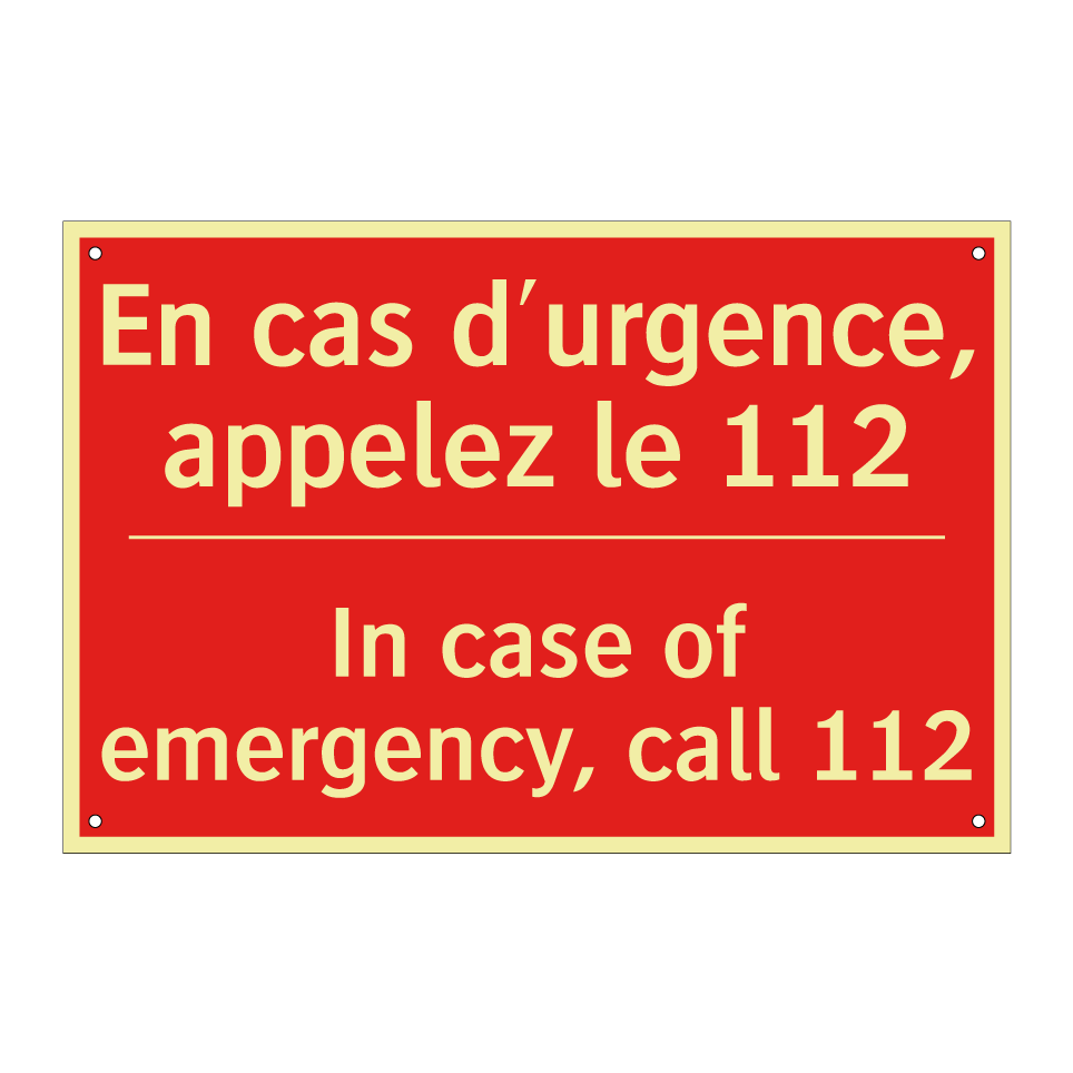 Panneau de signalisation incendie bilingue avec texte en français : "En cas d'urgence, appelez le 112", et en anglais : "In case of emergency, call 112"