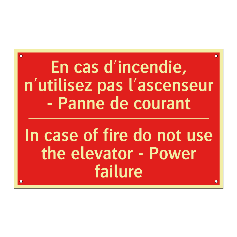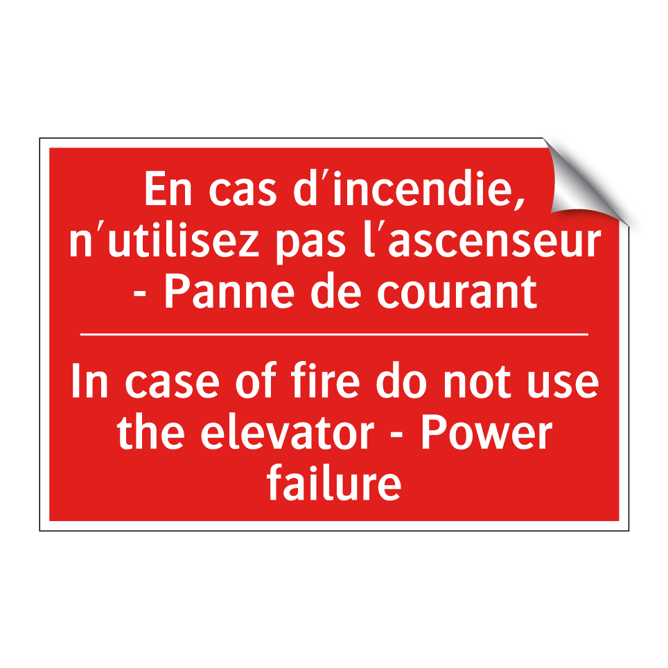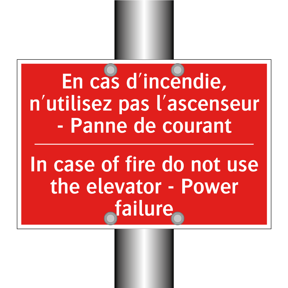 Panneau de signalisation incendie bilingue avec texte en français : "En cas d'incendie, n'utilisez pas l'ascenseur - Panne de courant", et en anglais : "In case of fire do not use the elevator - Power failure"