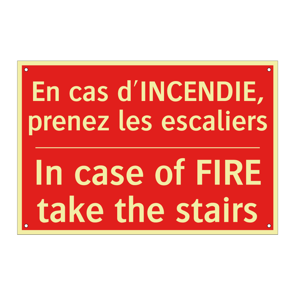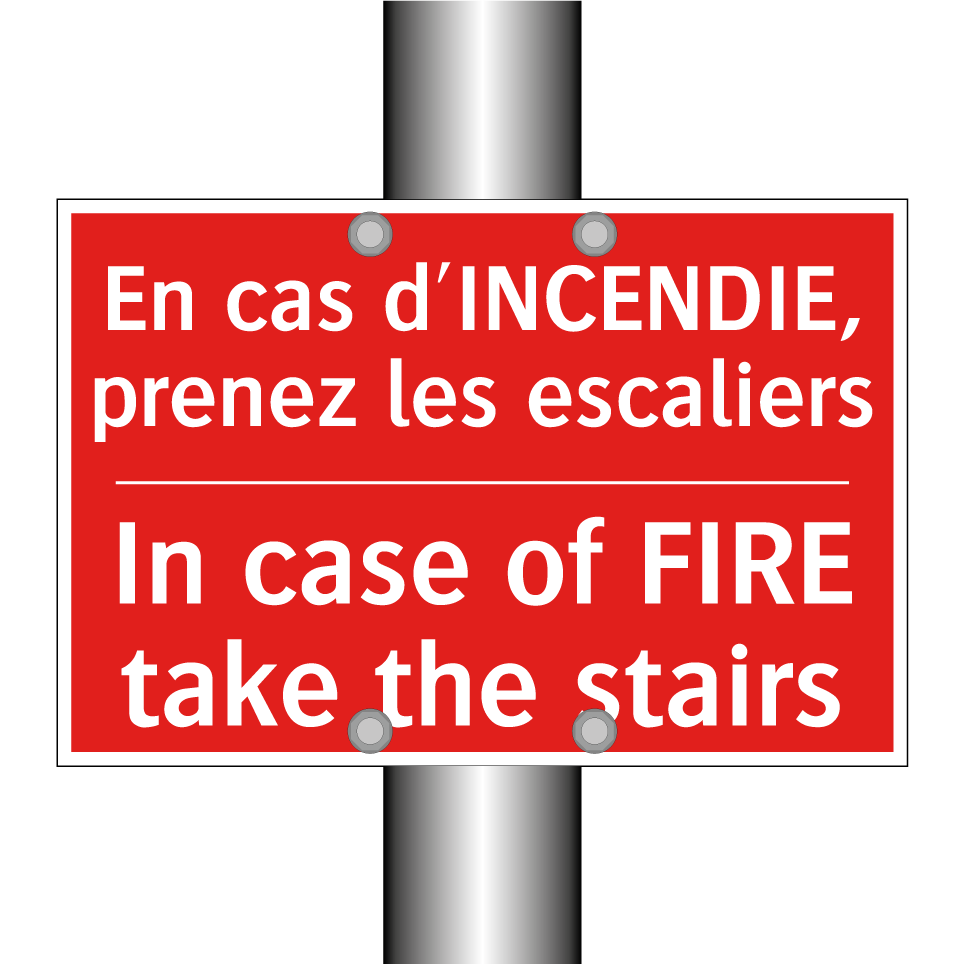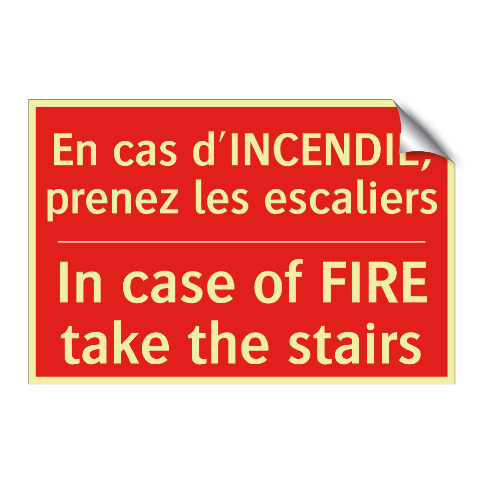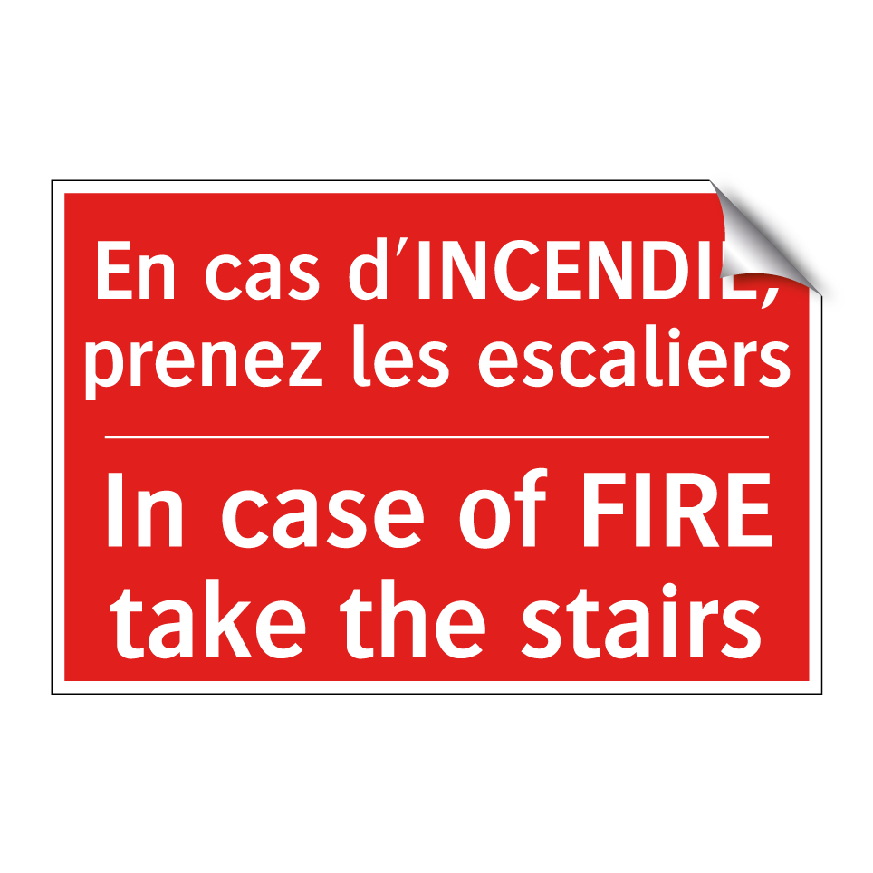 Panneau de signalisation incendie bilingue avec texte en français : "En cas d'INCENDIE, prenez les escaliers", et en anglais : "In case of FIRE take the stairs"
