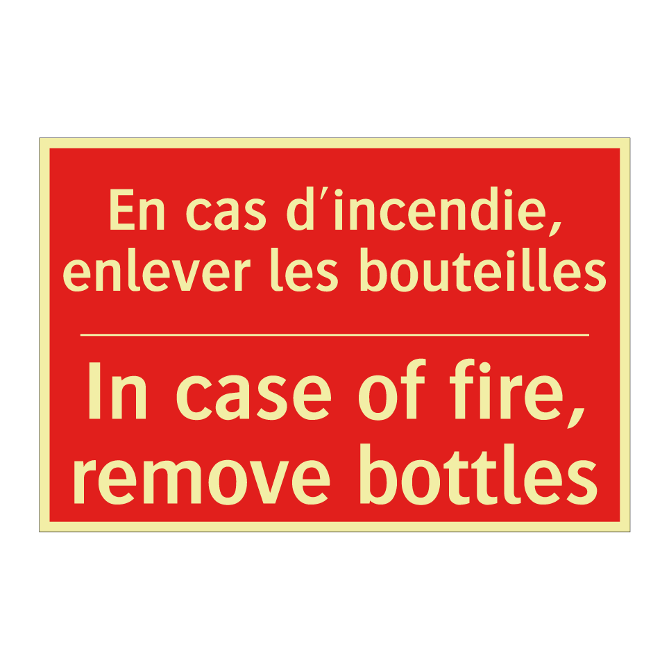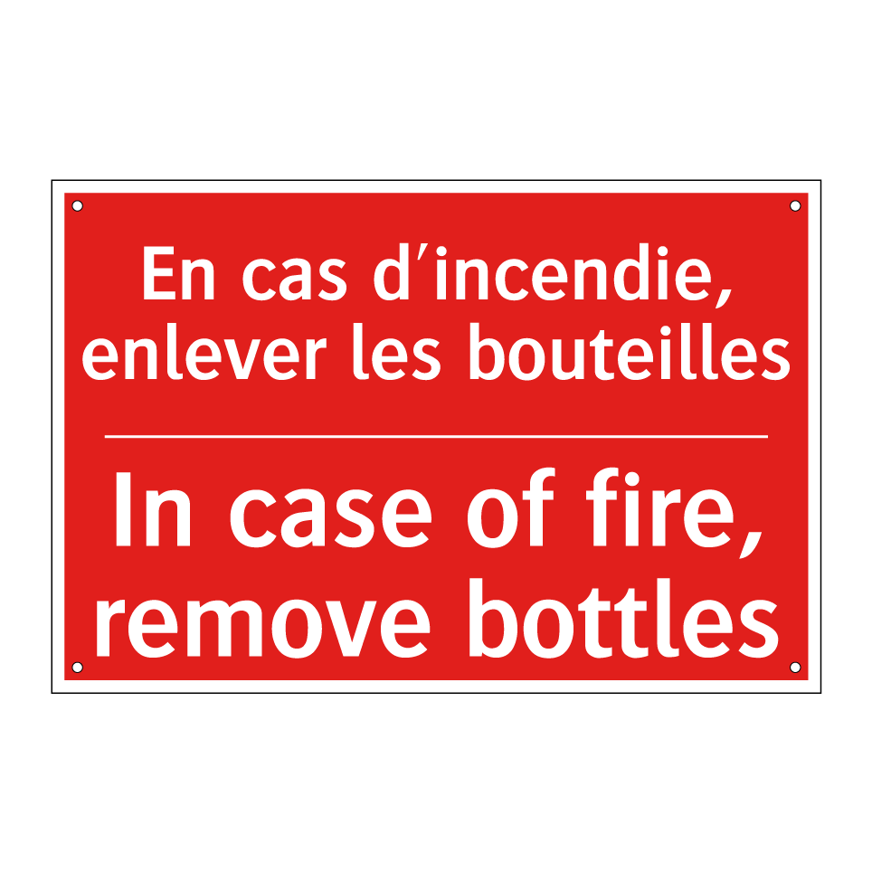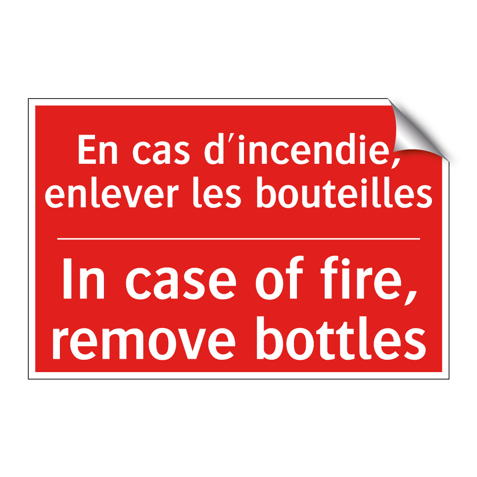 Panneau de signalisation incendie bilingue avec texte en français : "En cas d'incendie, enlever les bouteilles", et en anglais : "In case of fire, remove bottles"
