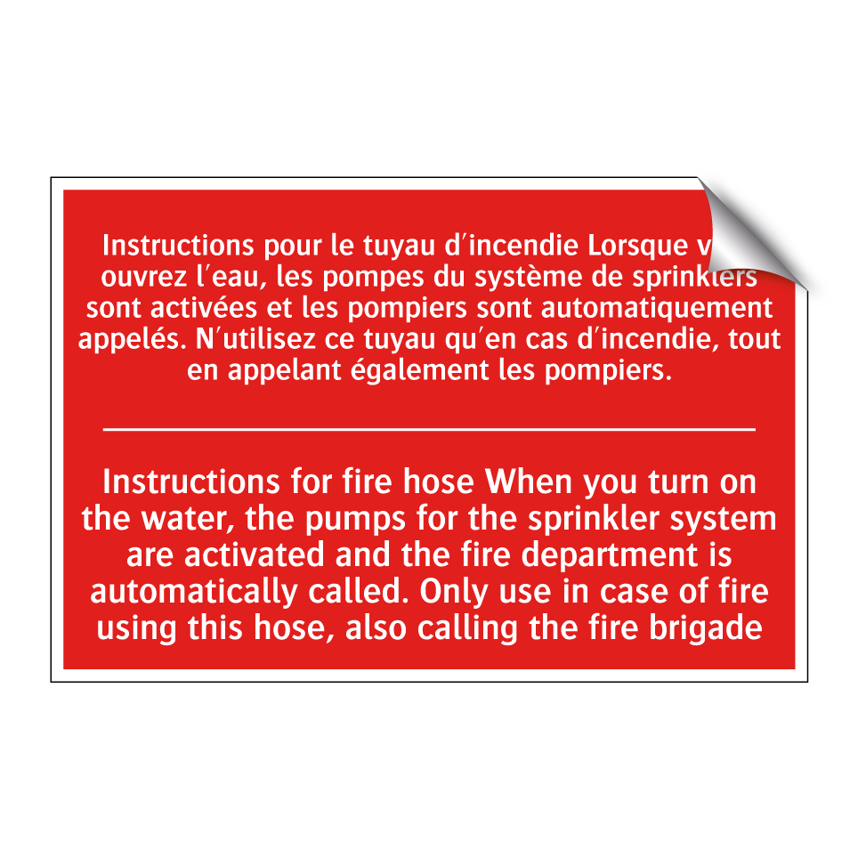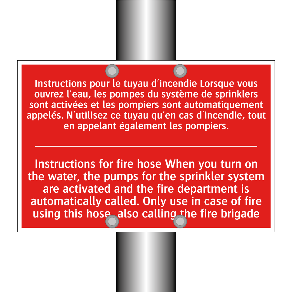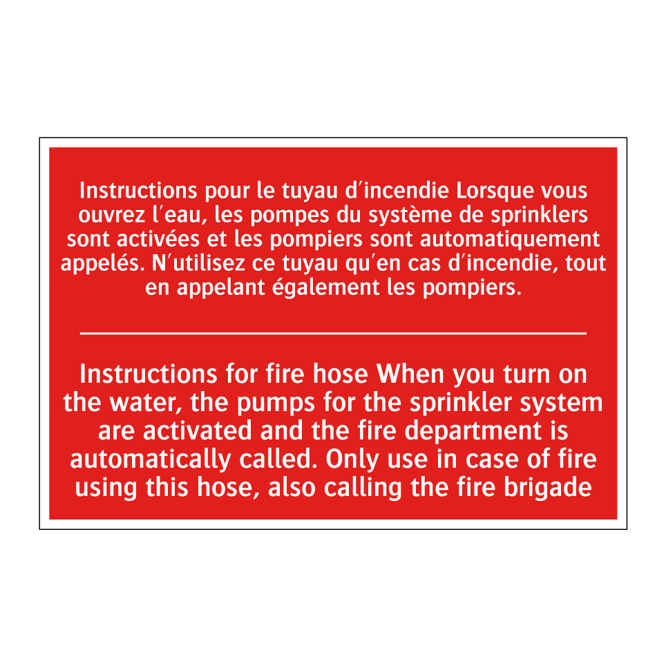 Panneau de signalisation incendie bilingue avec texte en français : "Instructions pour le tuyau d'incendie Lorsque vous ouvrez l'eau, les pompes du système de sprinklers sont activées et les pompiers sont automatiquement appelés. N'utilisez ce tuyau qu'en cas d'incendie, tout en appelant également les pompiers.", et en anglais : "Instructions for fire hose When you turn on the water, the pumps for the sprinkler system are activated and the fire department is automatically called. Only use in case of fire using this hose, also calling the fire brigade"