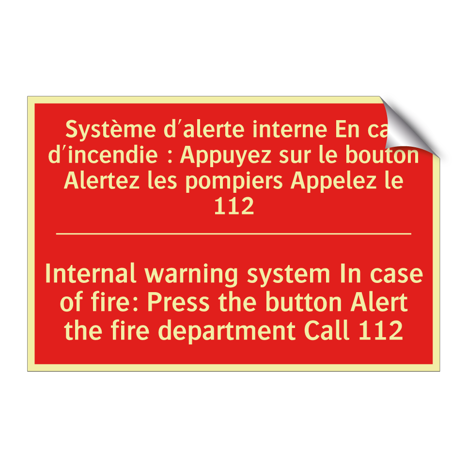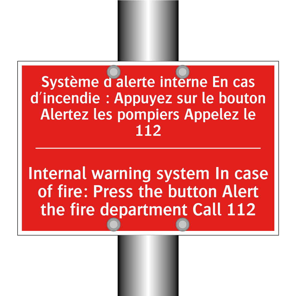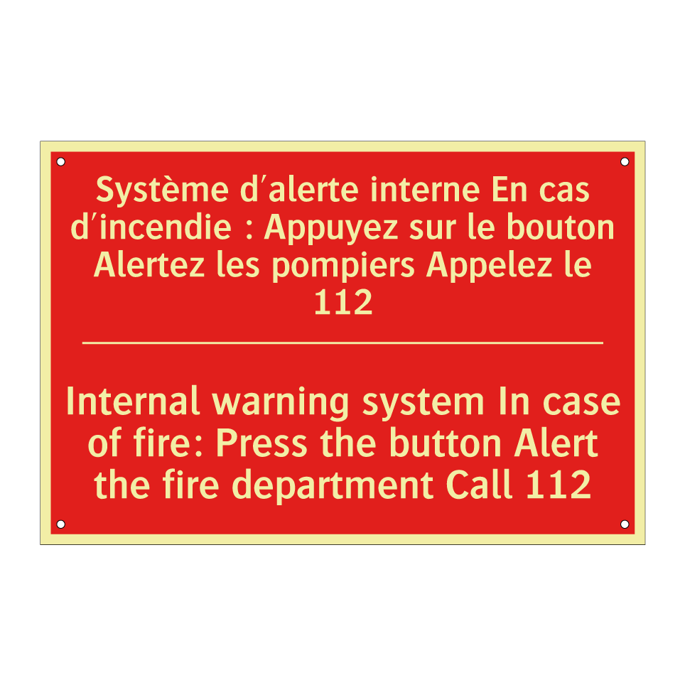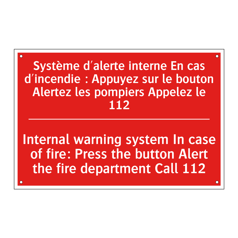 Panneau de signalisation incendie bilingue avec texte en français : "Système d'alerte interne En cas d'incendie : Appuyez sur le bouton Alertez les pompiers Appelez le 112", et en anglais : "Internal warning system In case of fire: Press the button Alert the fire department Call 112"