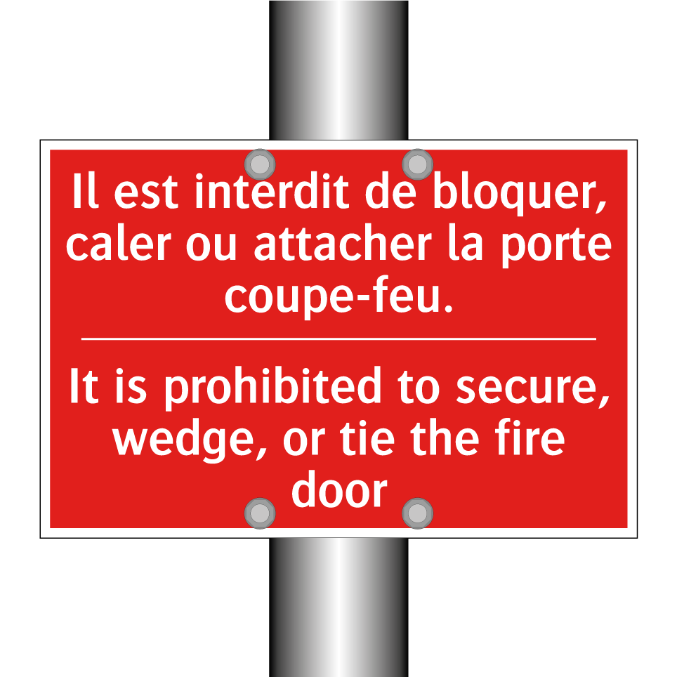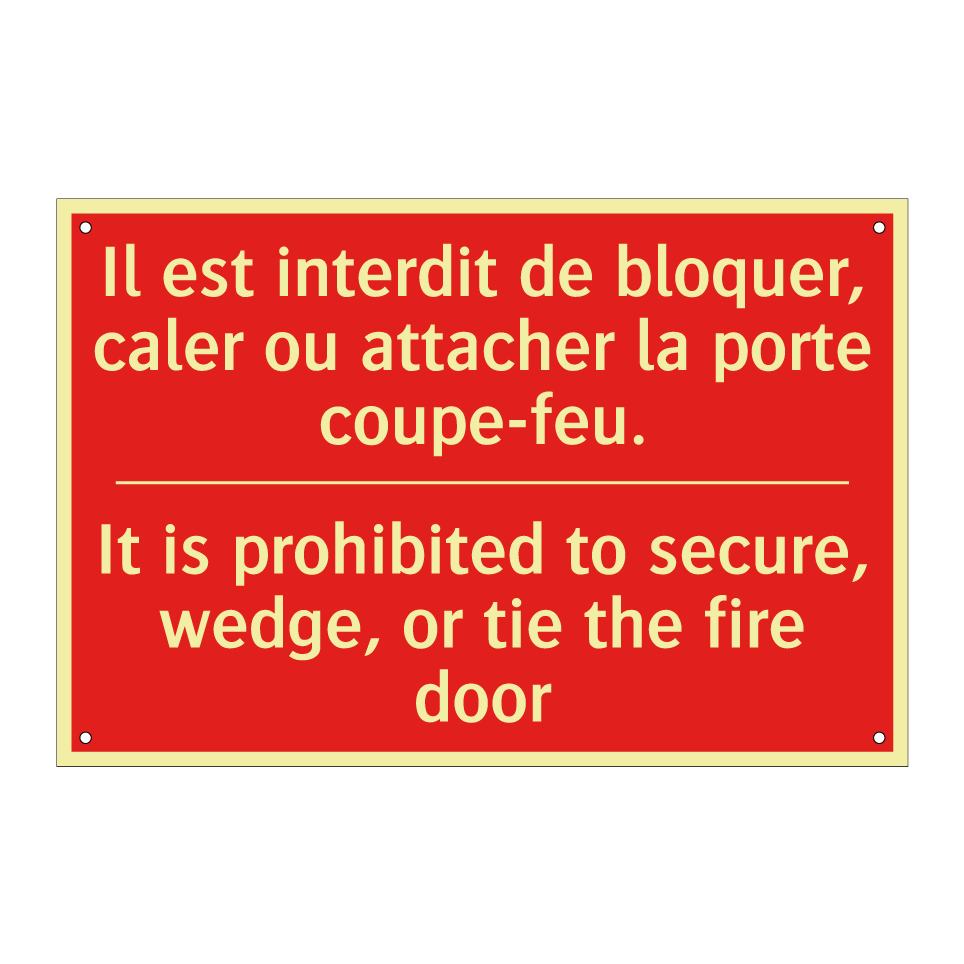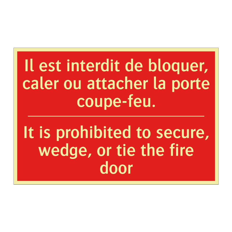 Panneau de signalisation incendie bilingue avec texte en français : "Il est interdit de bloquer, caler ou attacher la porte coupe-feu.", et en anglais : "It is prohibited to secure, wedge, or tie the fire door"