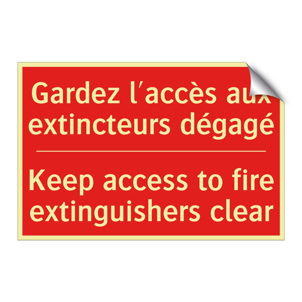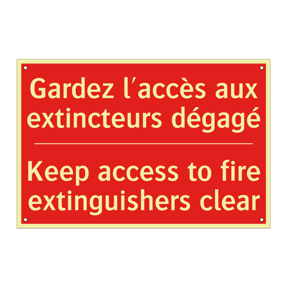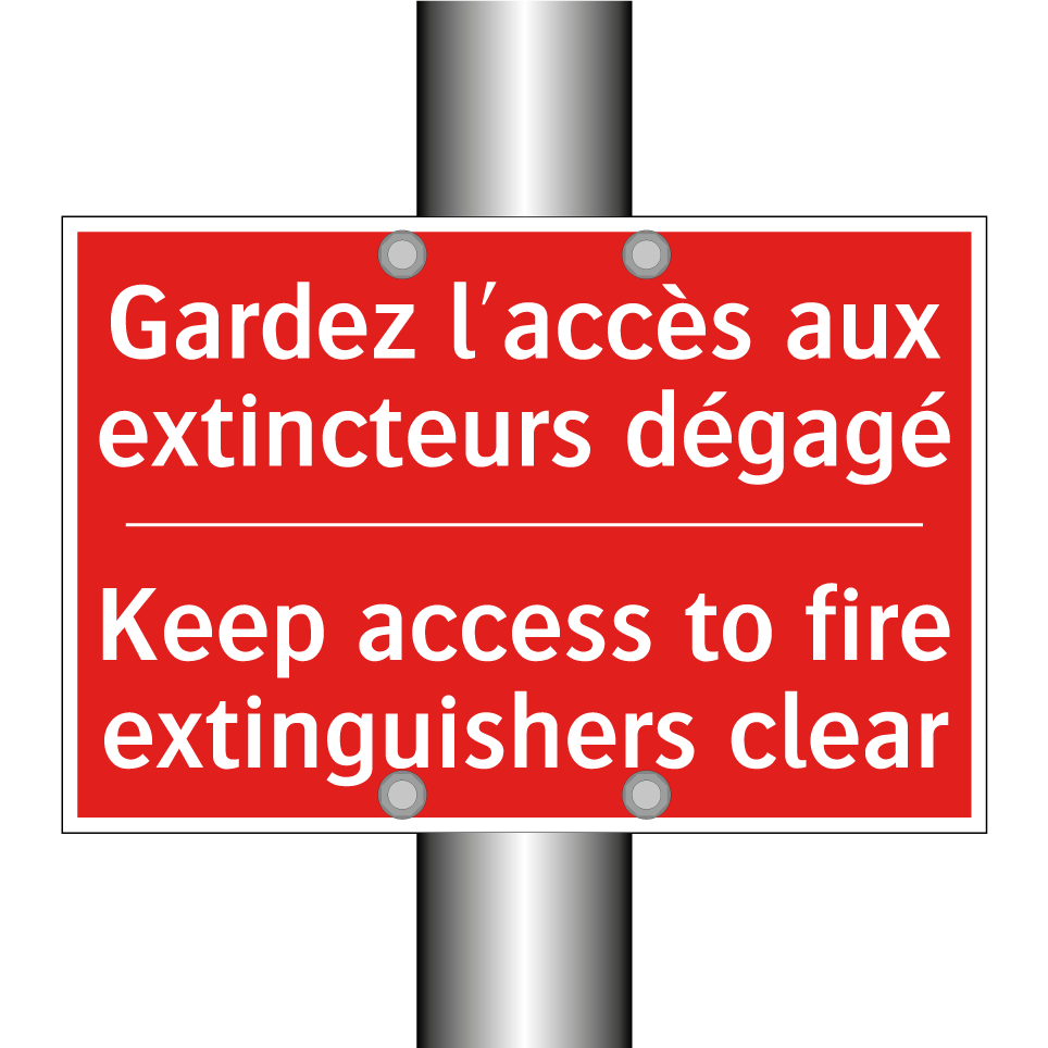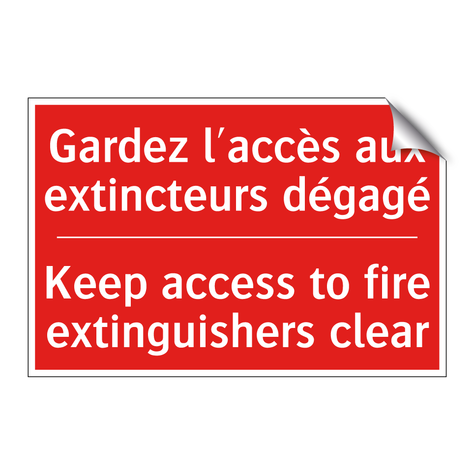 Panneau de signalisation incendie bilingue avec texte en français : "Gardez l'accès aux extincteurs dégagé", et en anglais : "Keep access to fire extinguishers clear"