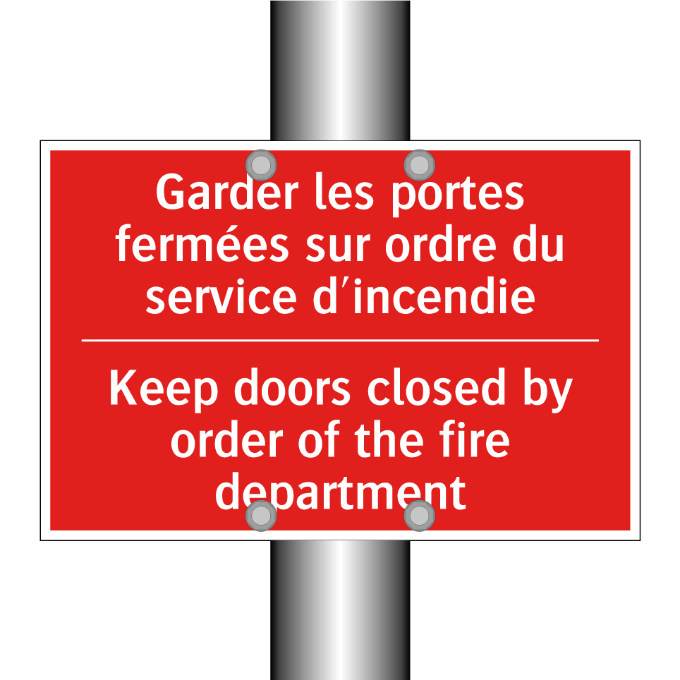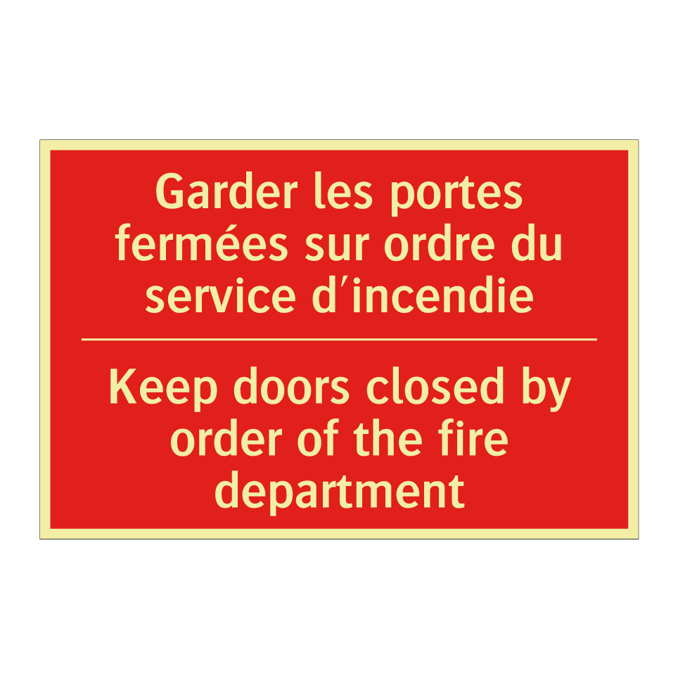 Panneau de signalisation incendie bilingue avec texte en français : "Garder les portes fermées sur ordre du service d'incendie", et en anglais : "Keep doors closed by order of the fire department"