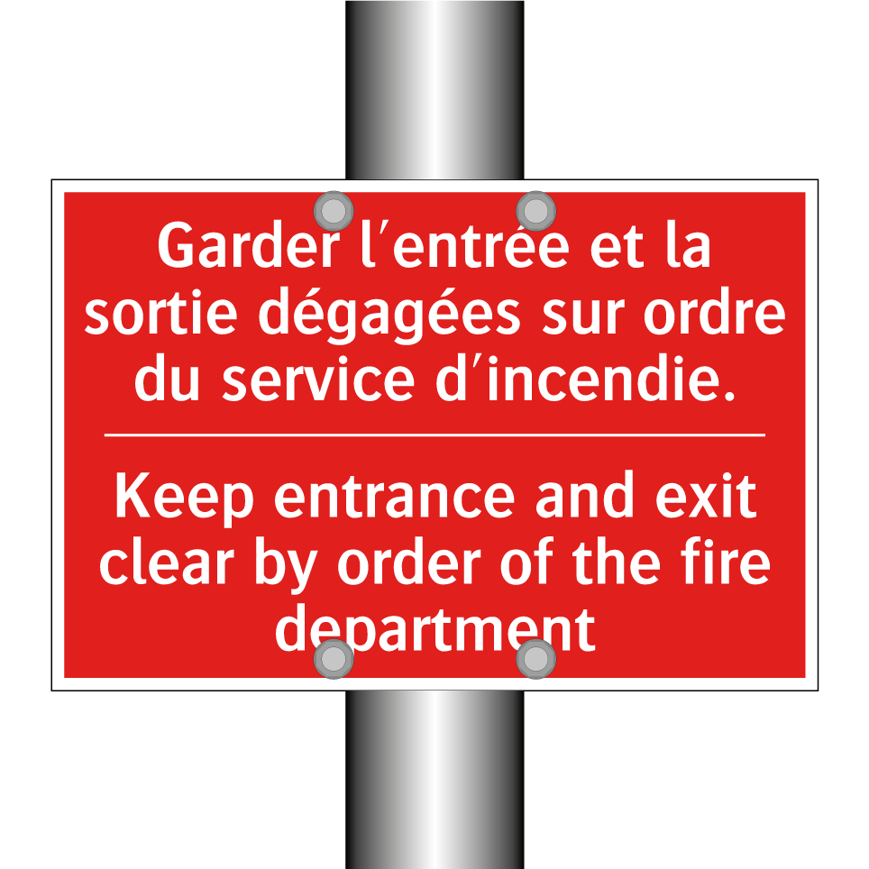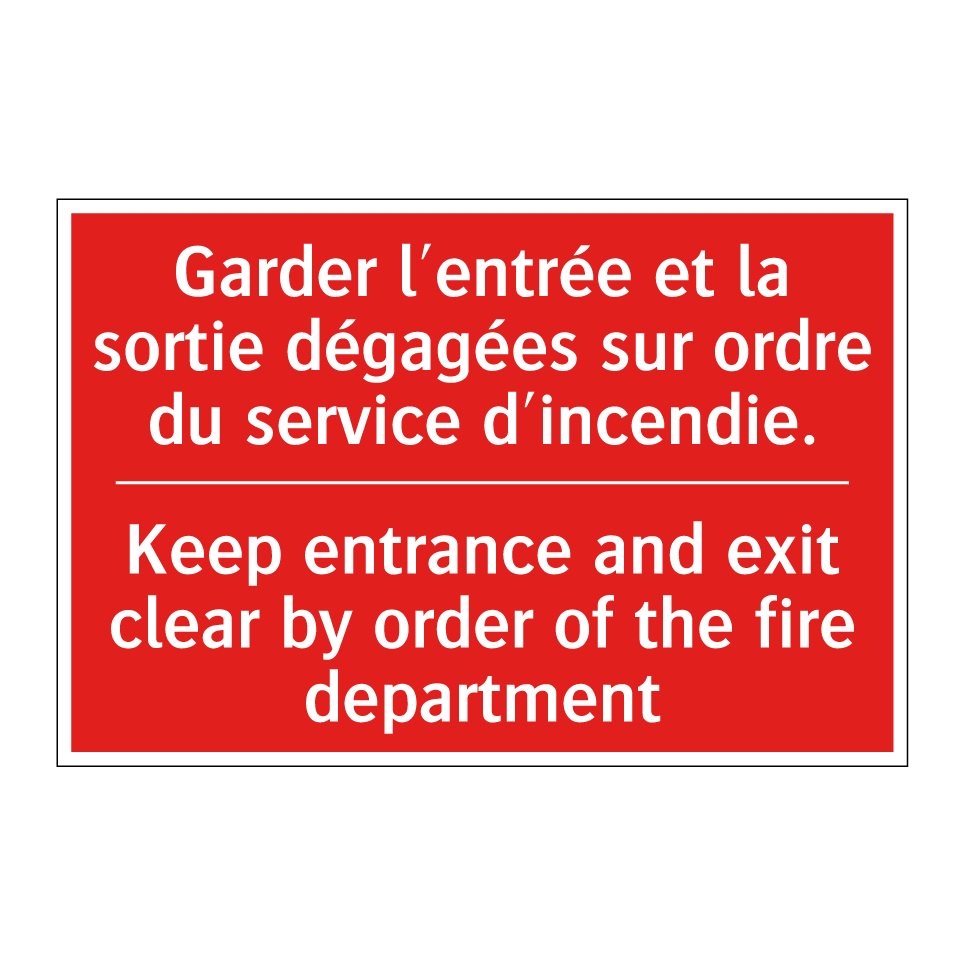 Panneau de signalisation incendie bilingue avec texte en français : "Garder l'entrée et la sortie dégagées sur ordre du service d'incendie.", et en anglais : "Keep entrance and exit clear by order of the fire department"
