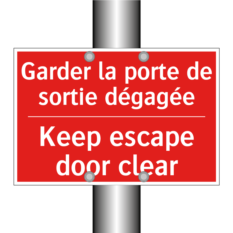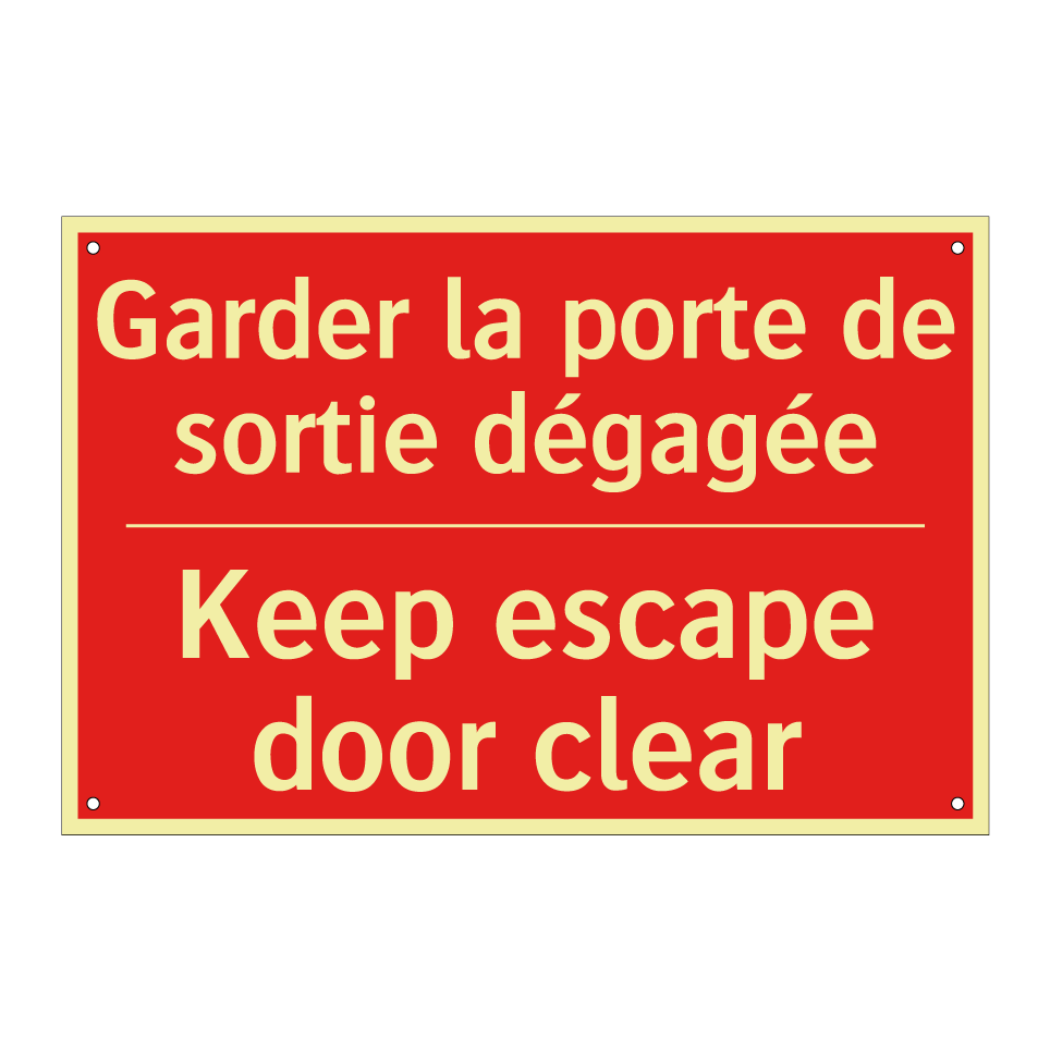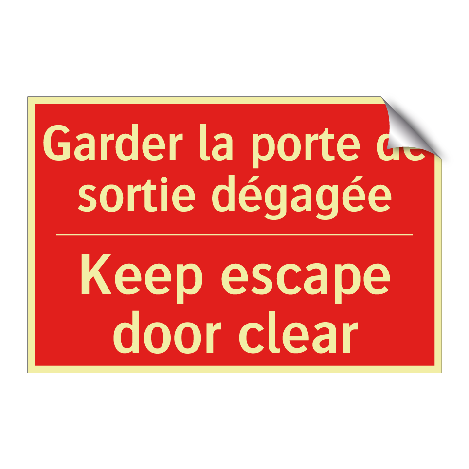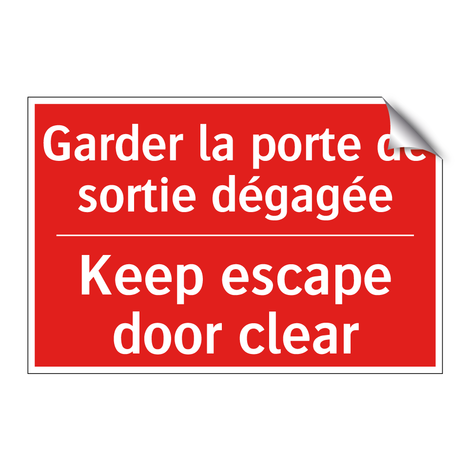 Panneau de signalisation incendie bilingue avec texte en français : "Garder la porte de sortie dégagée", et en anglais : "Keep escape door clear"