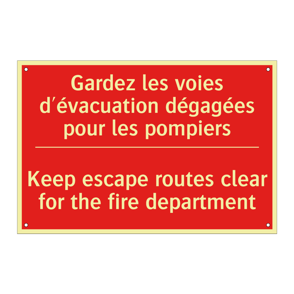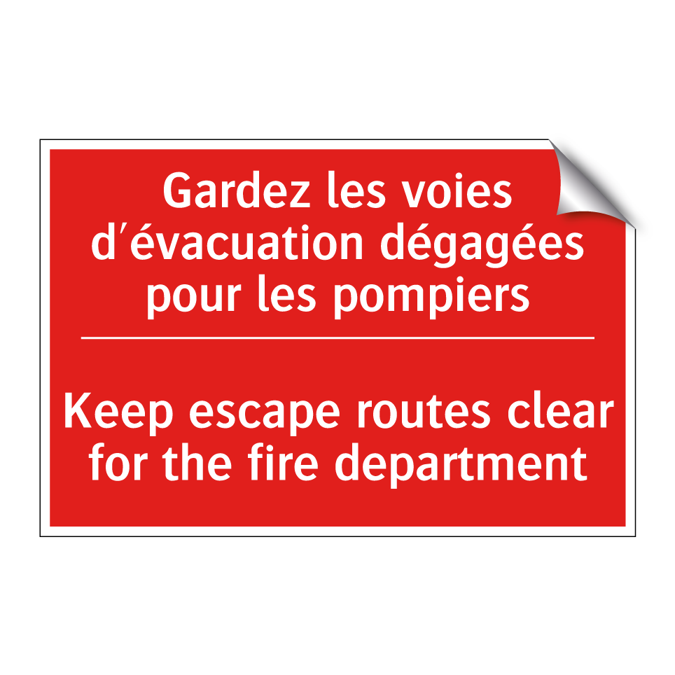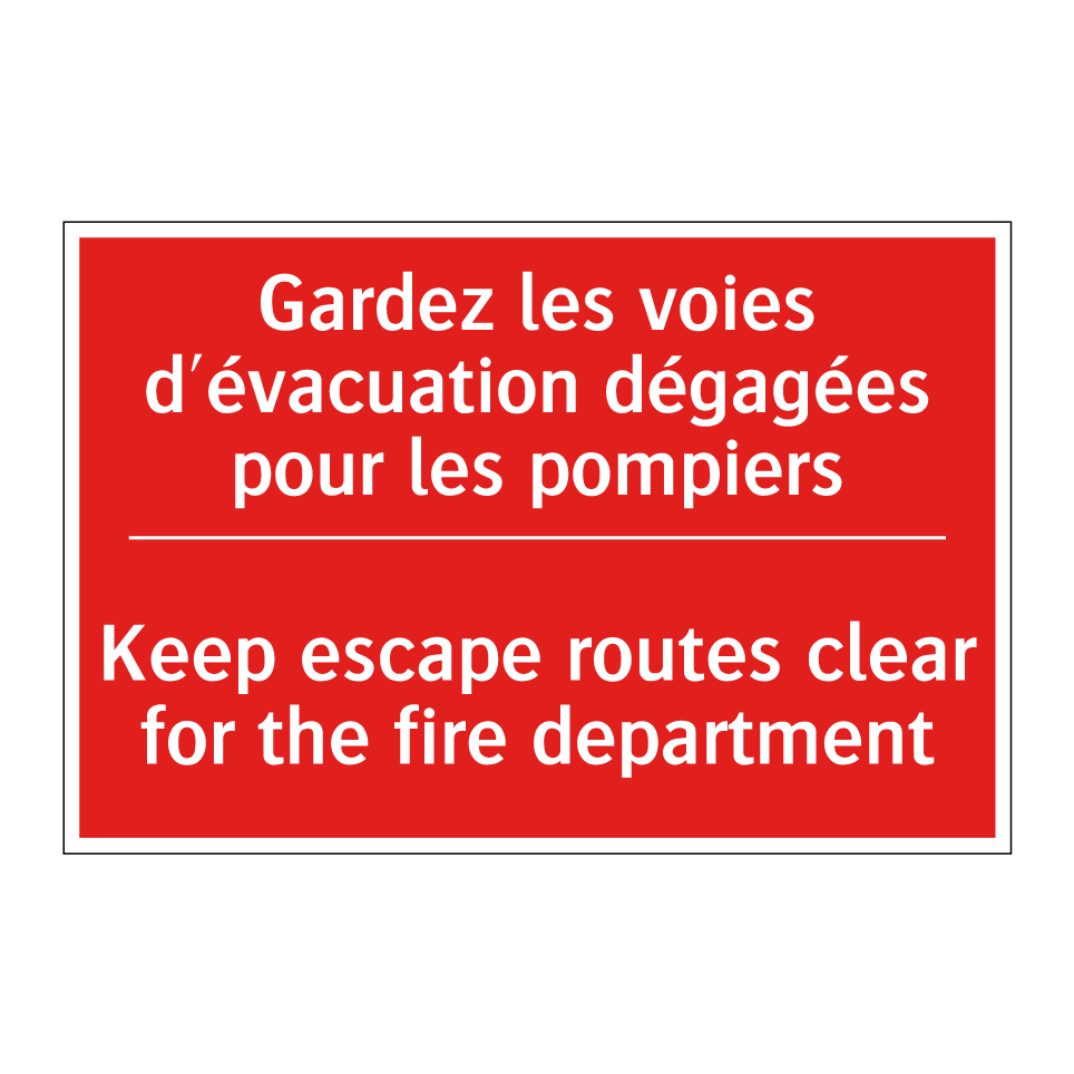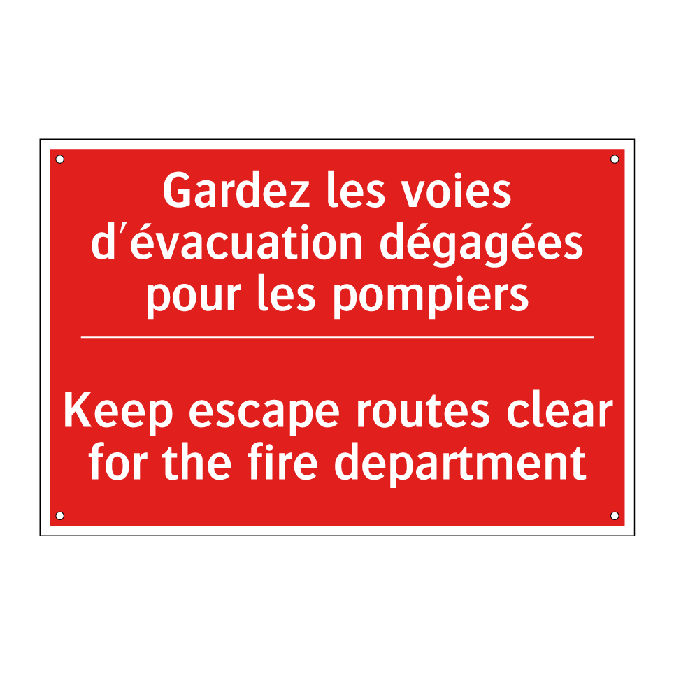 Panneau de signalisation incendie bilingue avec texte en français : "Gardez les voies d'évacuation dégagées pour les pompiers", et en anglais : "Keep escape routes clear for the fire department"