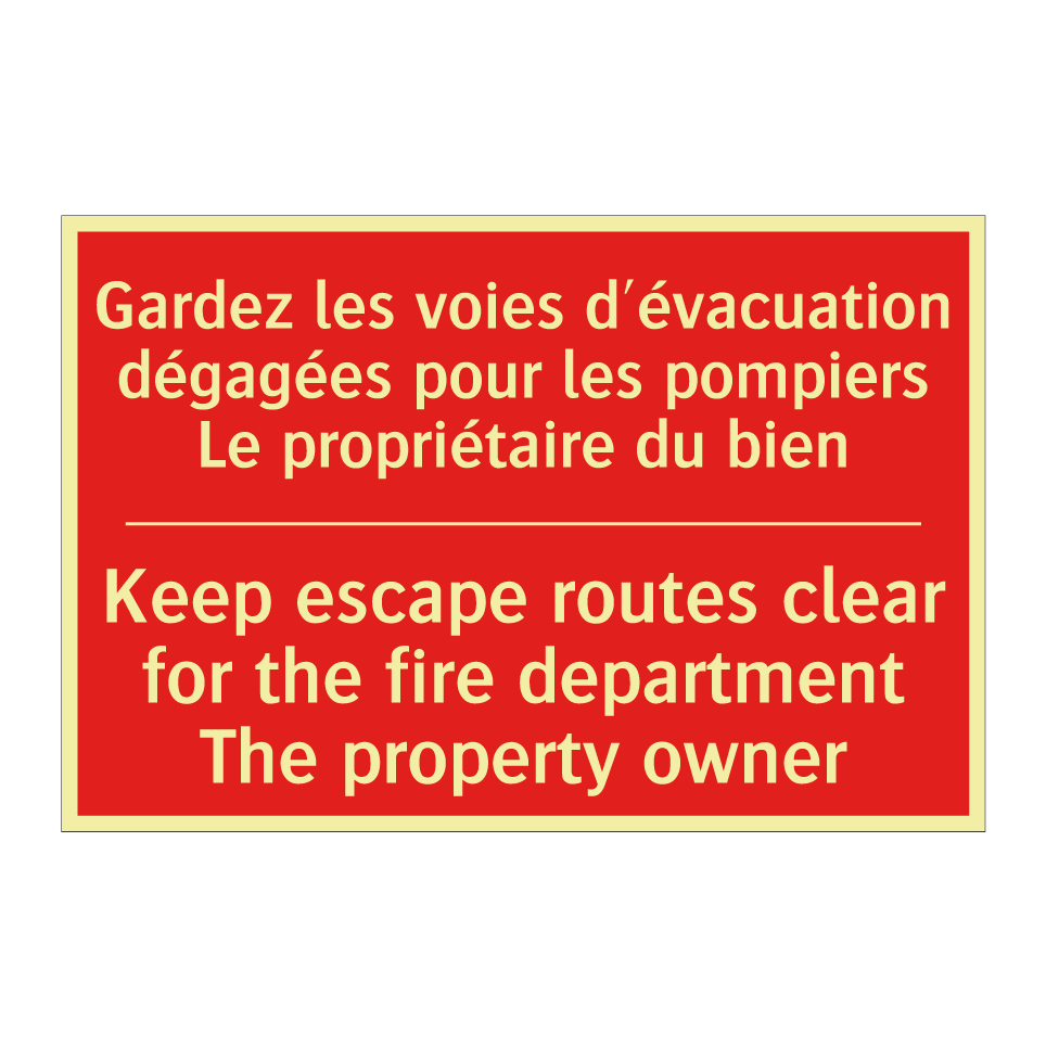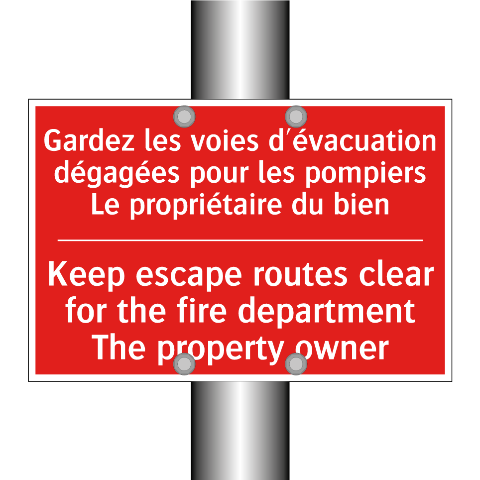Panneau de signalisation incendie bilingue avec texte en français : "Gardez les voies d'évacuation dégagées pour les pompiers Le propriétaire du bien", et en anglais : "Keep escape routes clear for the fire department The property owner"