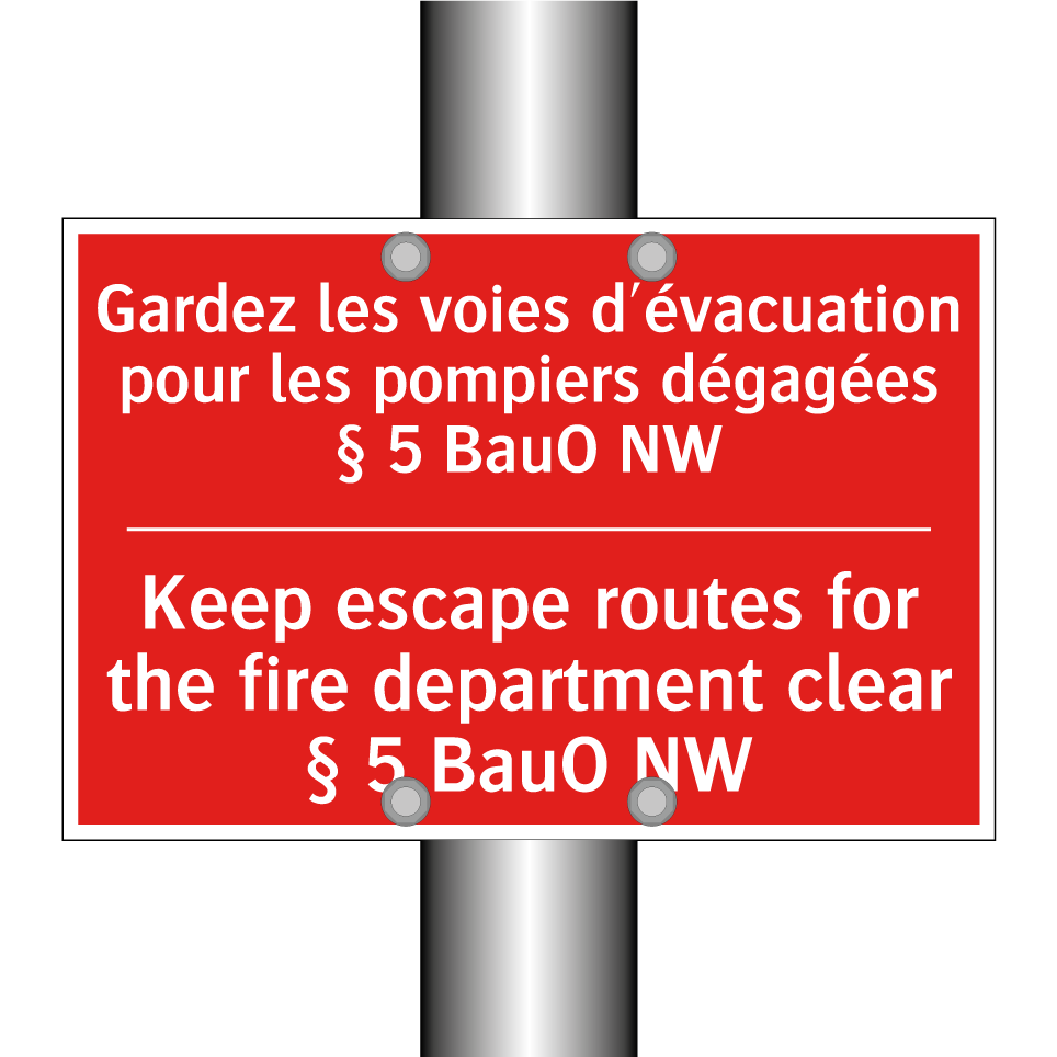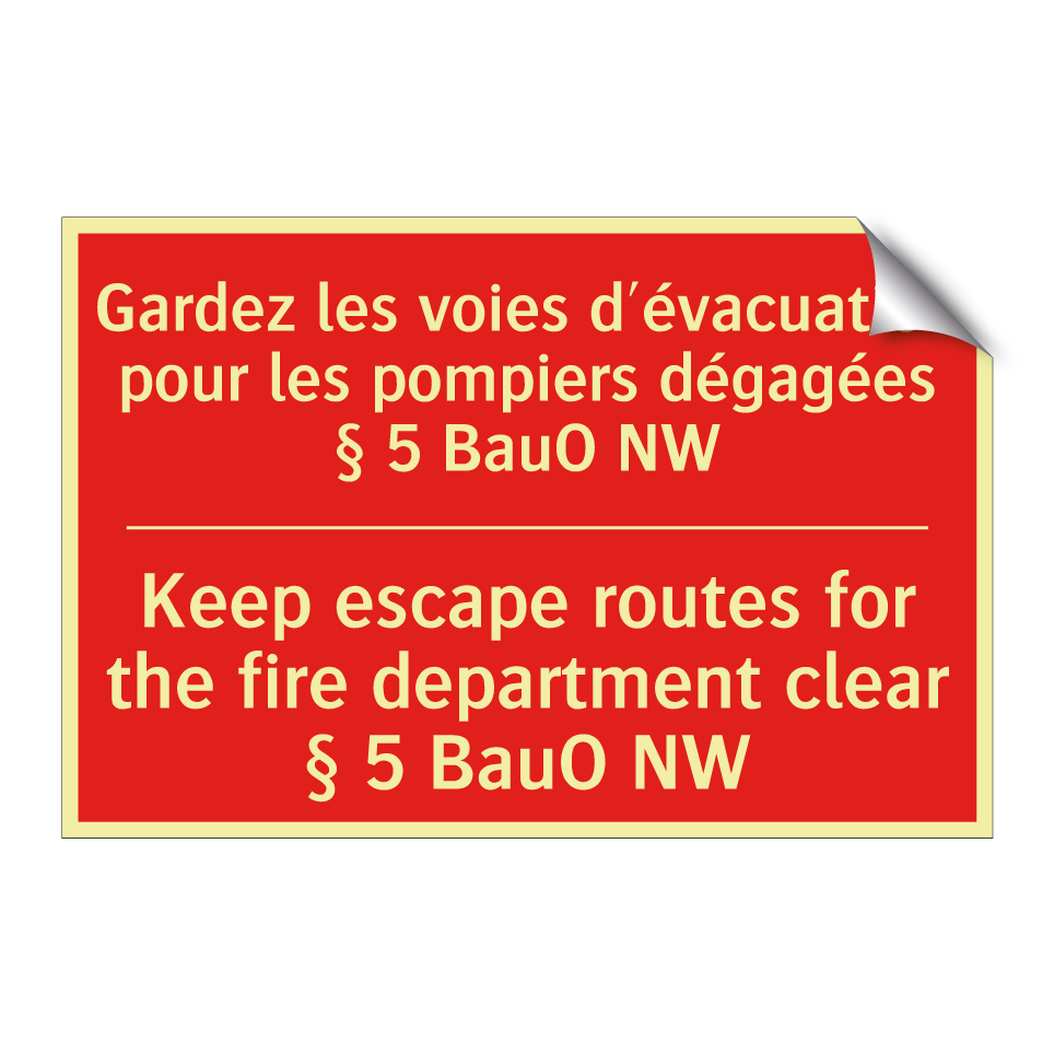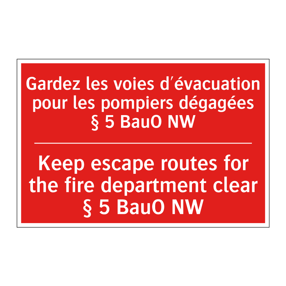 Panneau de signalisation incendie bilingue avec texte en français : "Gardez les voies d'évacuation pour les pompiers dégagées § 5 BauO NW", et en anglais : "Keep escape routes for the fire department clear § 5 BauO NW"