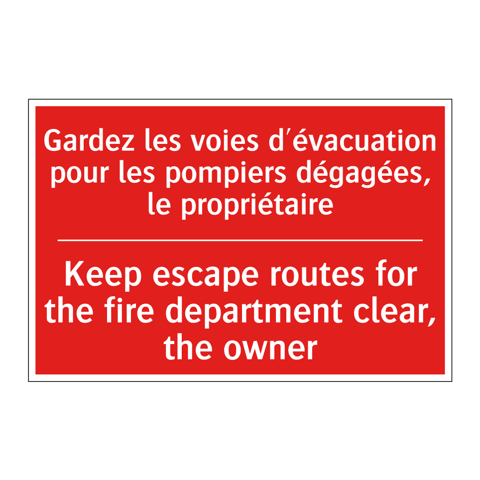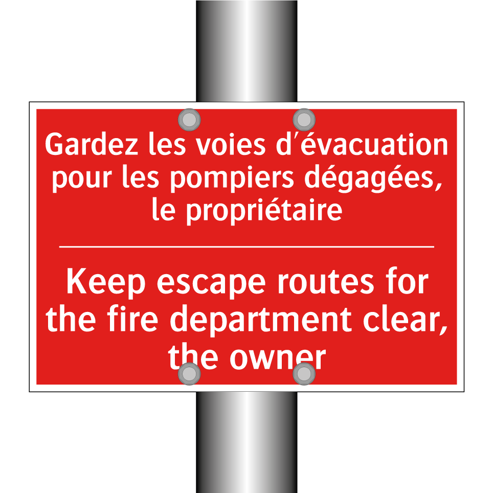 Panneau de signalisation incendie bilingue avec texte en français : "Gardez les voies d'évacuation pour les pompiers dégagées, le propriétaire", et en anglais : "Keep escape routes for the fire department clear, the owner"