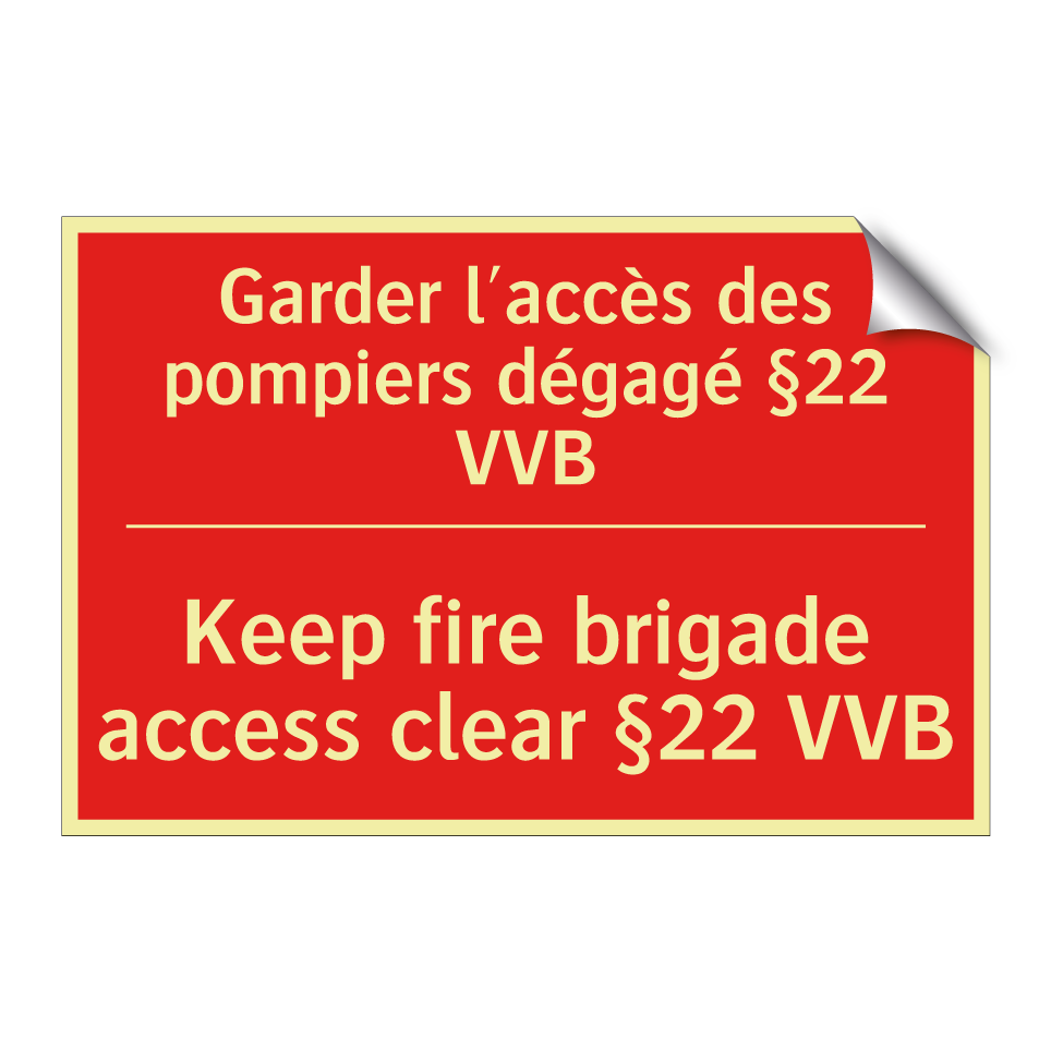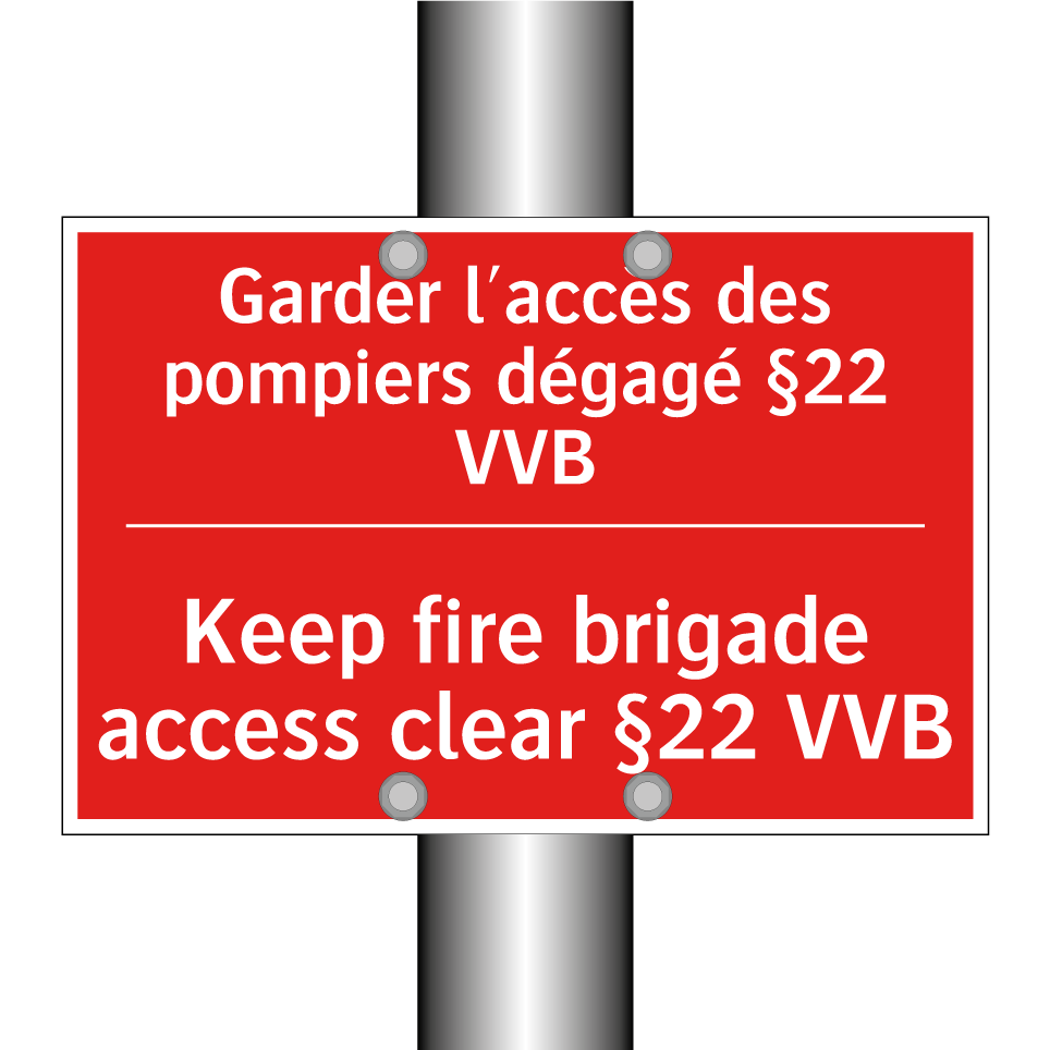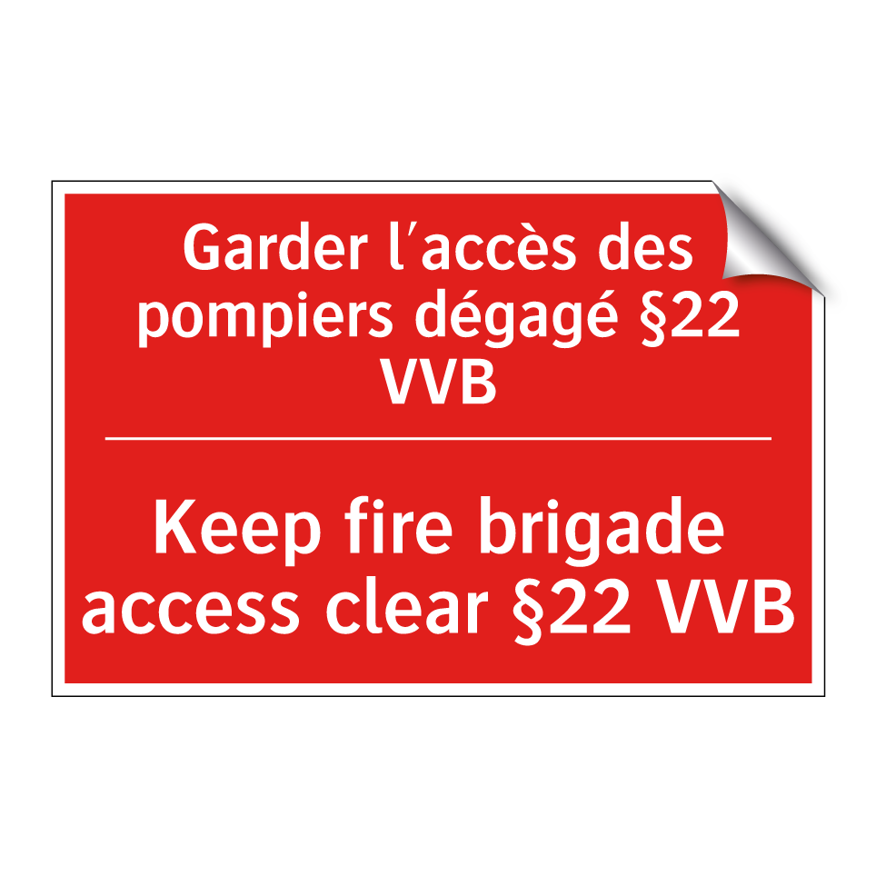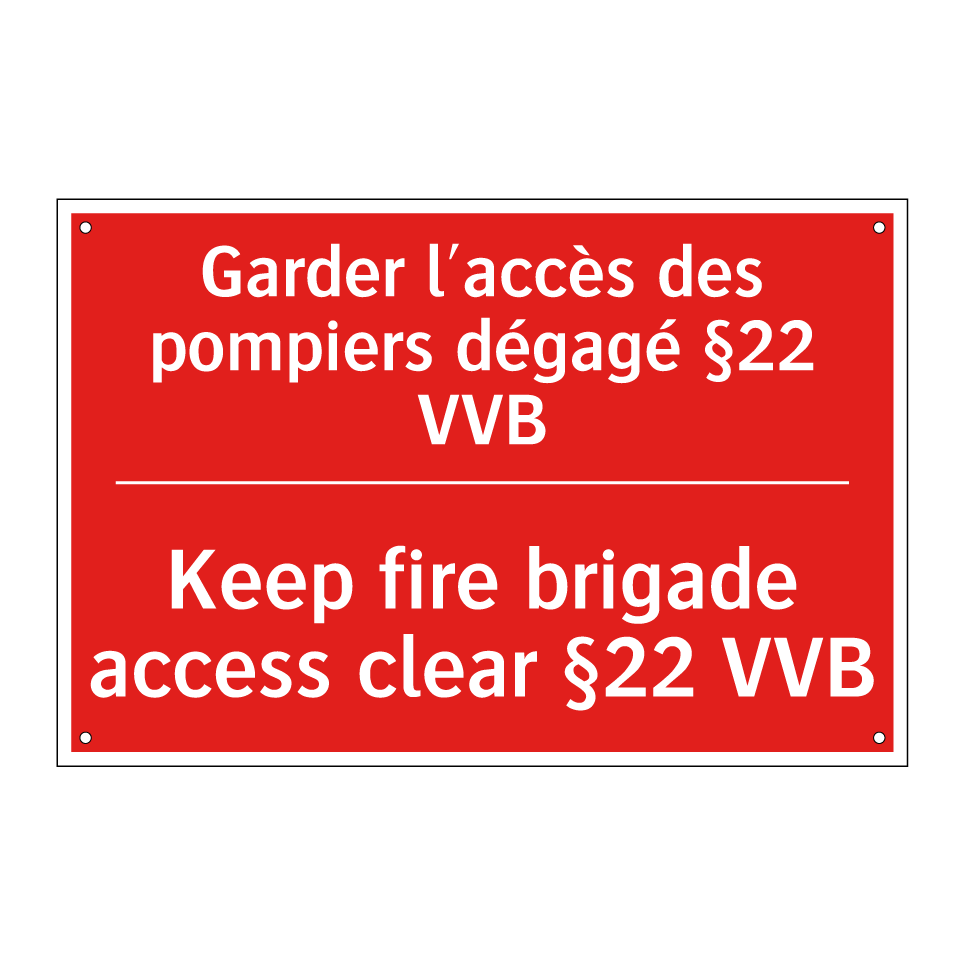 Panneau de signalisation incendie bilingue avec texte en français : "Garder l'accès des pompiers dégagé §22 VVB", et en anglais : "Keep fire brigade access clear §22 VVB"