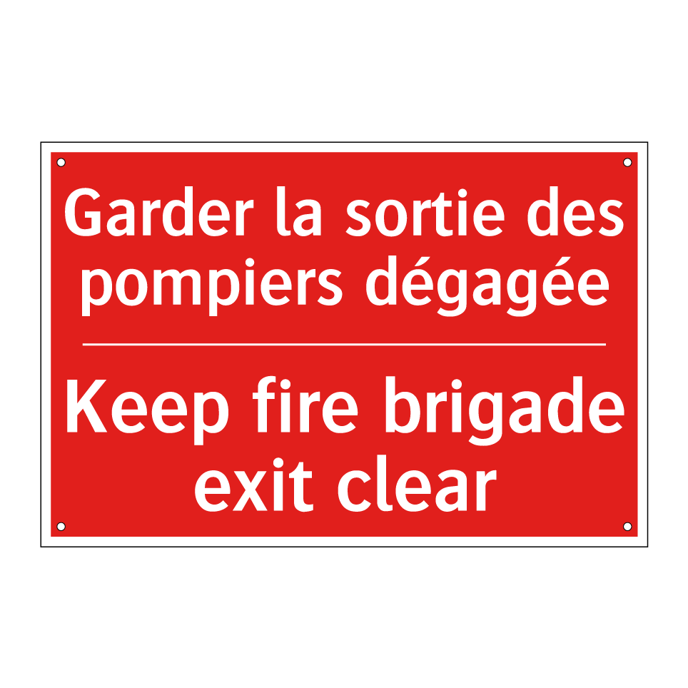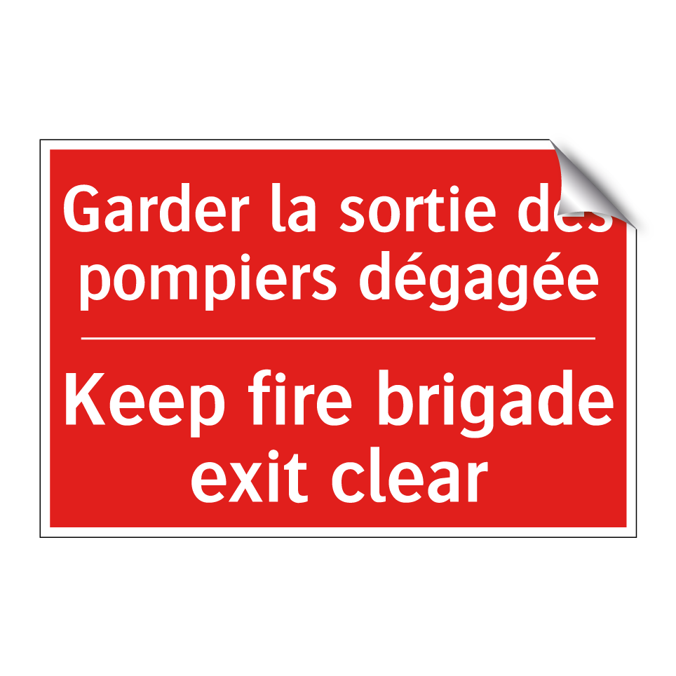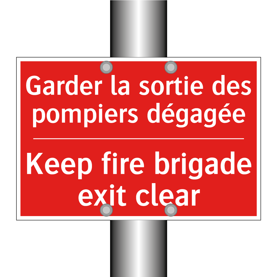 Panneau de signalisation incendie bilingue avec texte en français : "Garder la sortie des pompiers dégagée", et en anglais : "Keep fire brigade exit clear"