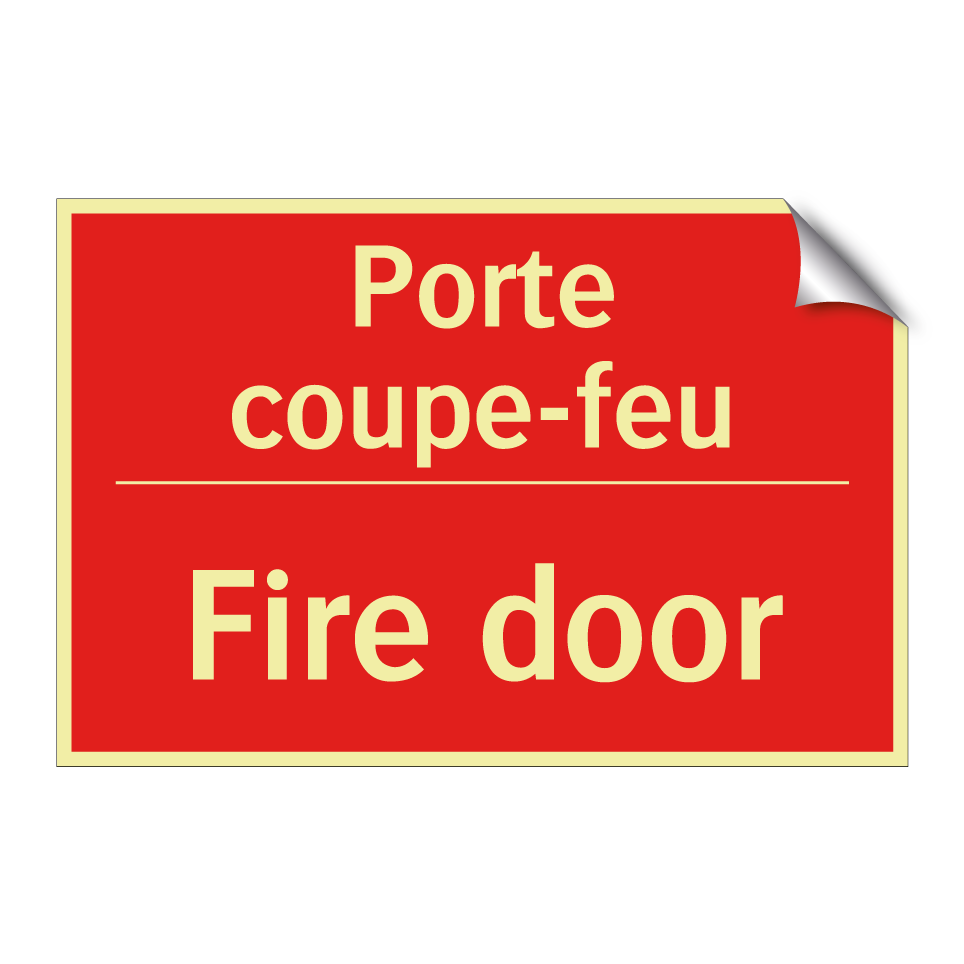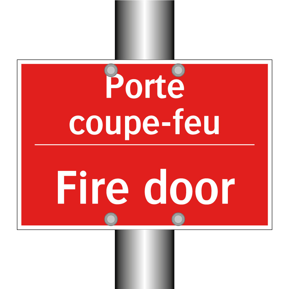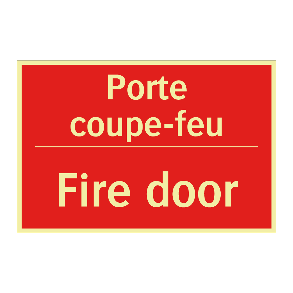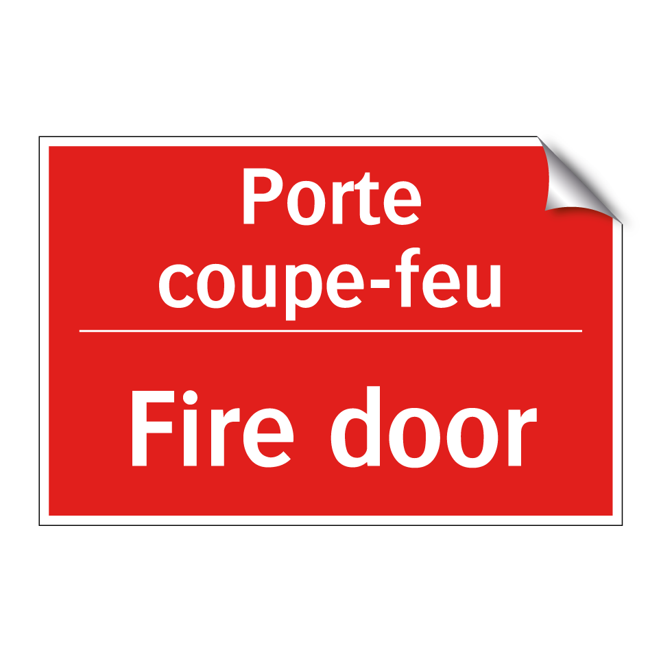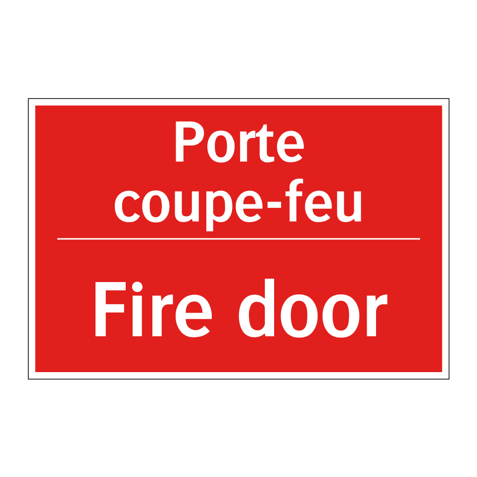 Panneau de signalisation incendie bilingue avec texte en français : "Porte coupe-feu", et en anglais : "Fire door"