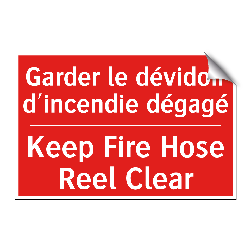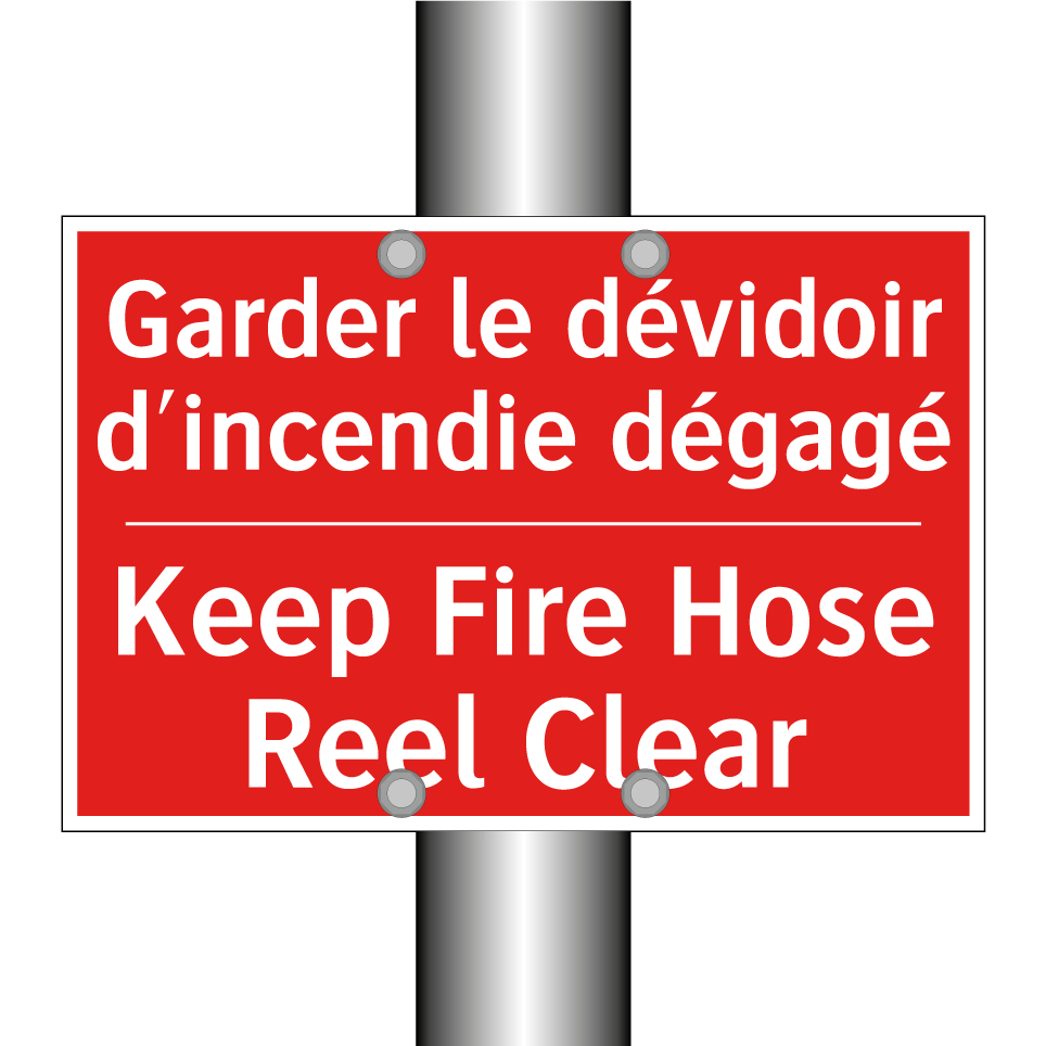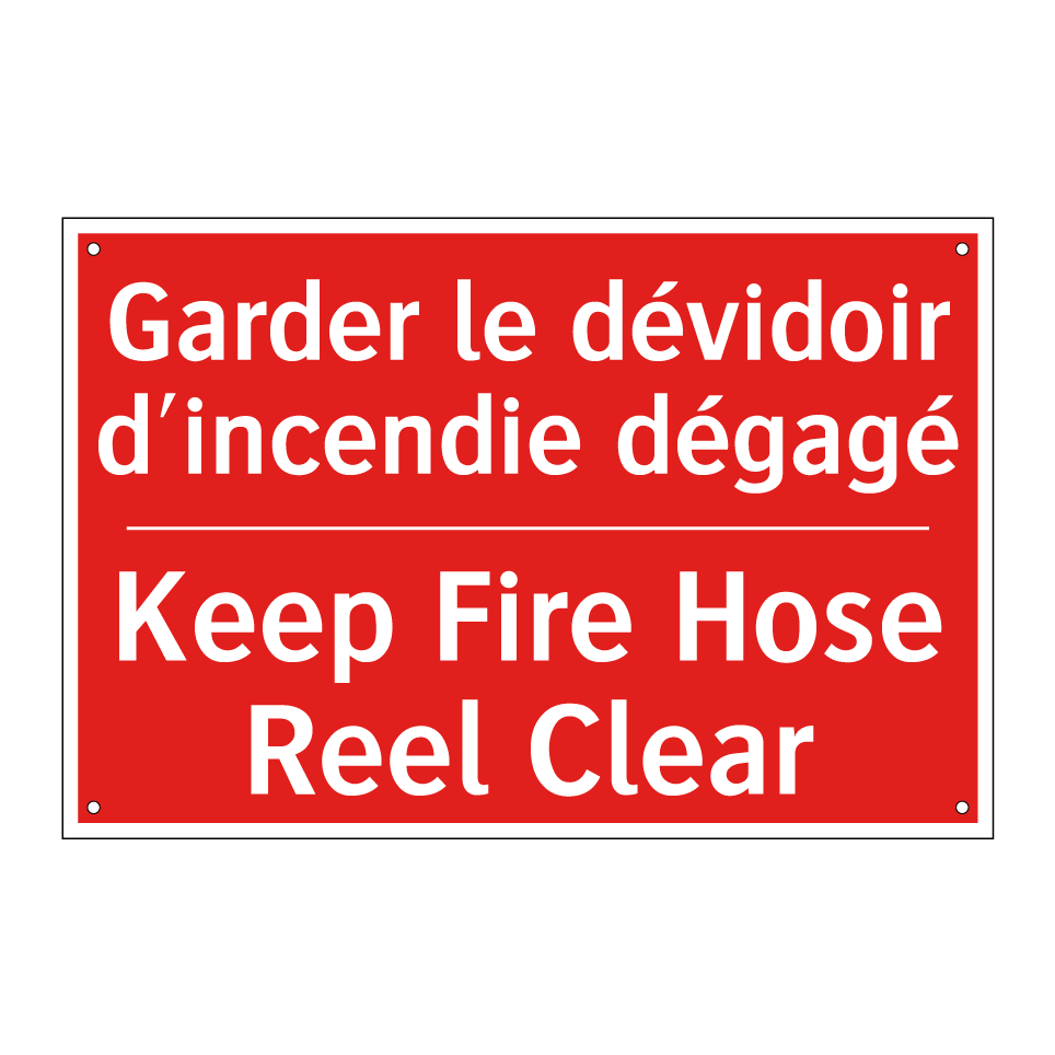 Panneau de signalisation incendie bilingue avec texte en français : "Garder le dévidoir d'incendie dégagé", et en anglais : "Keep Fire Hose Reel Clear"