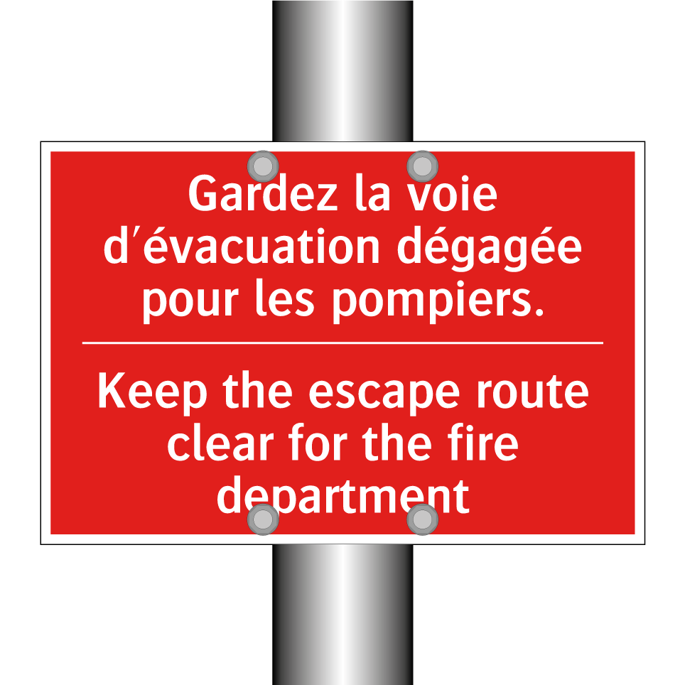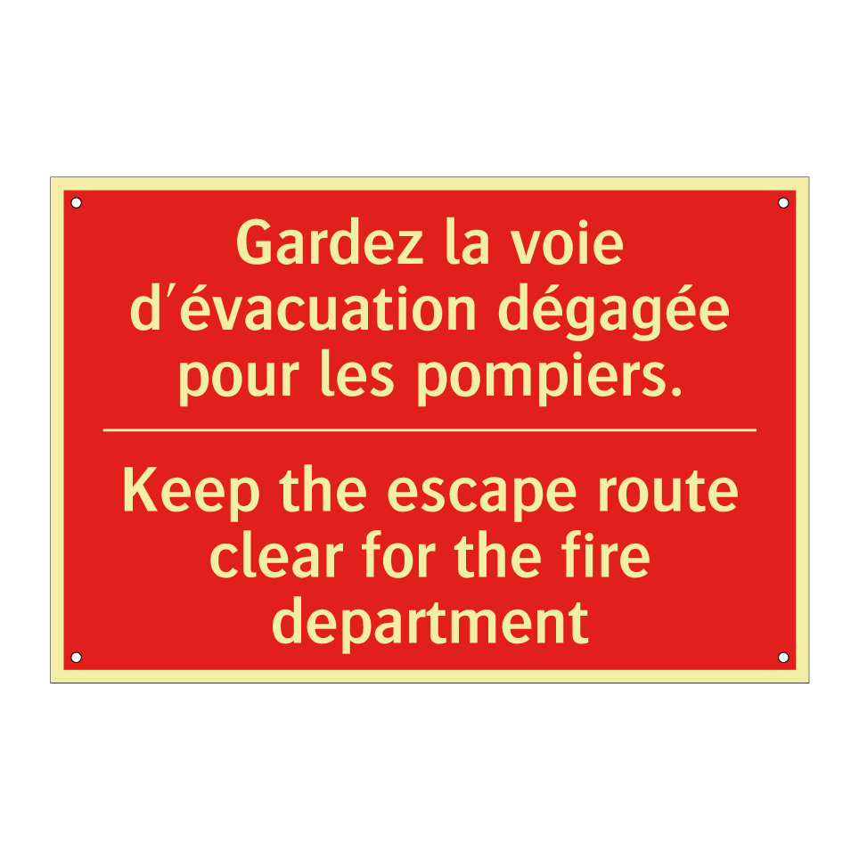 Panneau de signalisation incendie bilingue avec texte en français : "Gardez la voie d'évacuation dégagée pour les pompiers.", et en anglais : "Keep the escape route clear for the fire department"