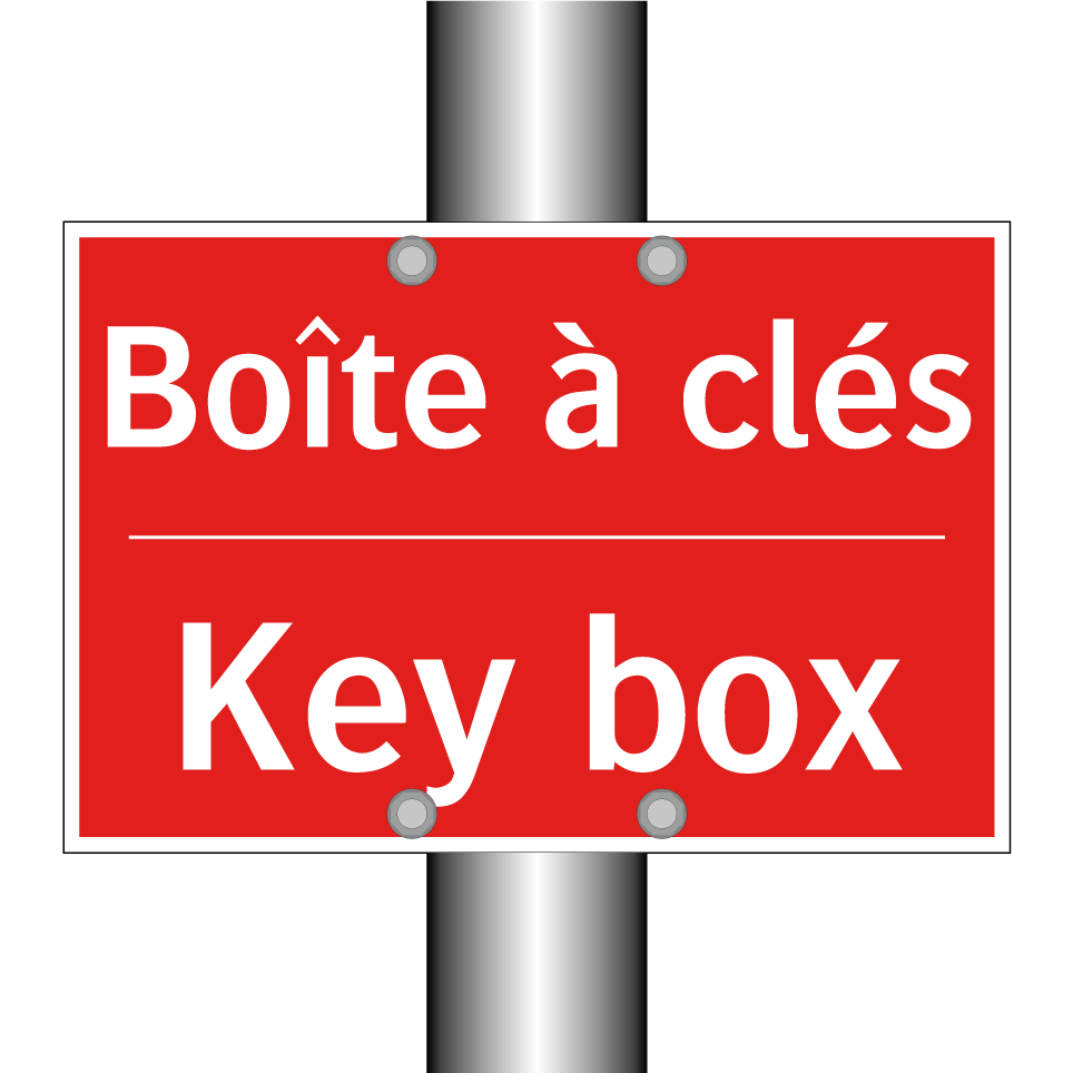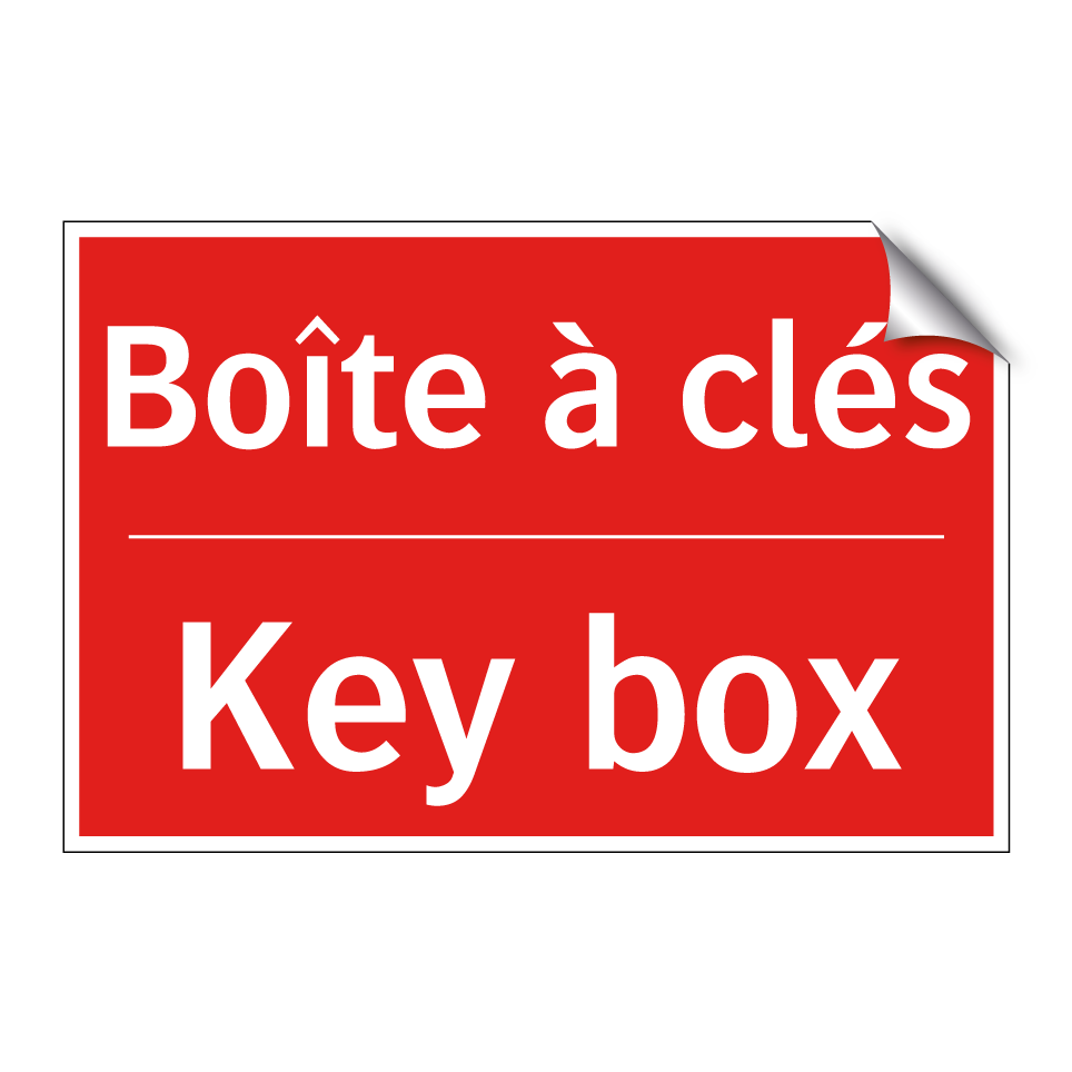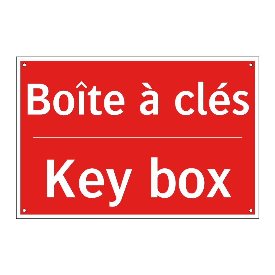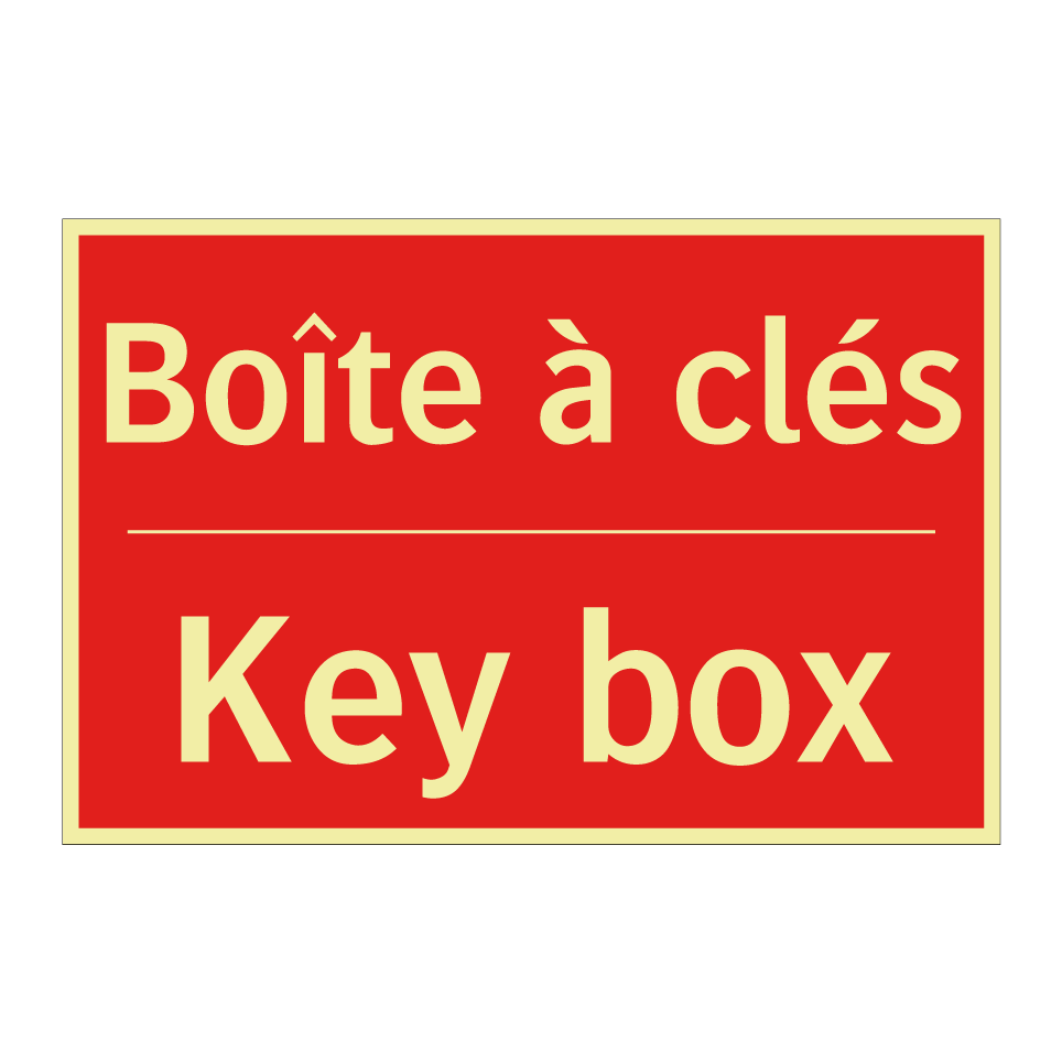 Panneau de signalisation incendie bilingue avec texte en français : "Boîte à clés", et en anglais : "Key box"