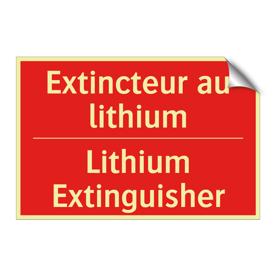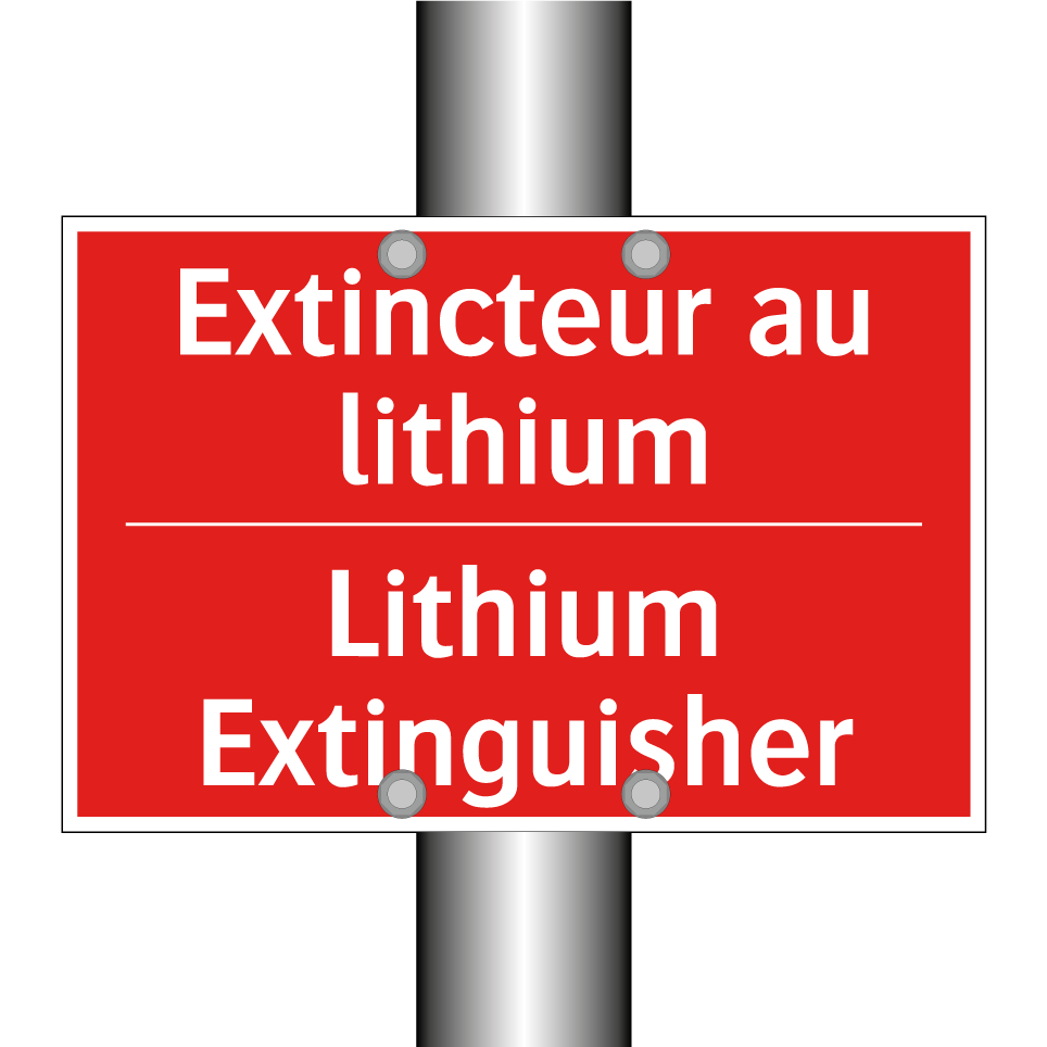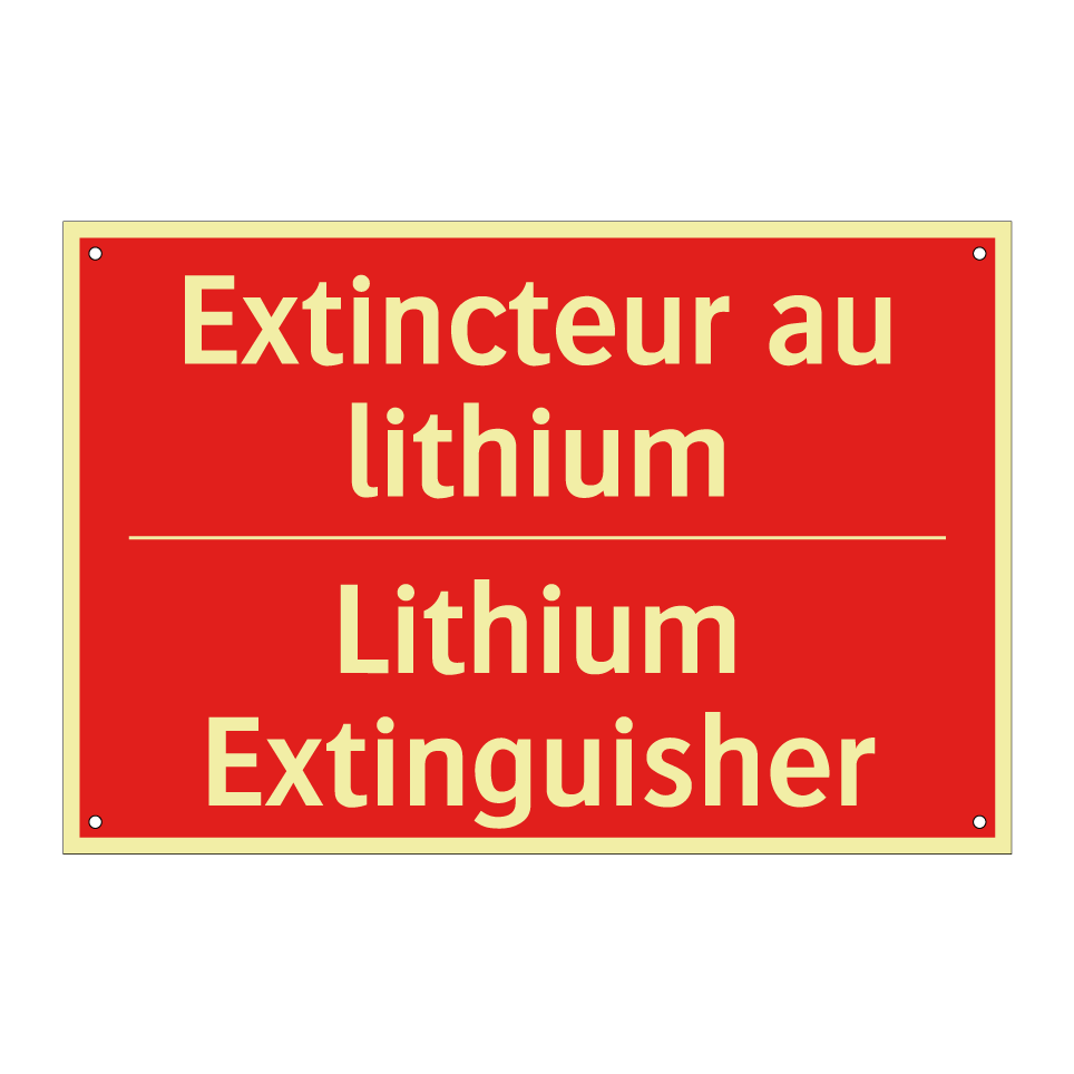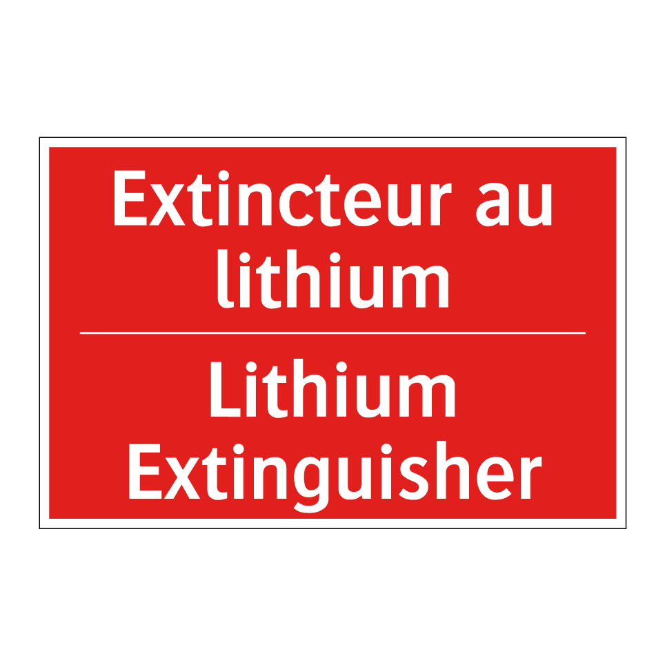 Panneau de signalisation incendie bilingue avec texte en français : "Extincteur au lithium", et en anglais : "Lithium Extinguisher"