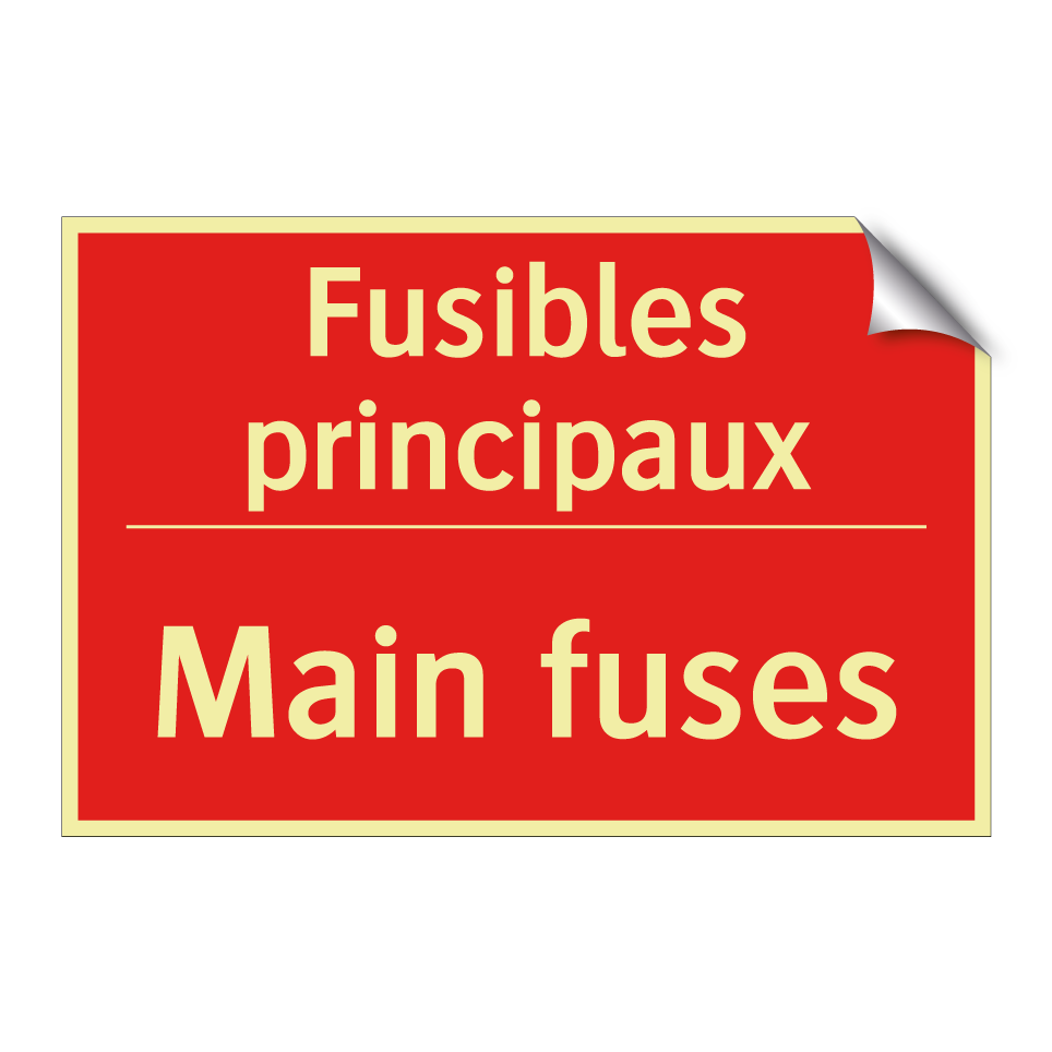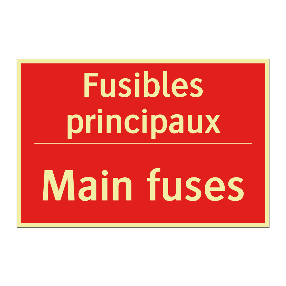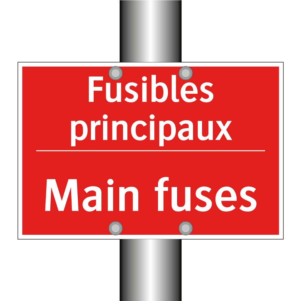 Panneau de signalisation incendie bilingue avec texte en français : "Fusibles principaux", et en anglais : "Main fuses"