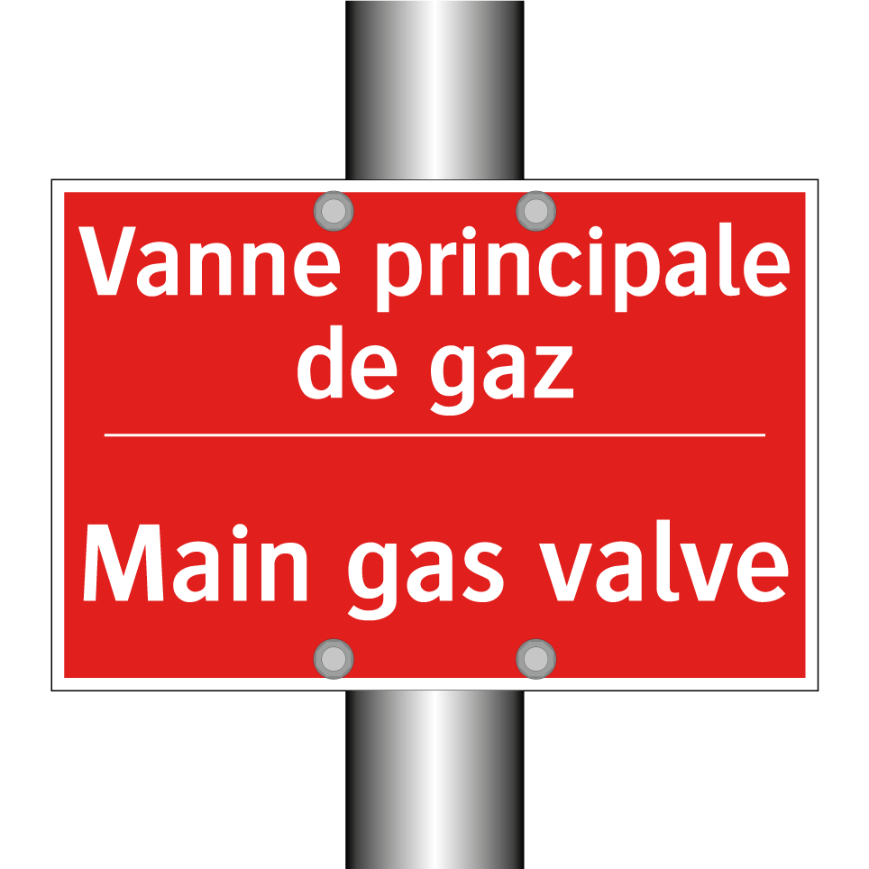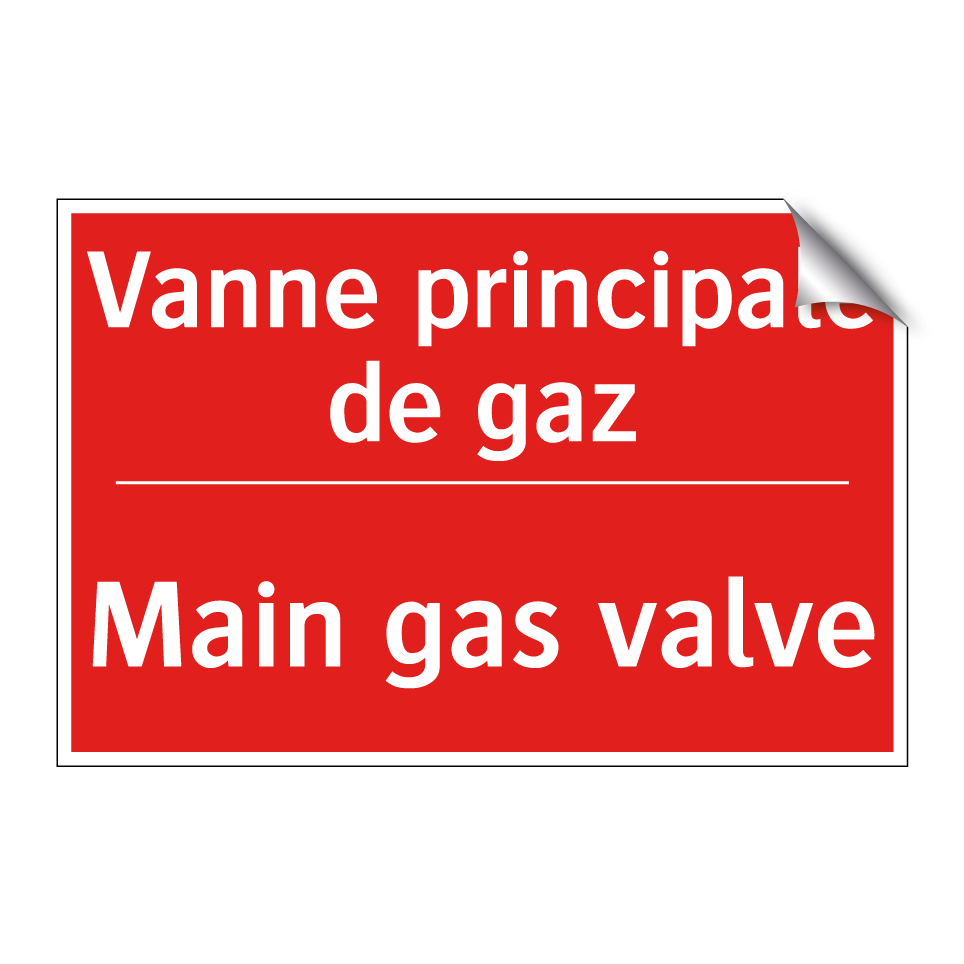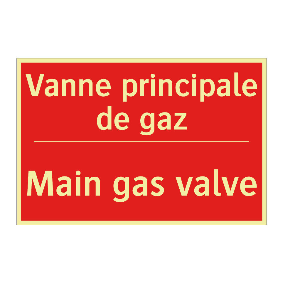 Panneau de signalisation incendie bilingue avec texte en français : "Vanne principale de gaz", et en anglais : "Main gas valve"