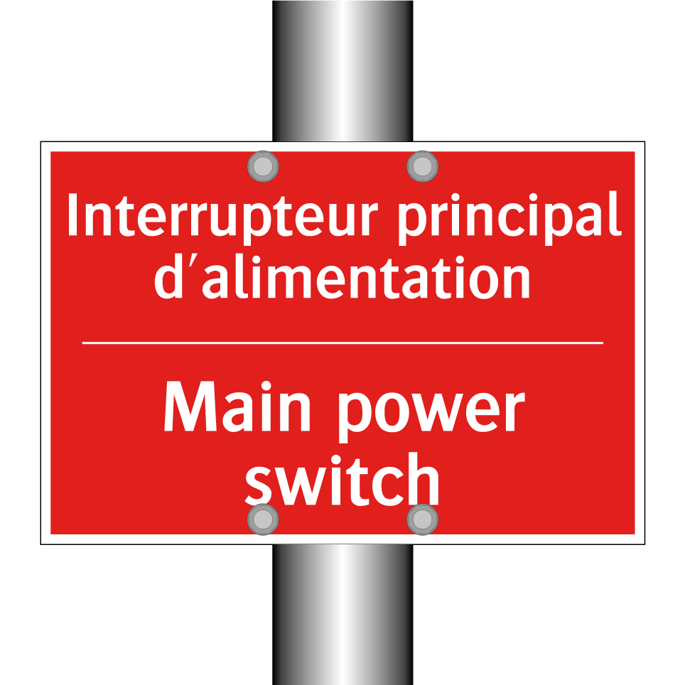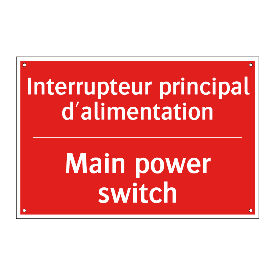 Panneau de signalisation incendie bilingue avec texte en français : "Interrupteur principal d'alimentation", et en anglais : "Main power switch"