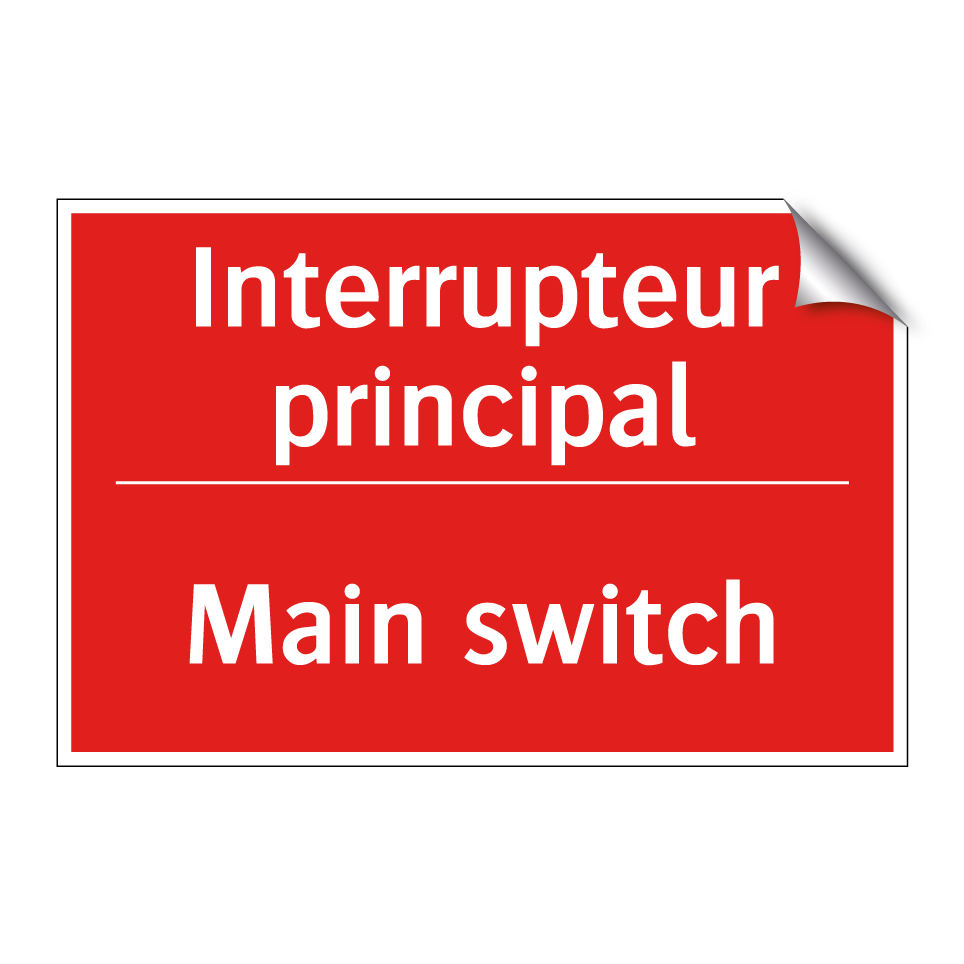 Panneau de signalisation incendie bilingue avec texte en français : "Interrupteur principal", et en anglais : "Main switch"