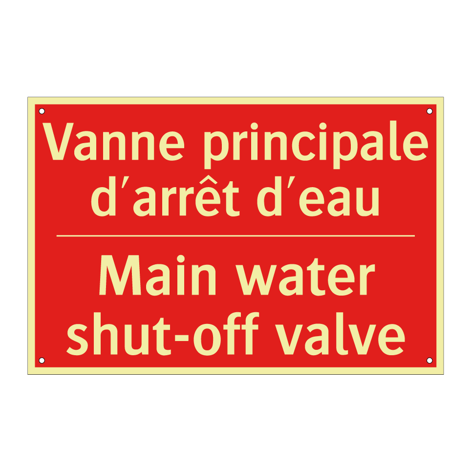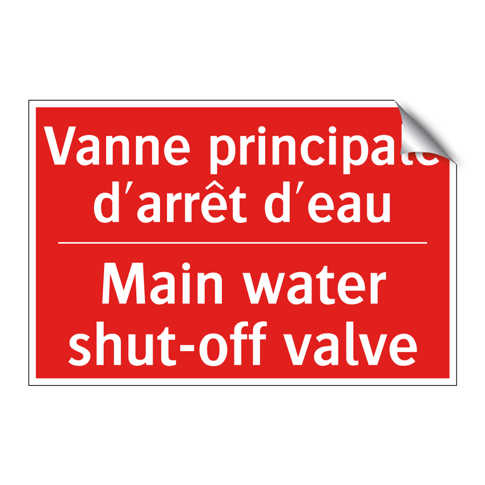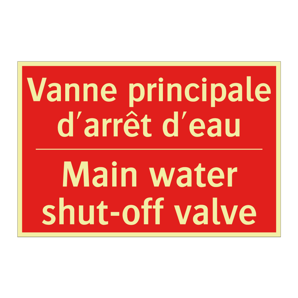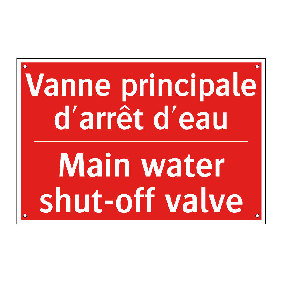 Panneau de signalisation incendie bilingue avec texte en français : "Vanne principale d'arrêt d'eau", et en anglais : "Main water shut-off valve"