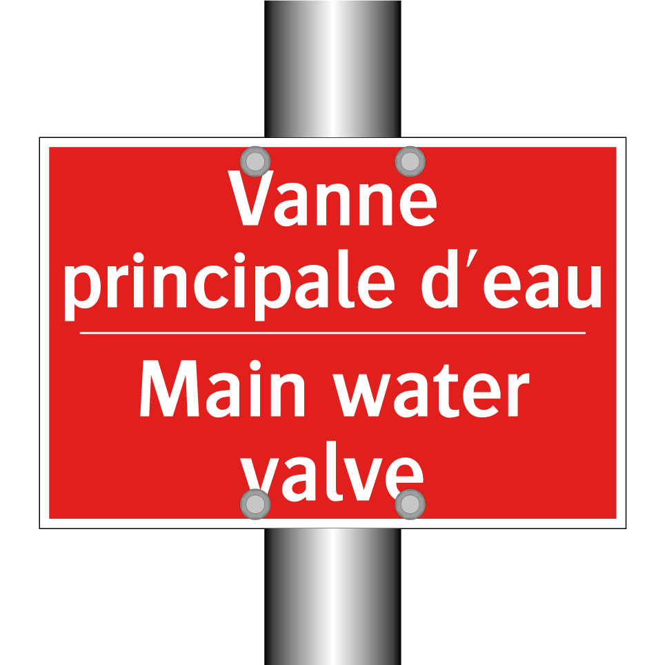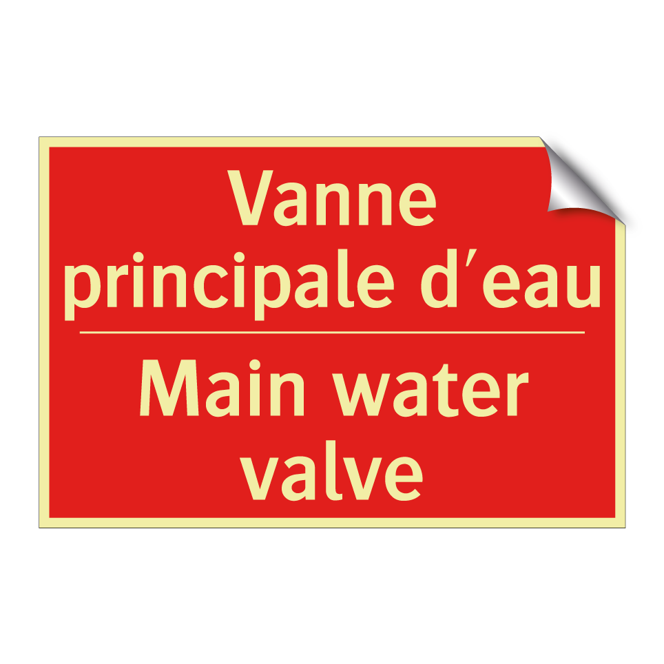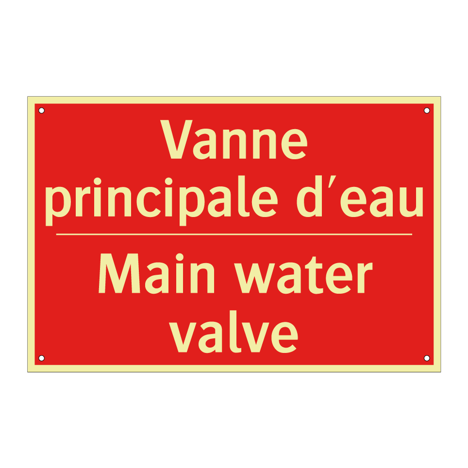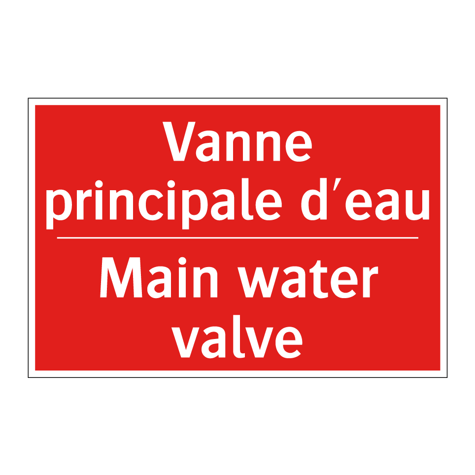 Panneau de signalisation incendie bilingue avec texte en français : "Vanne principale d'eau", et en anglais : "Main water valve"