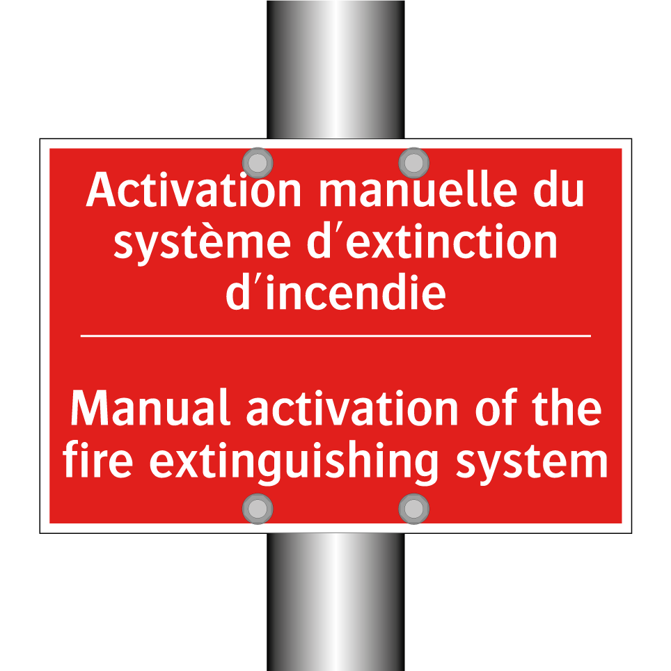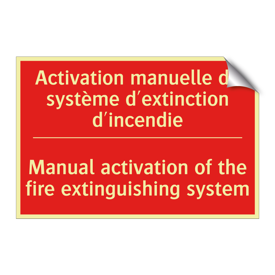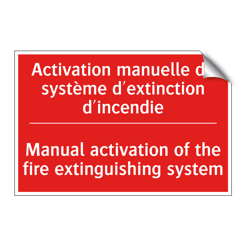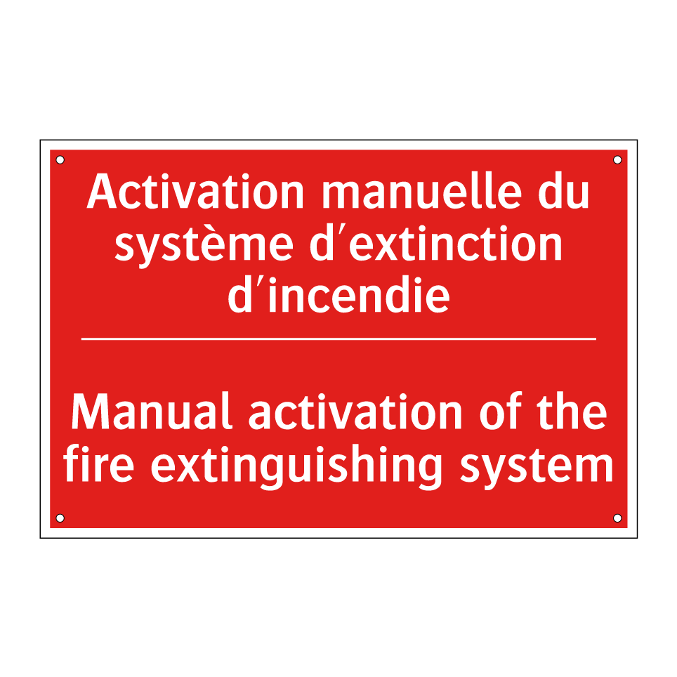 Panneau de signalisation incendie bilingue avec texte en français : "Activation manuelle du système d'extinction d'incendie", et en anglais : "Manual activation of the fire extinguishing system"