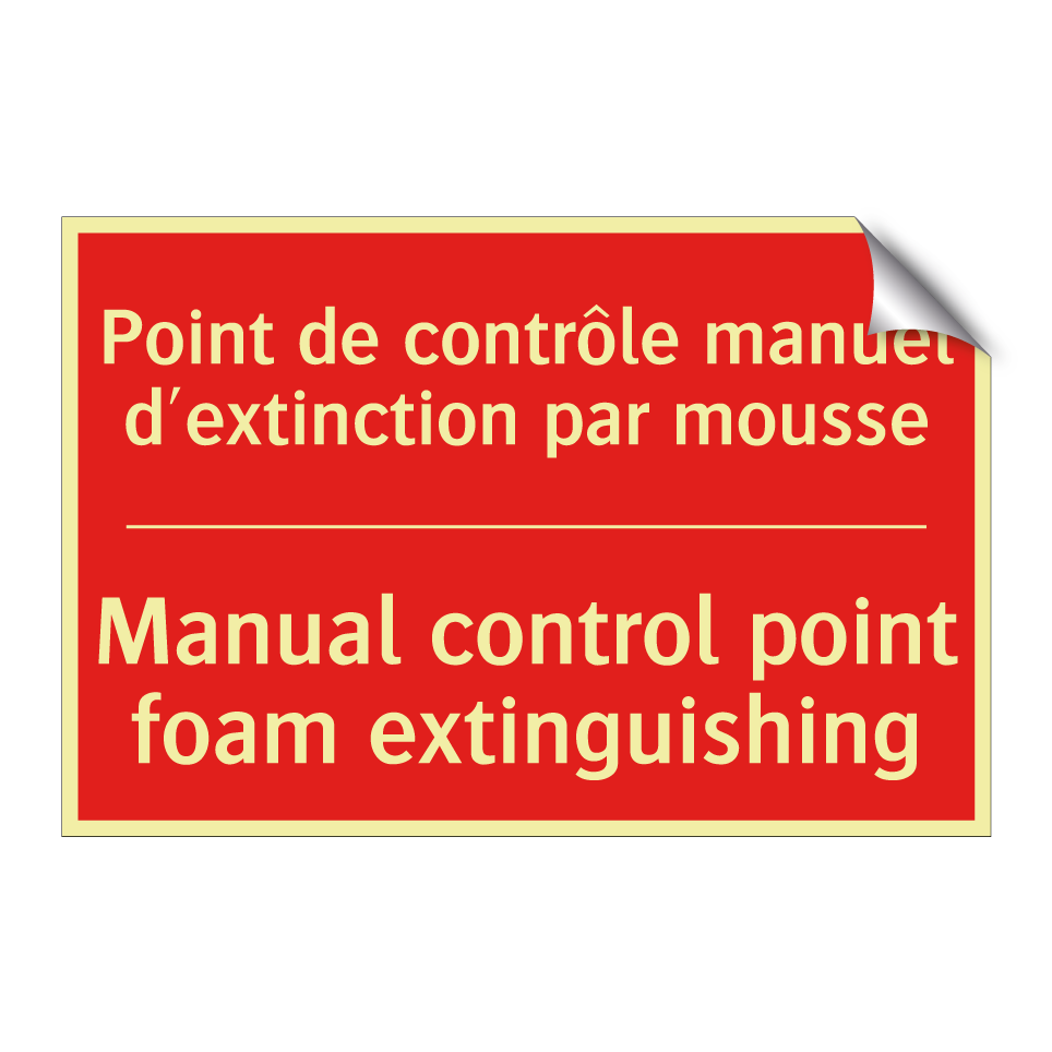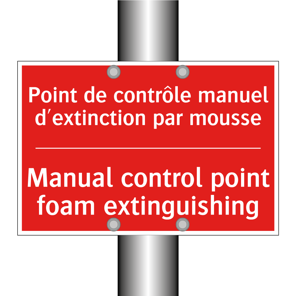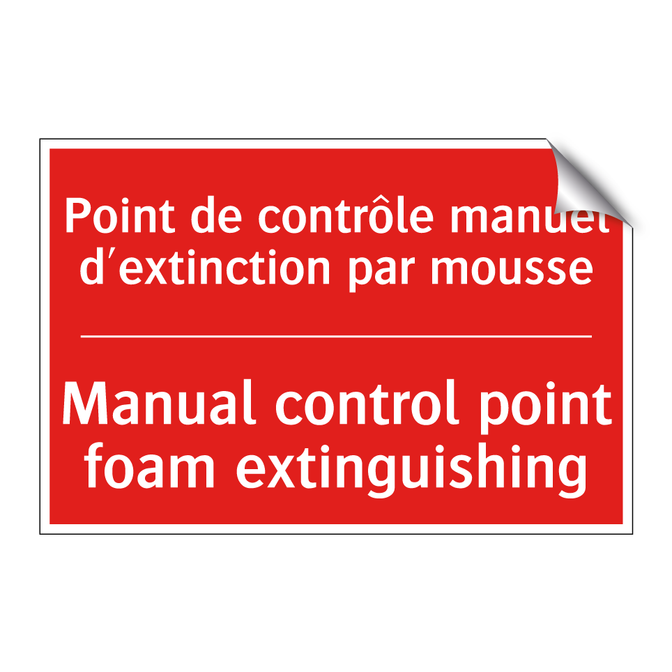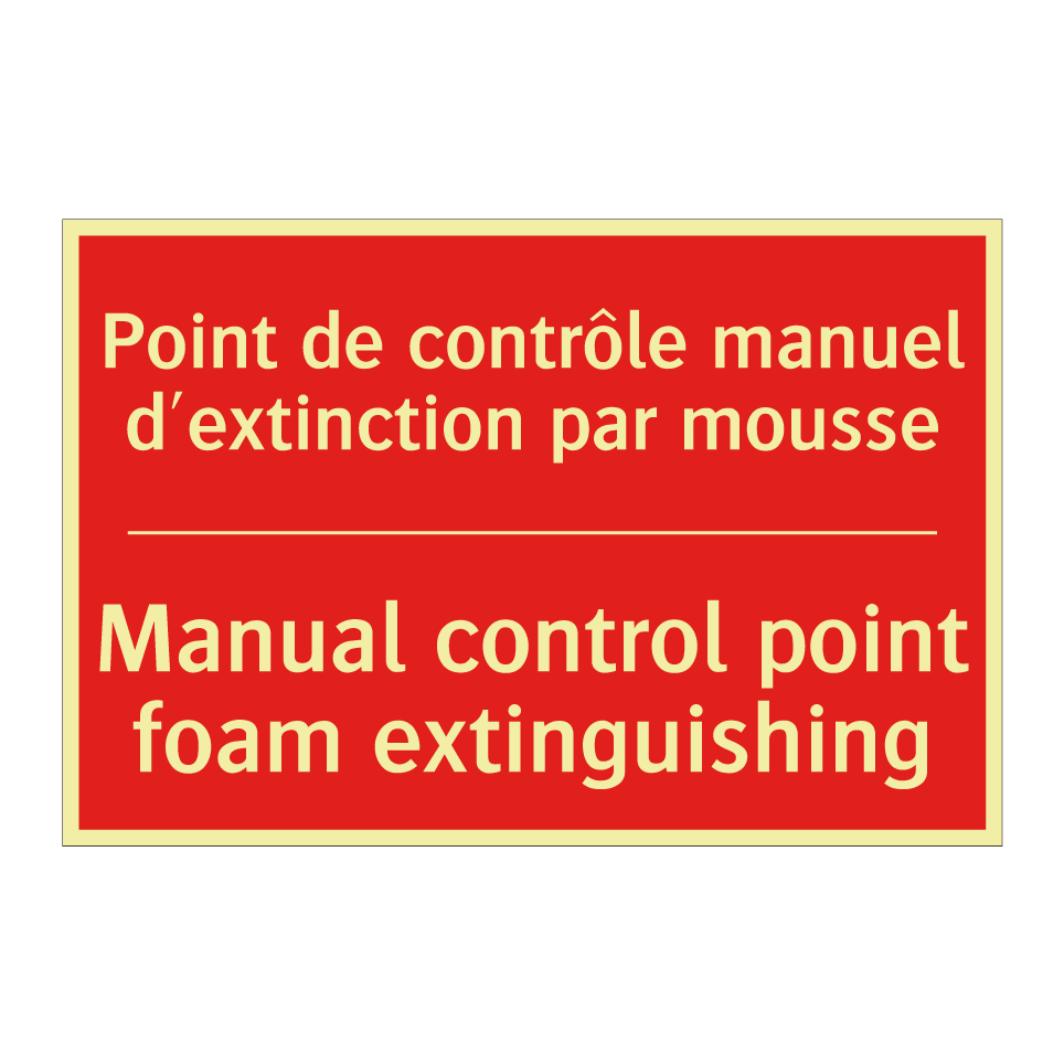 Panneau de signalisation incendie bilingue avec texte en français : "Point de contrôle manuel d'extinction par mousse", et en anglais : "Manual control point foam extinguishing"
