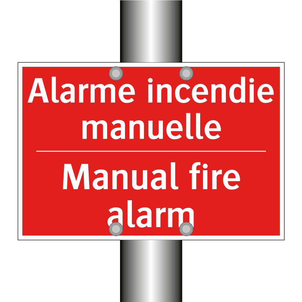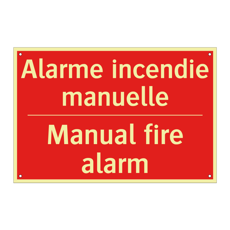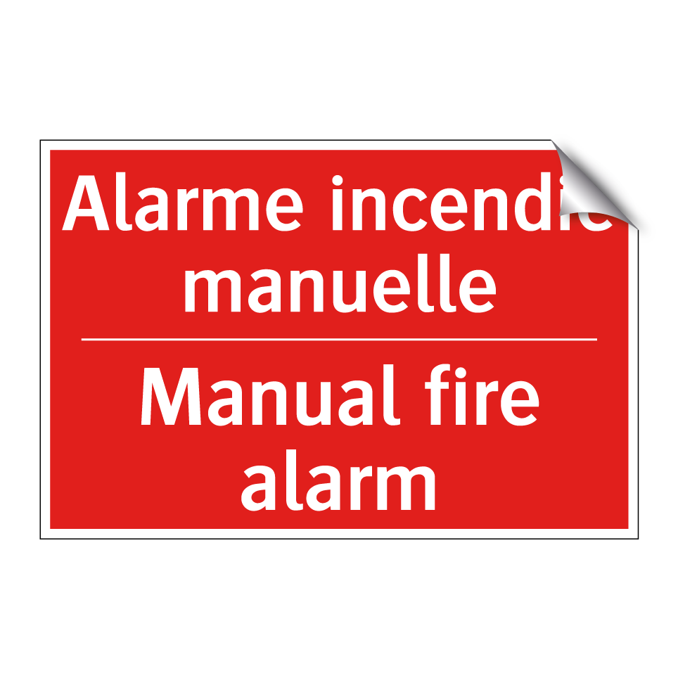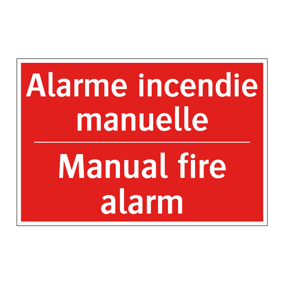 Panneau de signalisation incendie bilingue avec texte en français : "Alarme incendie manuelle", et en anglais : "Manual fire alarm"