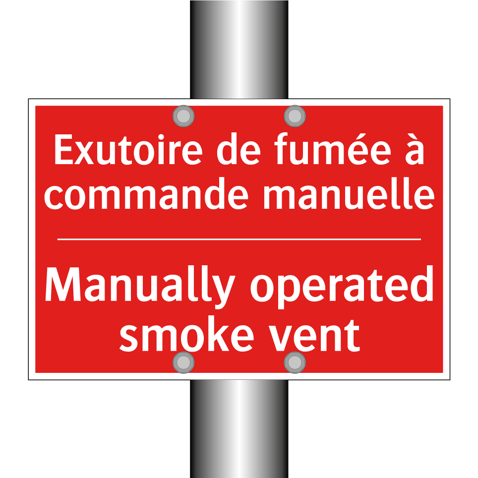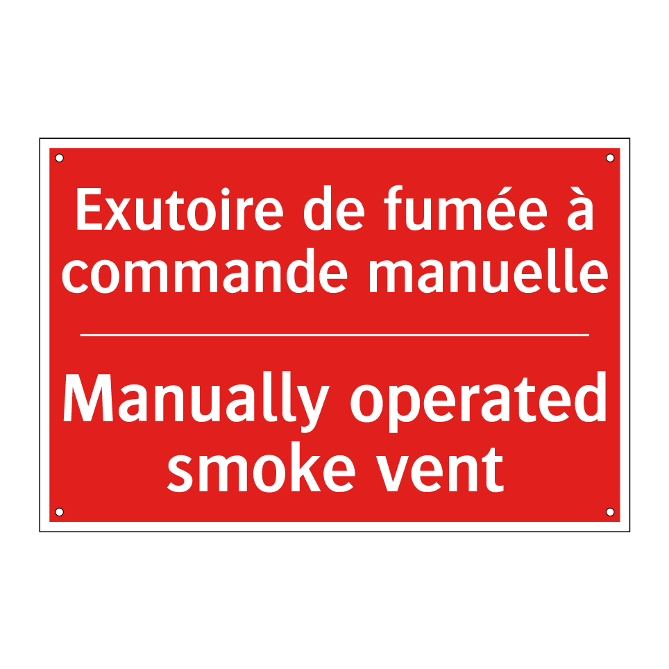 Panneau de signalisation incendie bilingue avec texte en français : "Exutoire de fumée à commande manuelle", et en anglais : "Manually operated smoke vent"