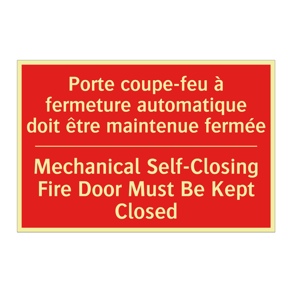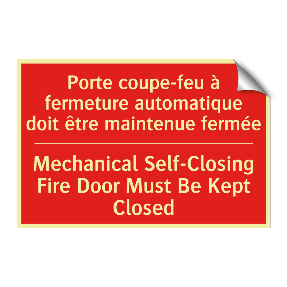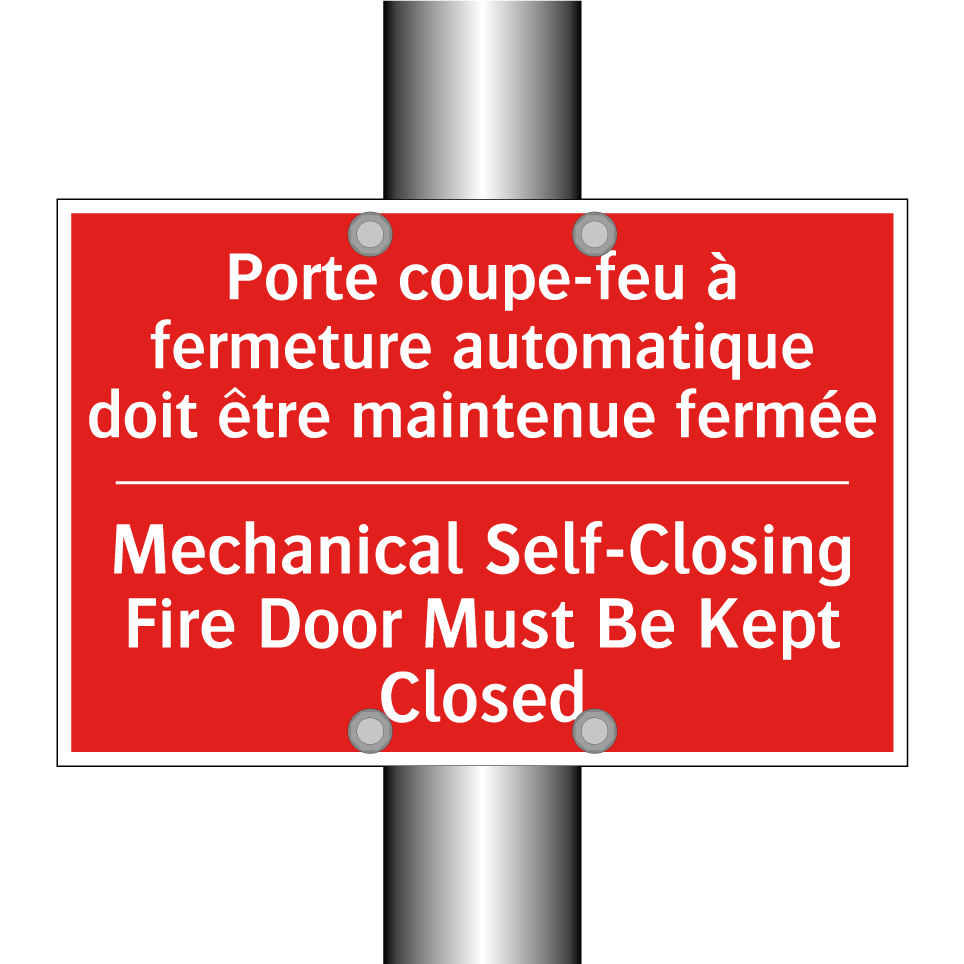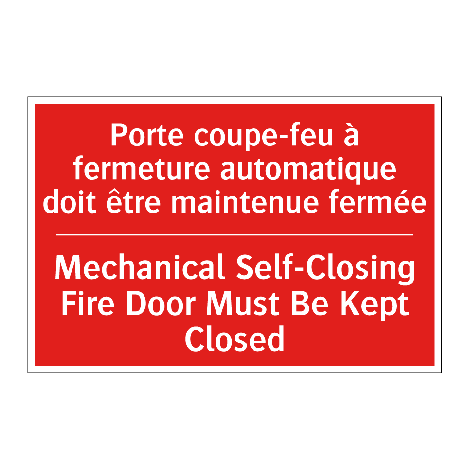 Panneau de signalisation incendie bilingue avec texte en français : "Porte coupe-feu à fermeture automatique doit être maintenue fermée", et en anglais : "Mechanical Self-Closing Fire Door Must Be Kept Closed"