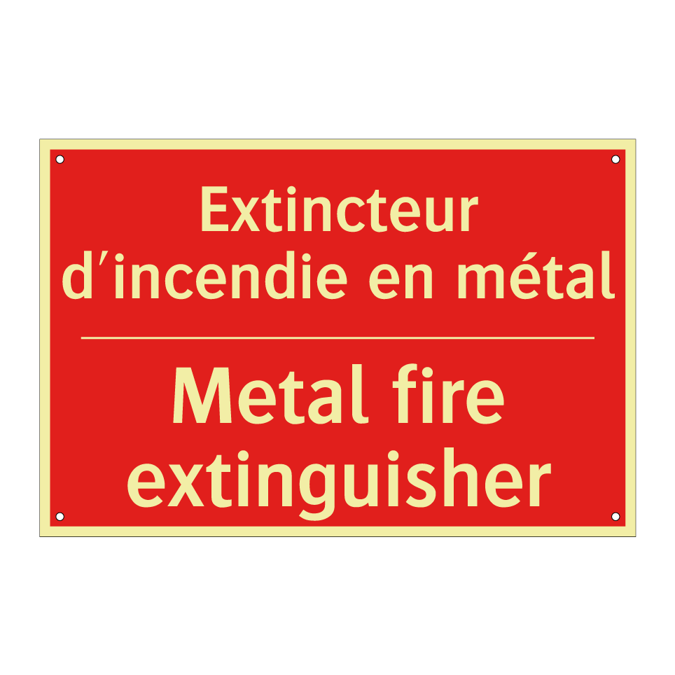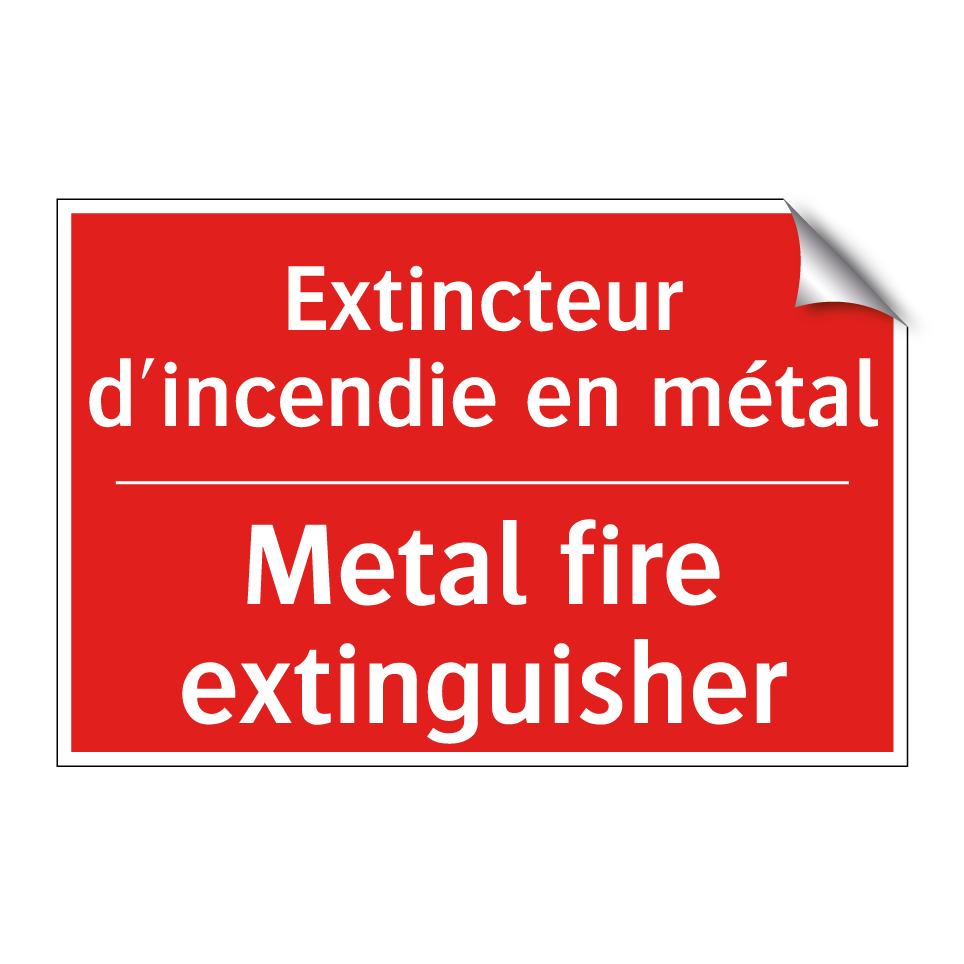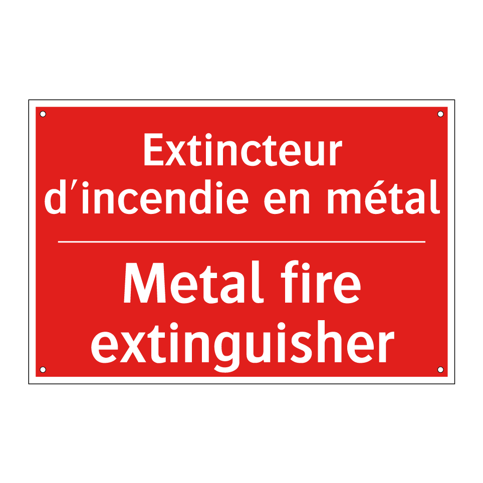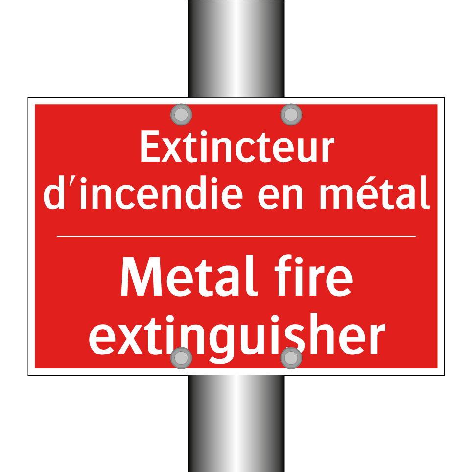 Panneau de signalisation incendie bilingue avec texte en français : "Extincteur d'incendie en métal", et en anglais : "Metal fire extinguisher"