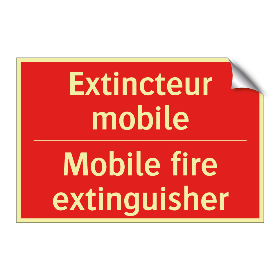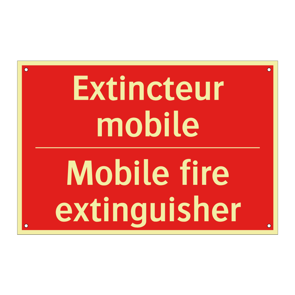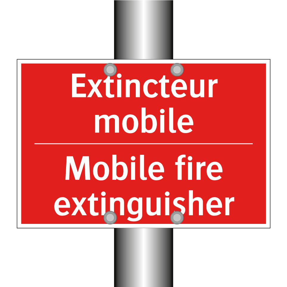 Panneau de signalisation incendie bilingue avec texte en français : "Extincteur mobile", et en anglais : "Mobile fire extinguisher"