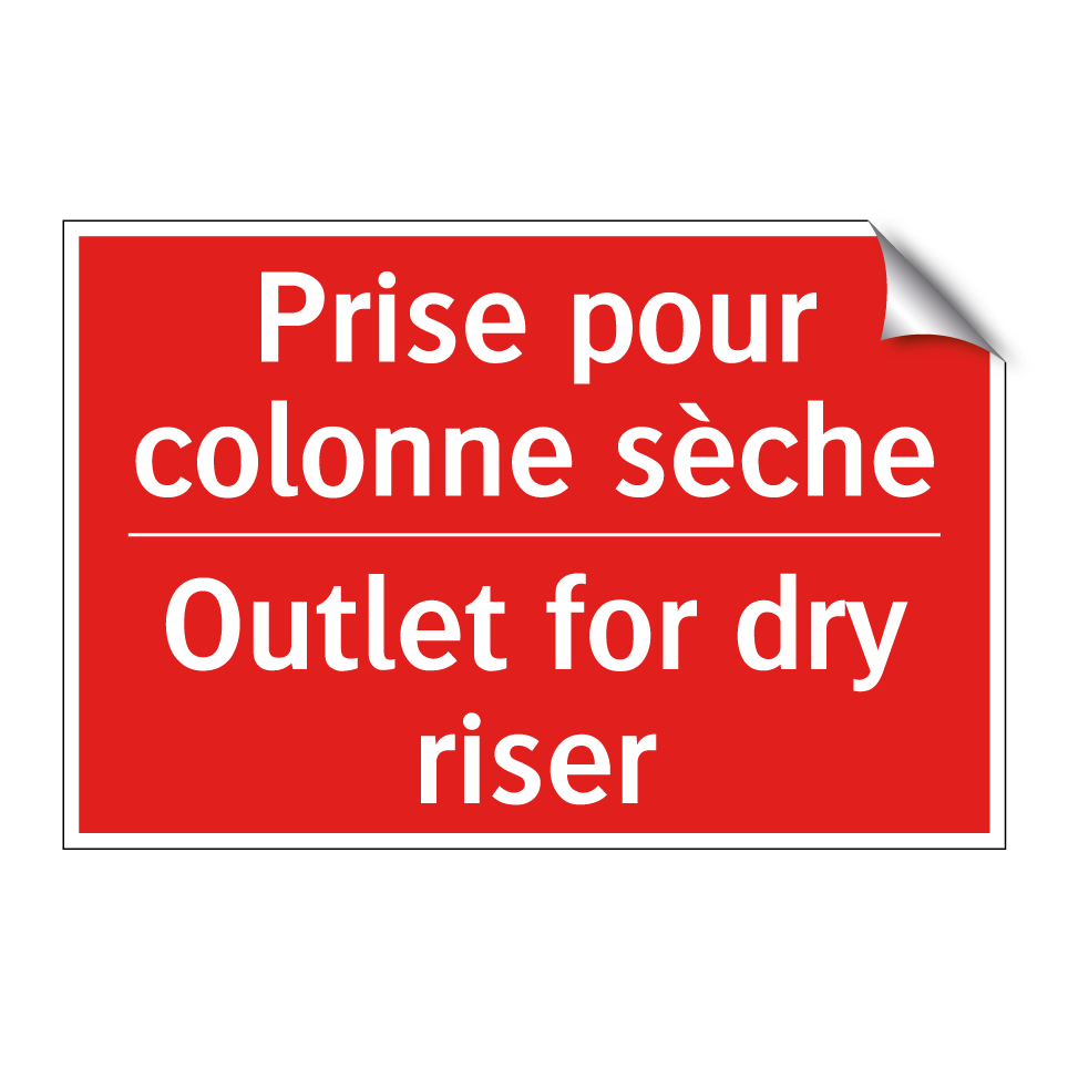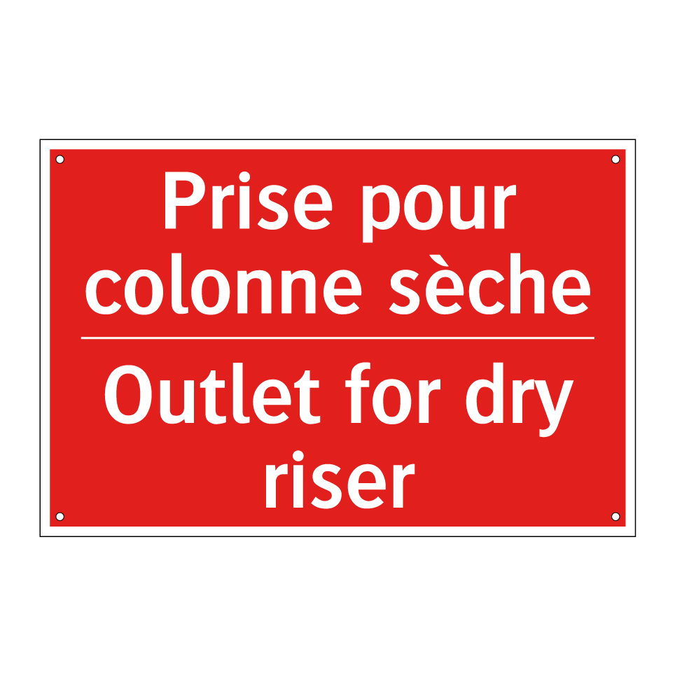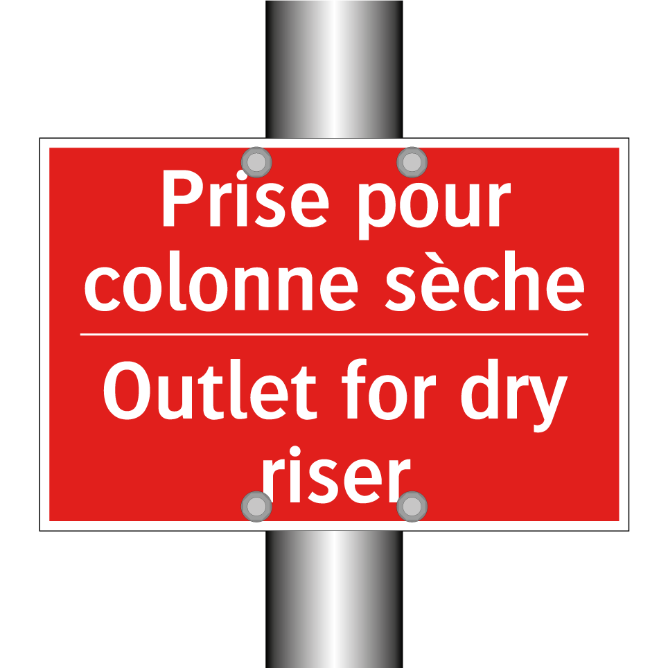Panneau de signalisation incendie bilingue avec texte en français : "Prise pour colonne sèche", et en anglais : "Outlet for dry riser"