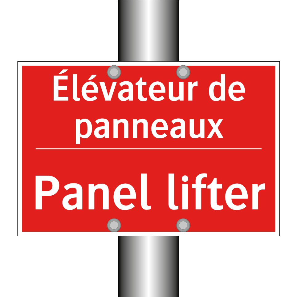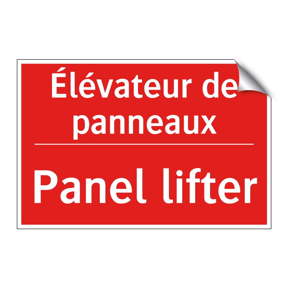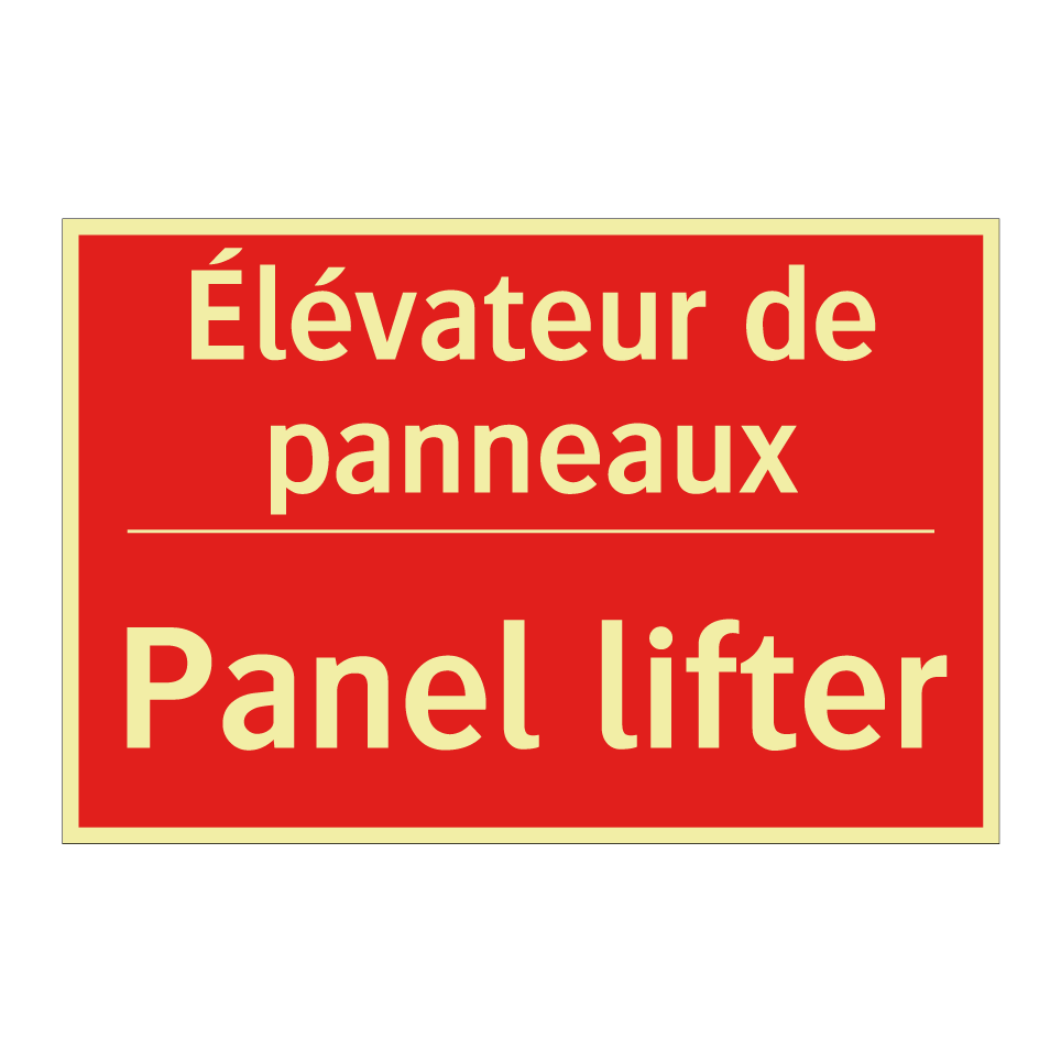 Panneau de signalisation incendie bilingue avec texte en français : "Élévateur de panneaux", et en anglais : "Panel lifter"