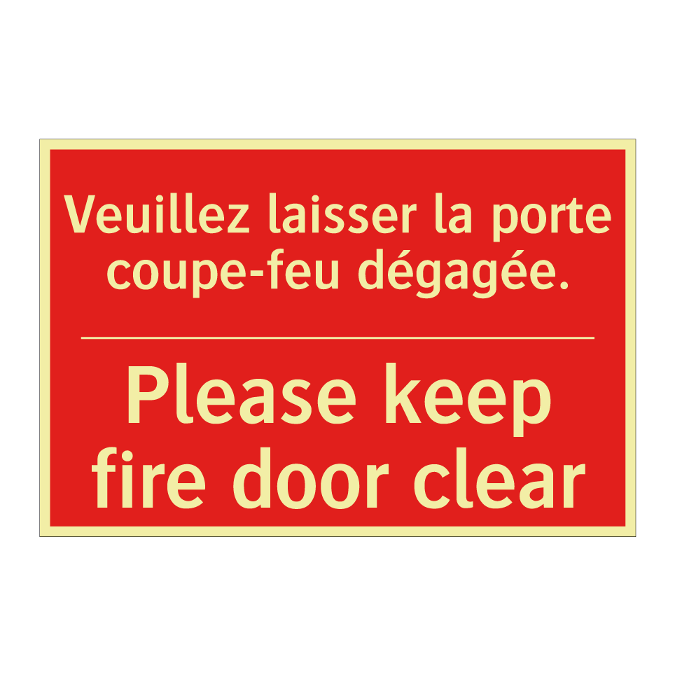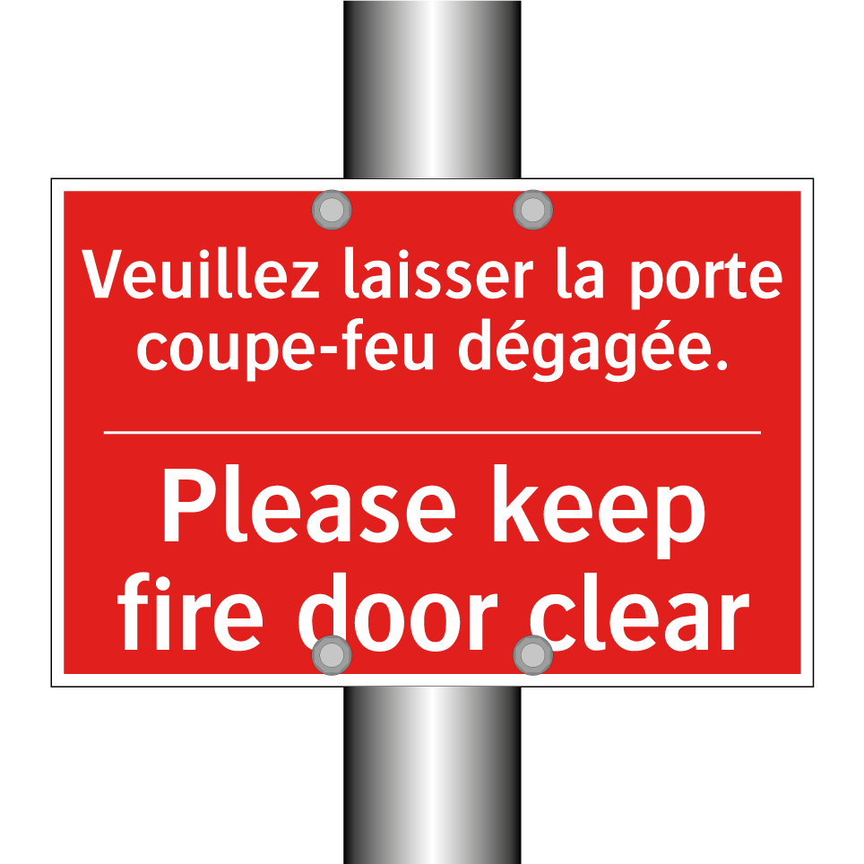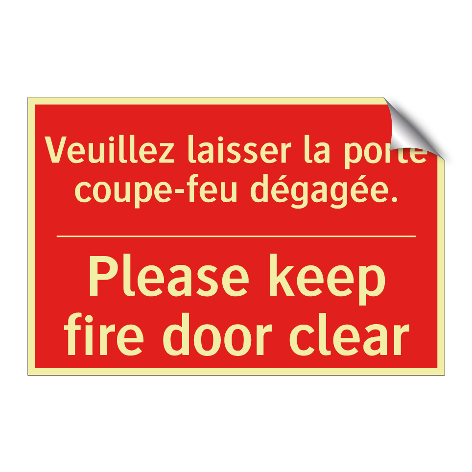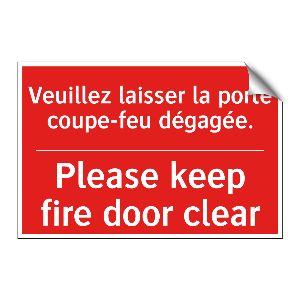 Panneau de signalisation incendie bilingue avec texte en français : "Veuillez laisser la porte coupe-feu dégagée.", et en anglais : "Please keep fire door clear"