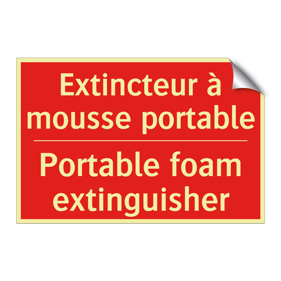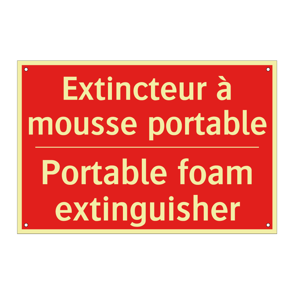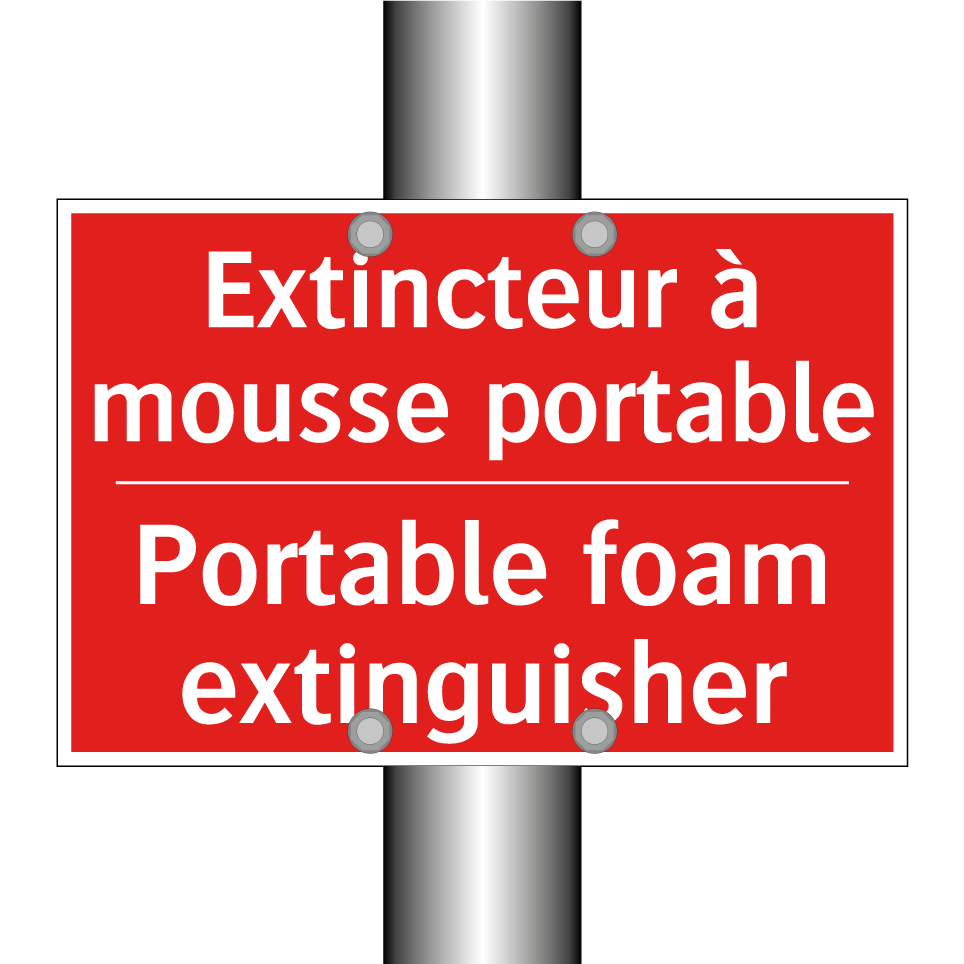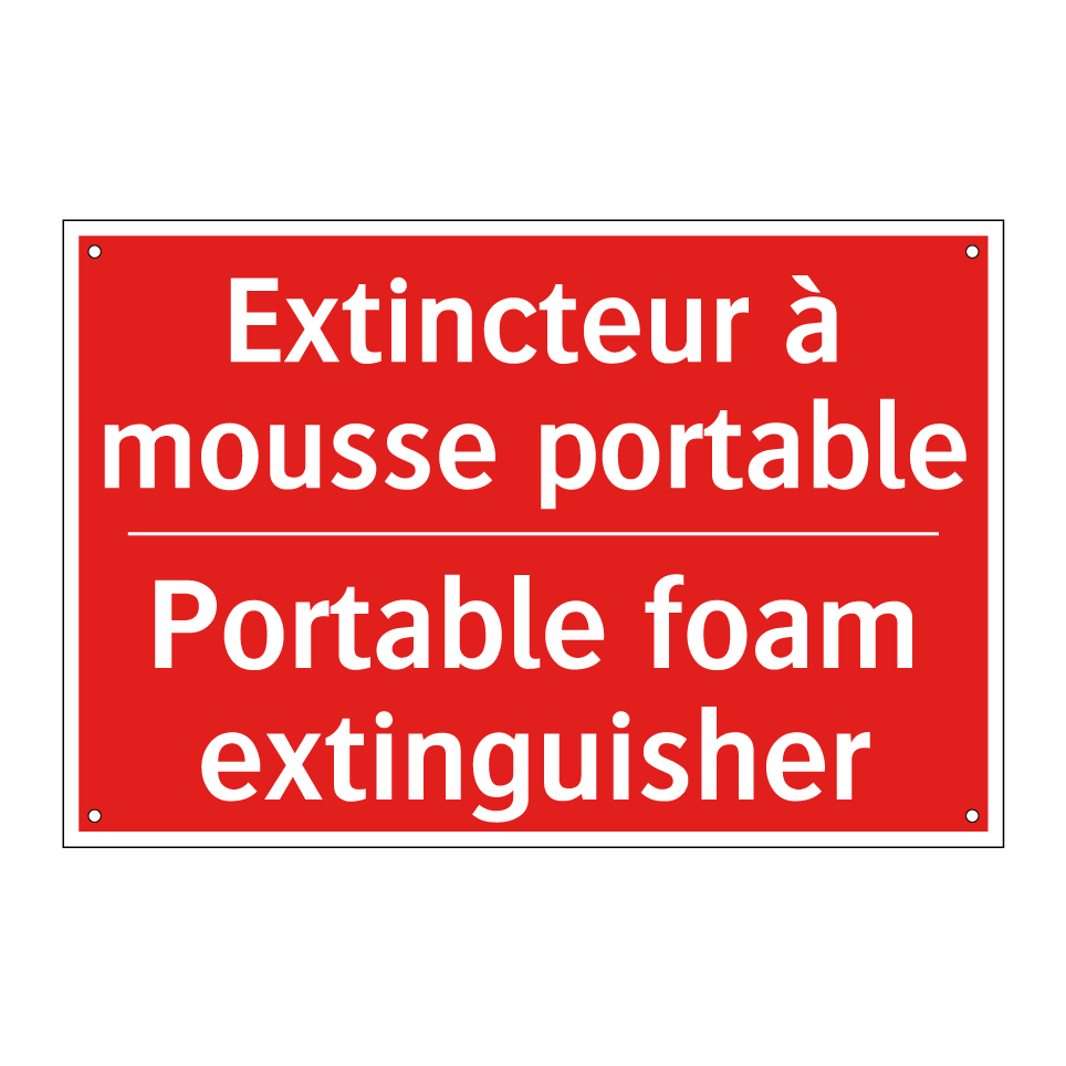 Panneau de signalisation incendie bilingue avec texte en français : "Extincteur à mousse portable", et en anglais : "Portable foam extinguisher"