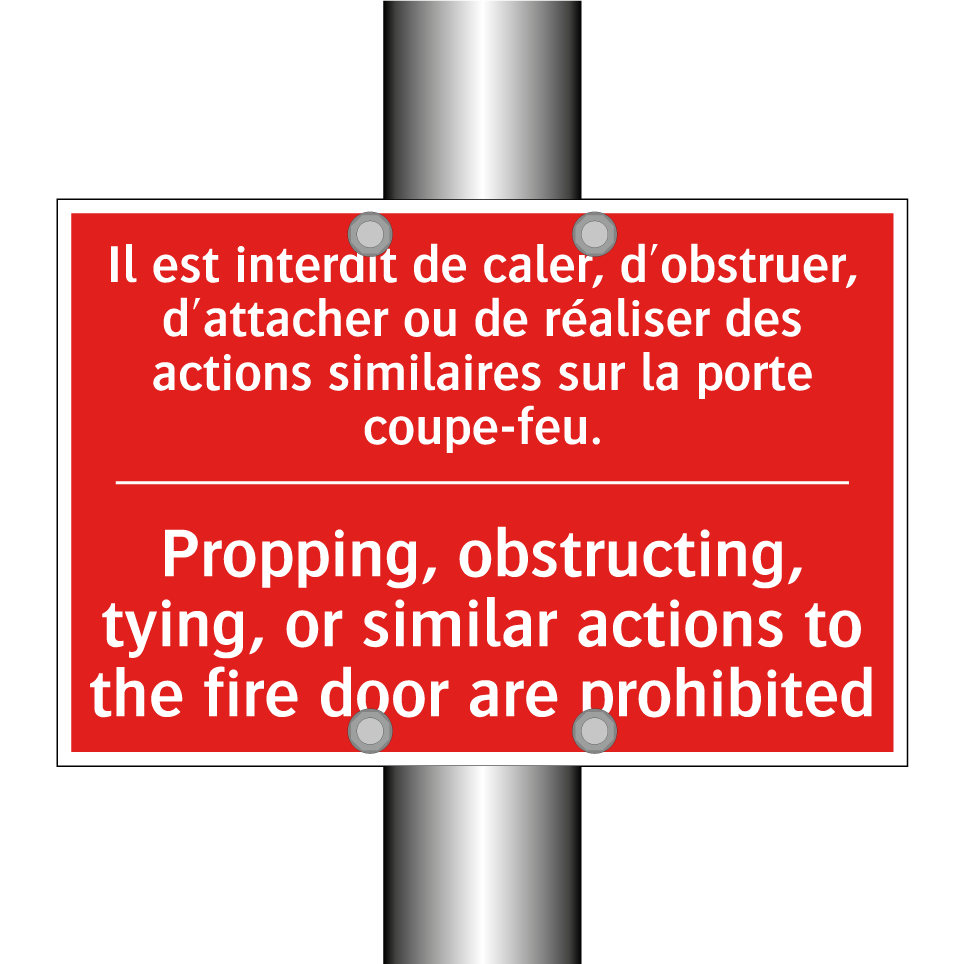 Panneau de signalisation incendie bilingue avec texte en français : "Il est interdit de caler, d'obstruer, d'attacher ou de réaliser des actions similaires sur la porte coupe-feu.", et en anglais : "Propping, obstructing, tying, or similar actions to the fire door are prohibited"
