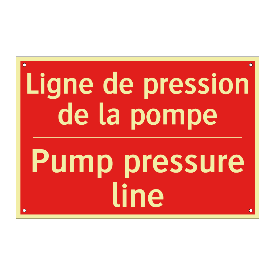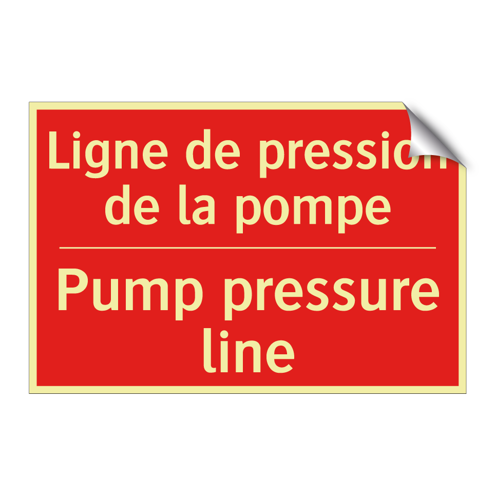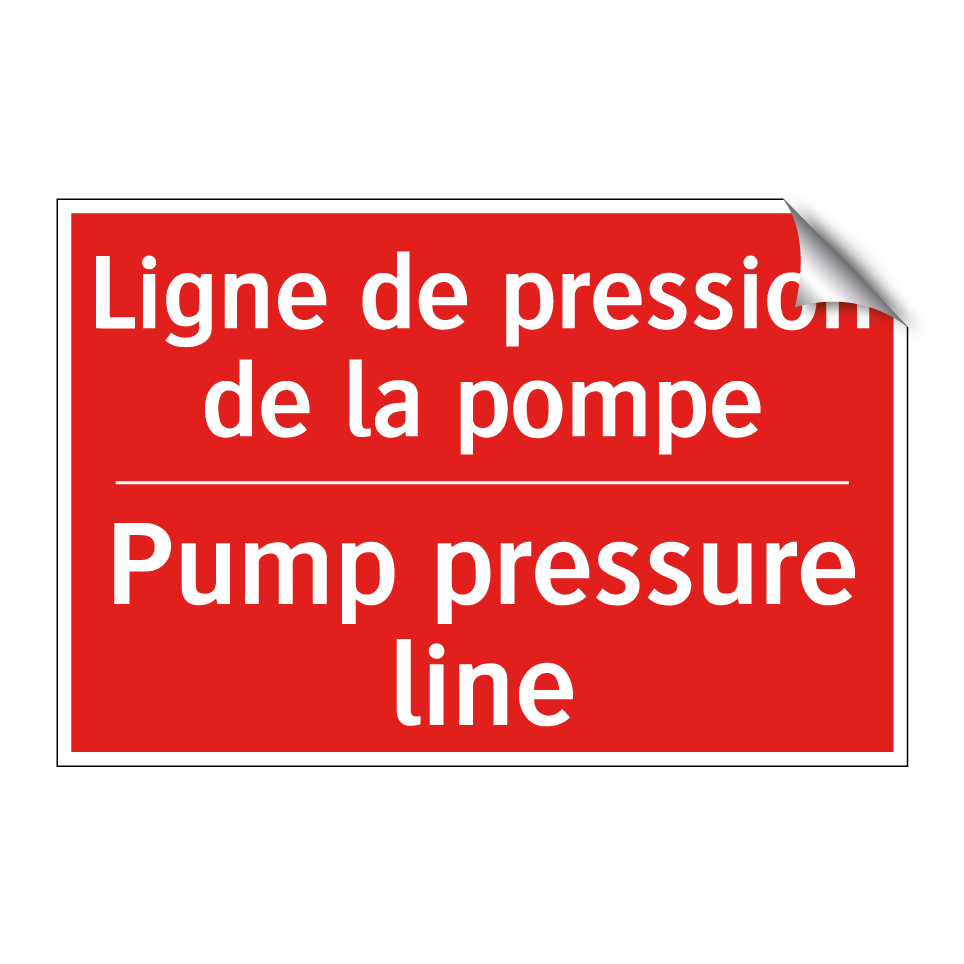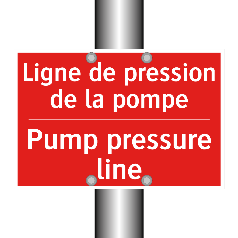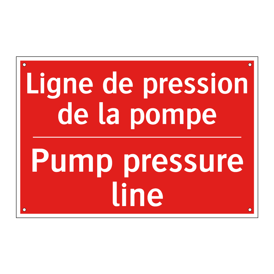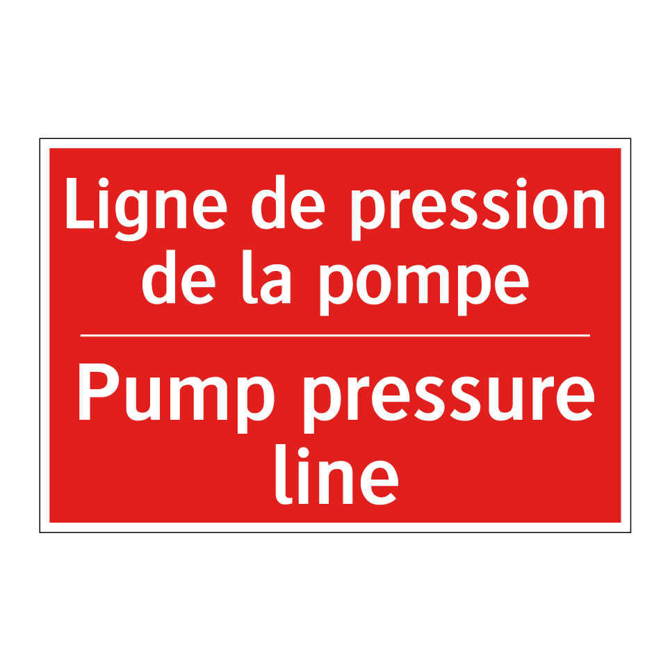 Panneau de signalisation incendie bilingue avec texte en français : "Ligne de pression de la pompe", et en anglais : "Pump pressure line"