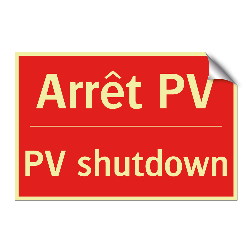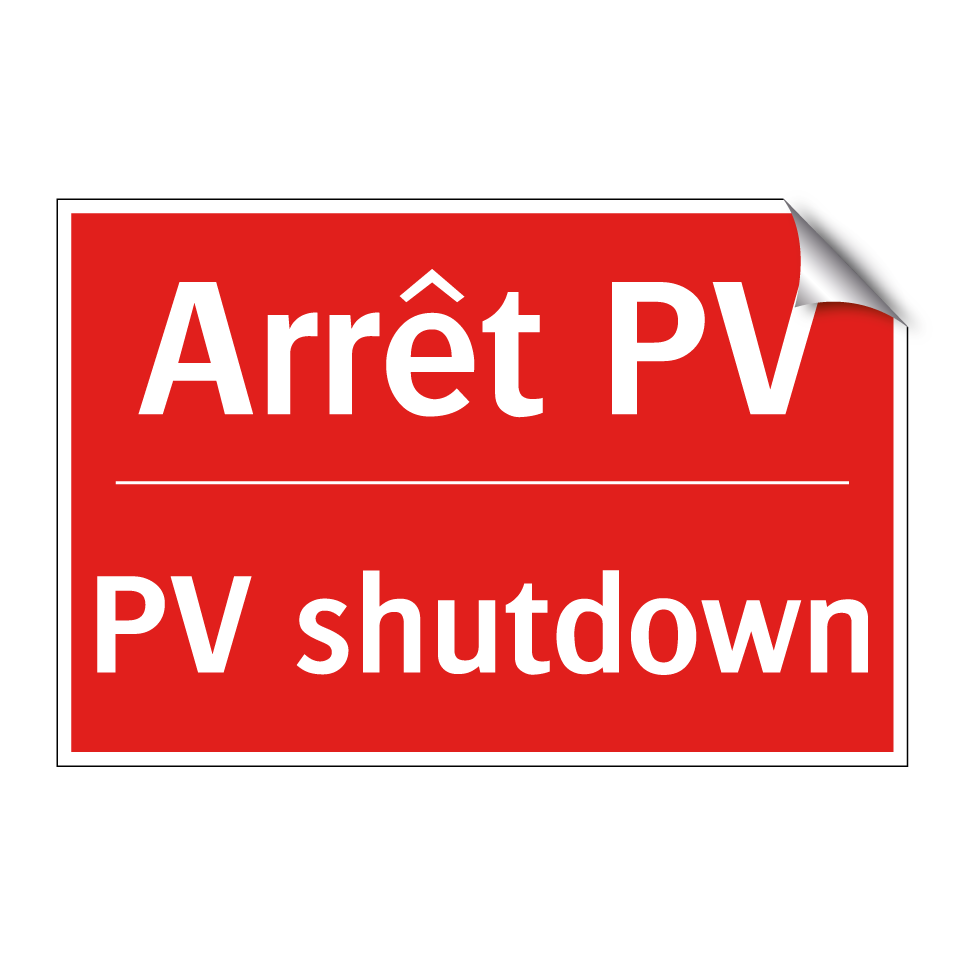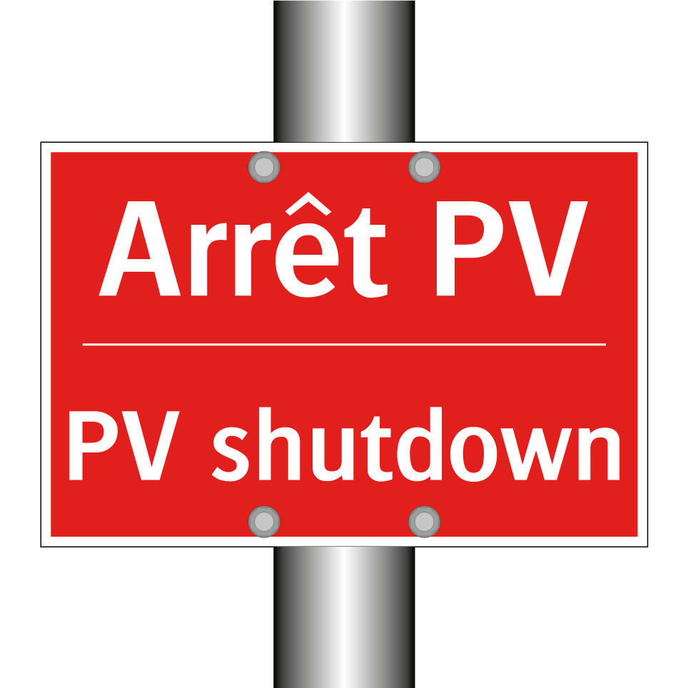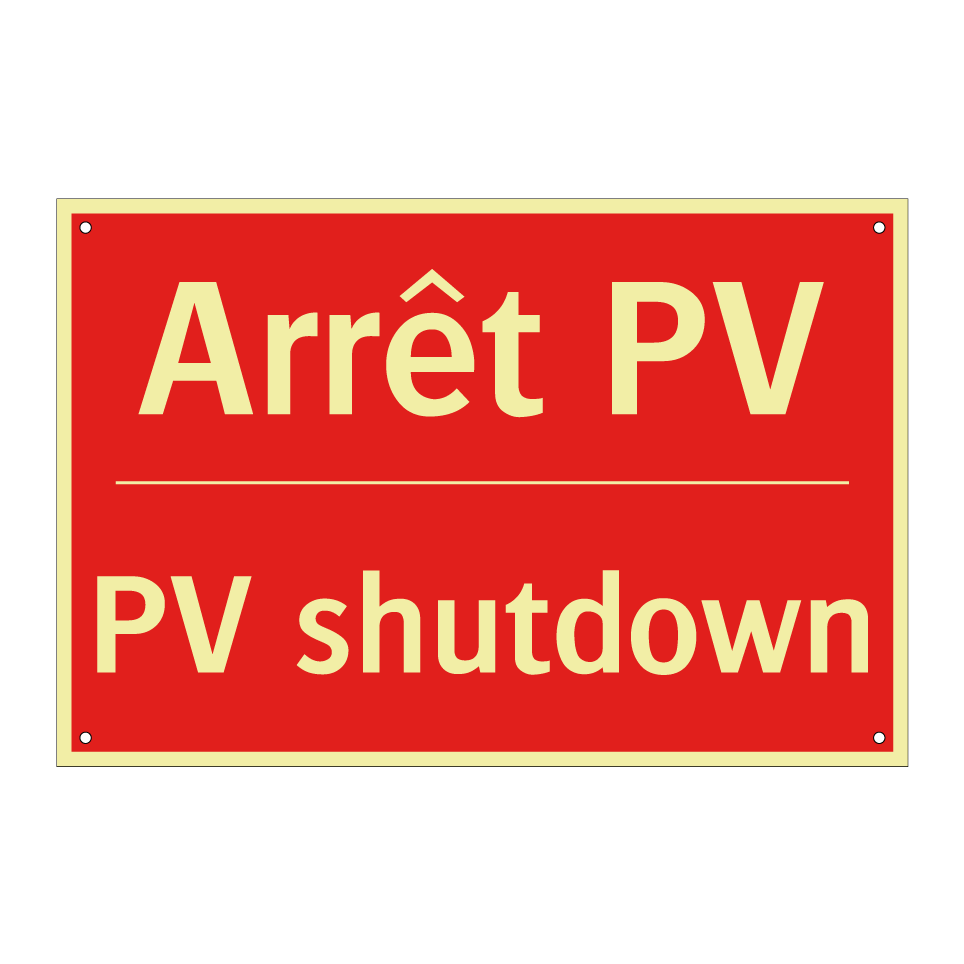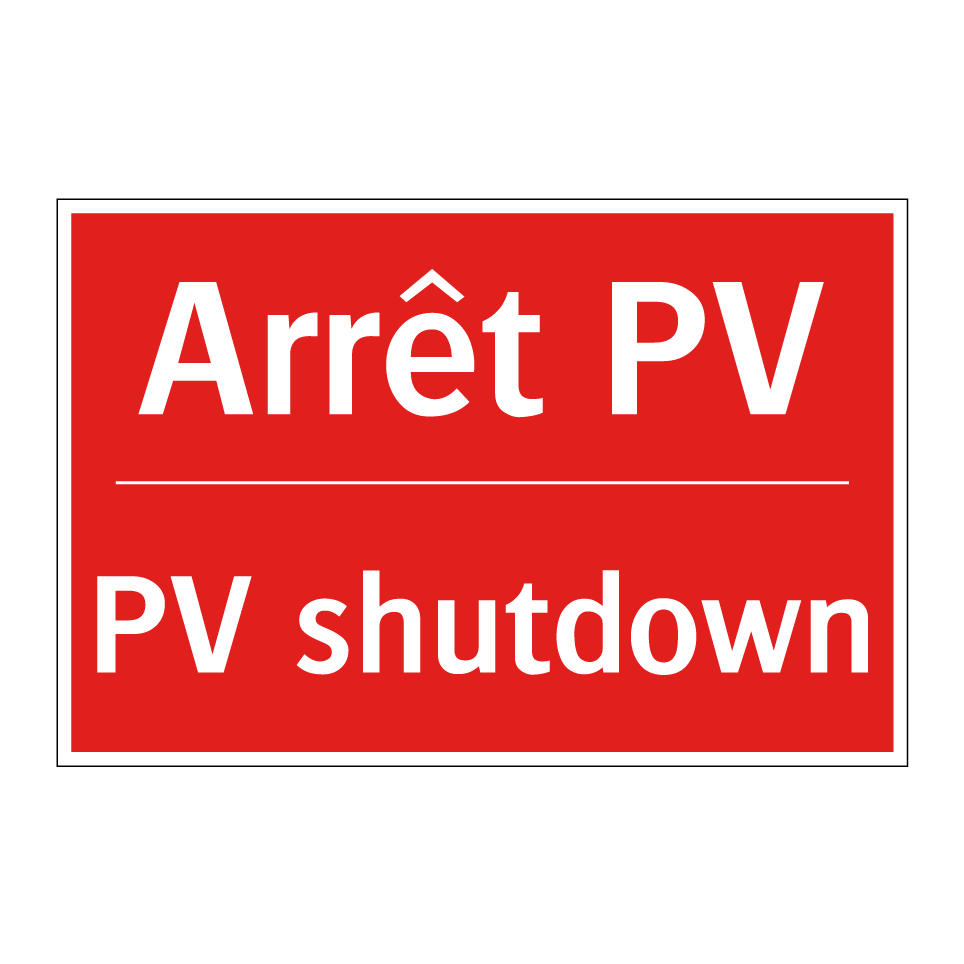Panneau de signalisation incendie bilingue avec texte en français : "Arrêt PV", et en anglais : "PV shutdown"