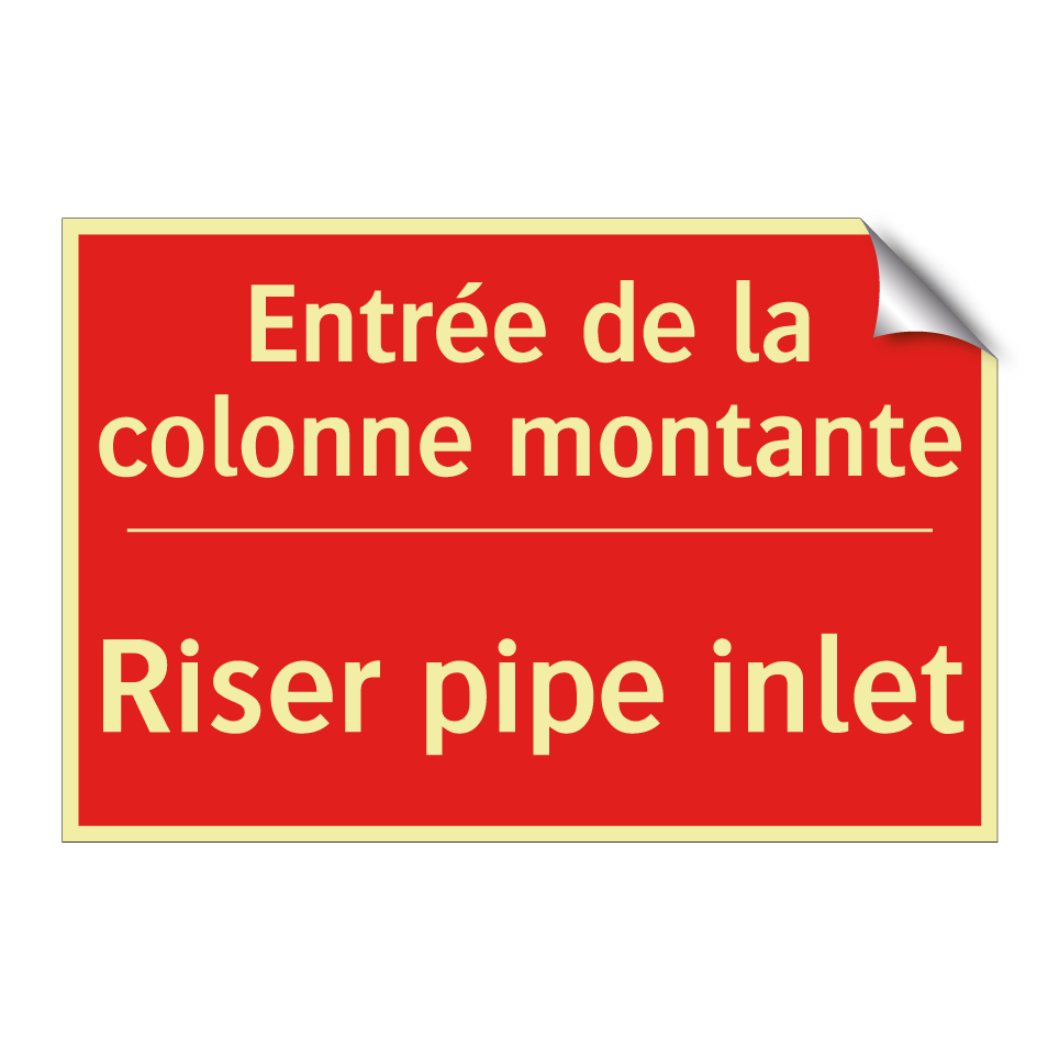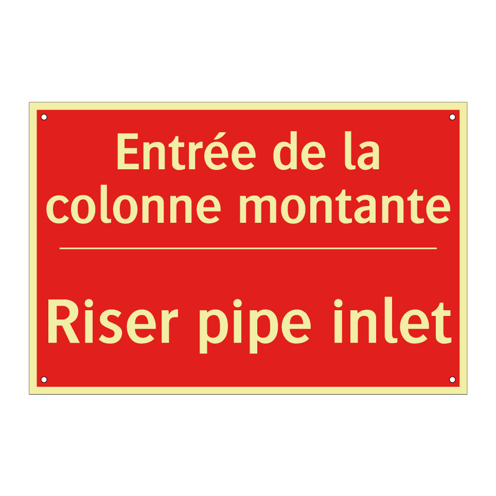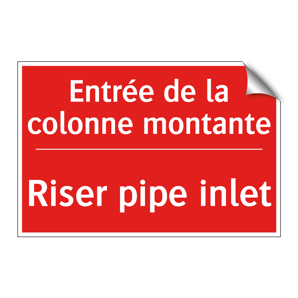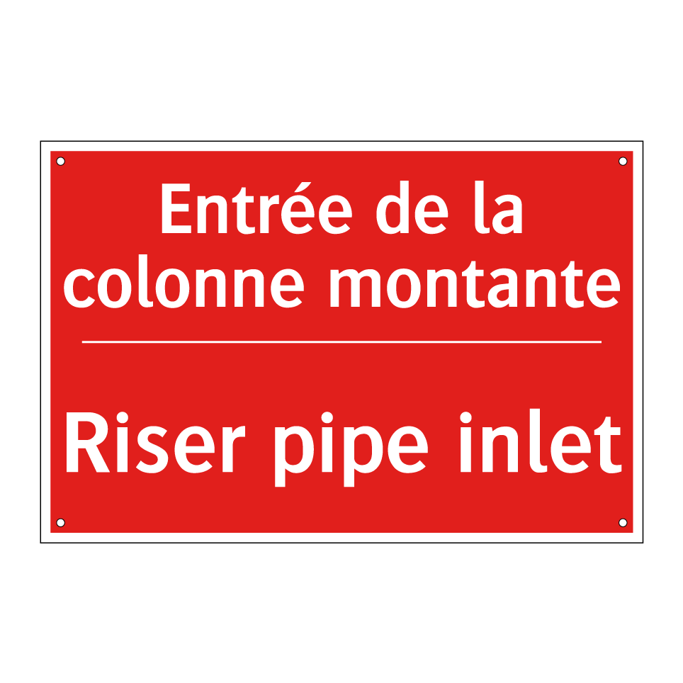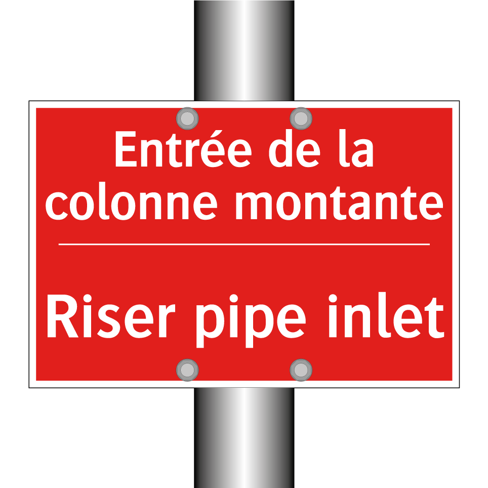 Panneau de signalisation incendie bilingue avec texte en français : "Entrée de la colonne montante", et en anglais : "Riser pipe inlet"