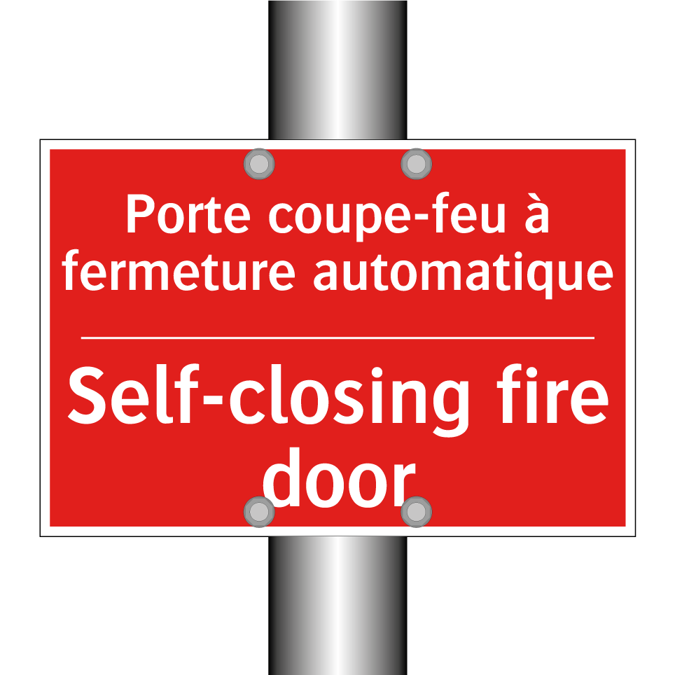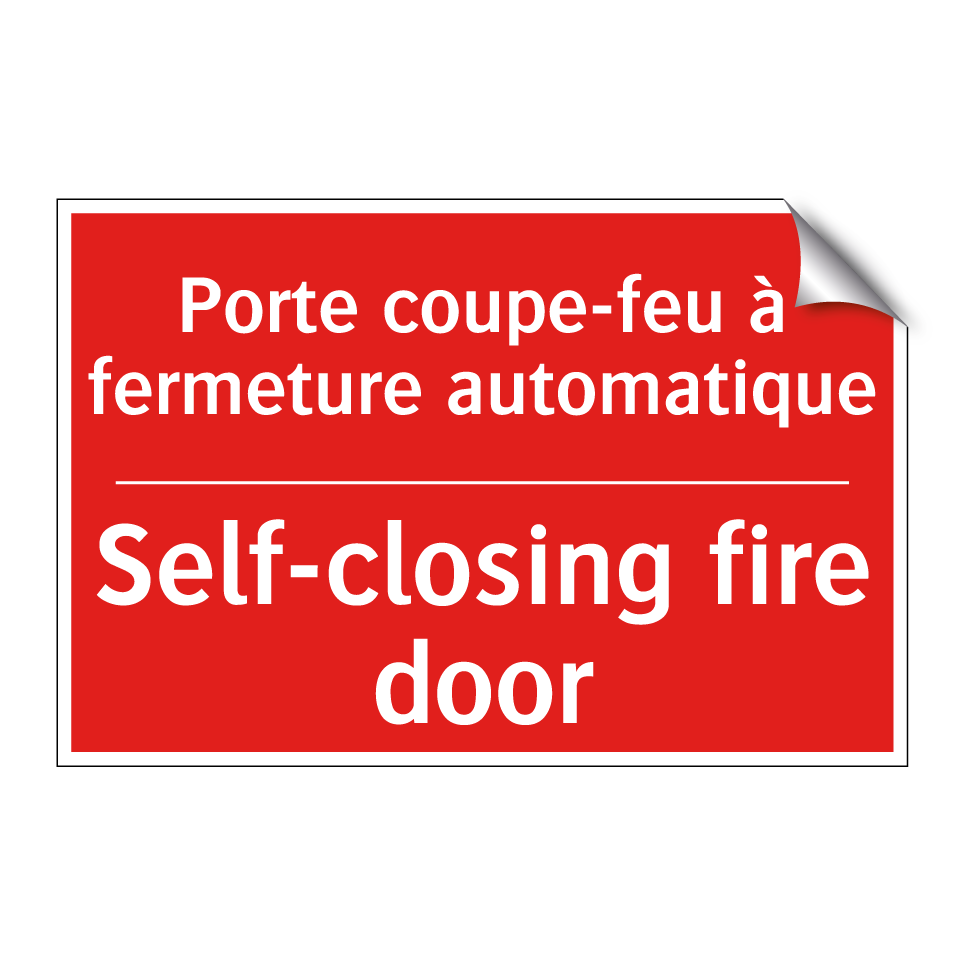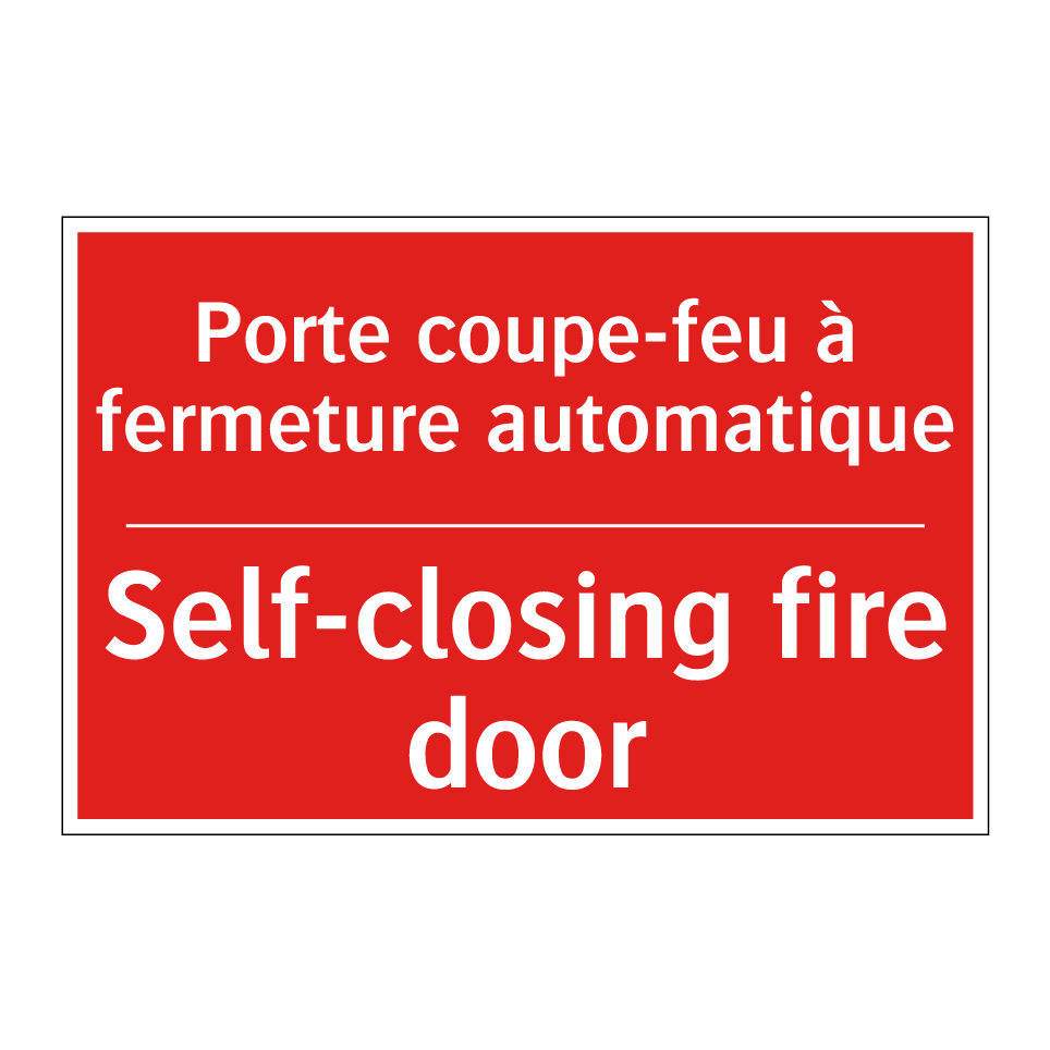 Panneau de signalisation incendie bilingue avec texte en français : "Porte coupe-feu à fermeture automatique", et en anglais : "Self-closing fire door"